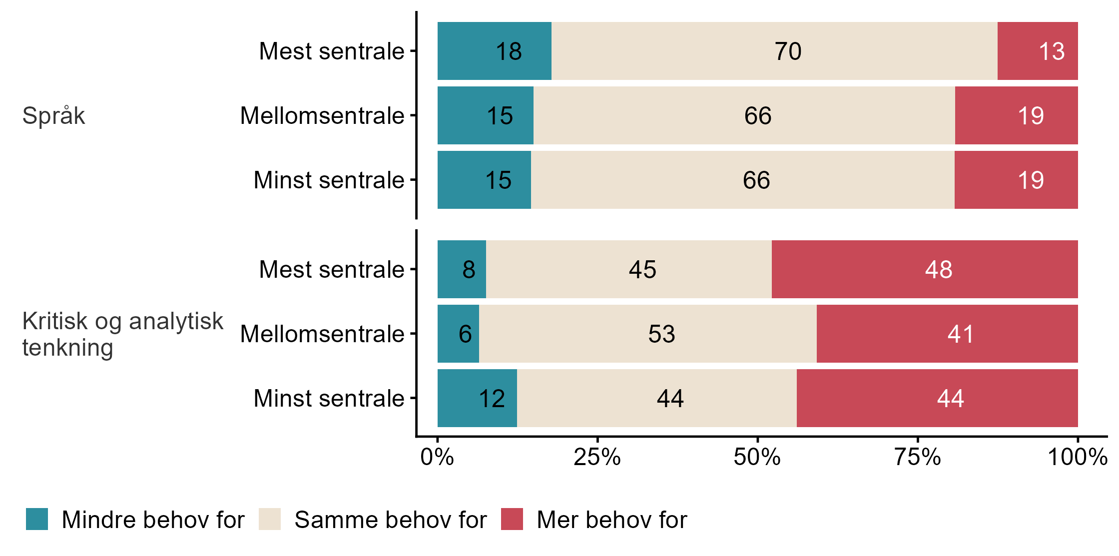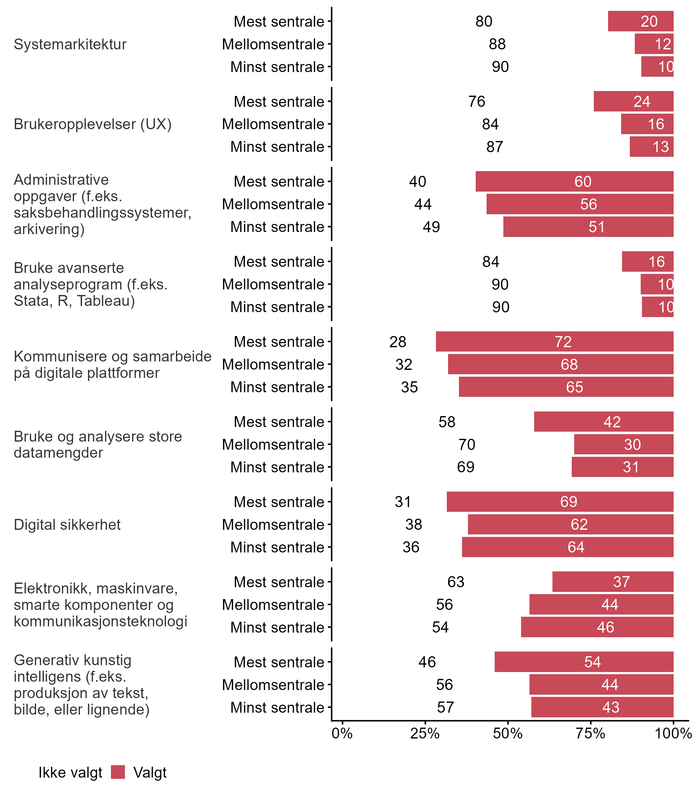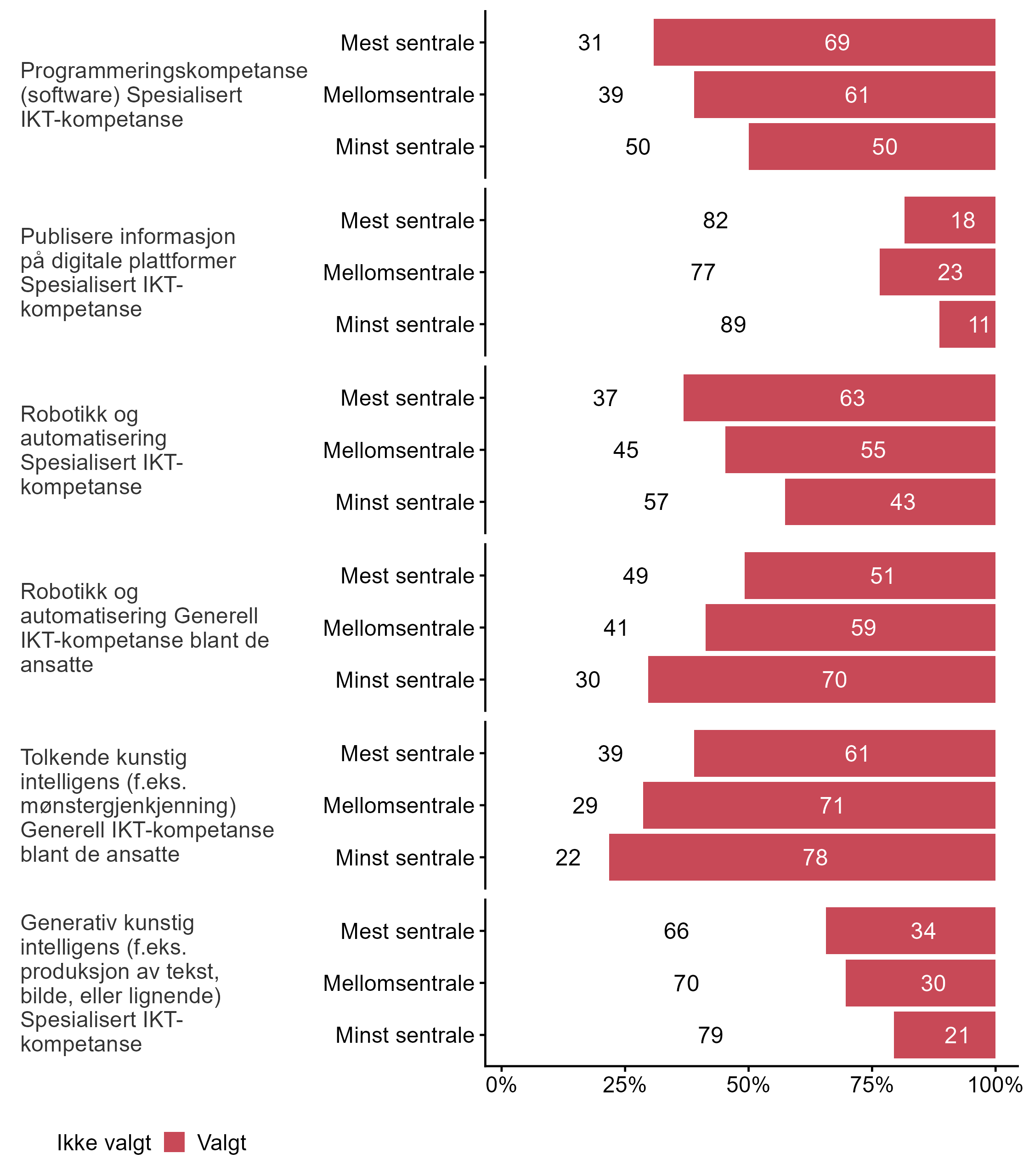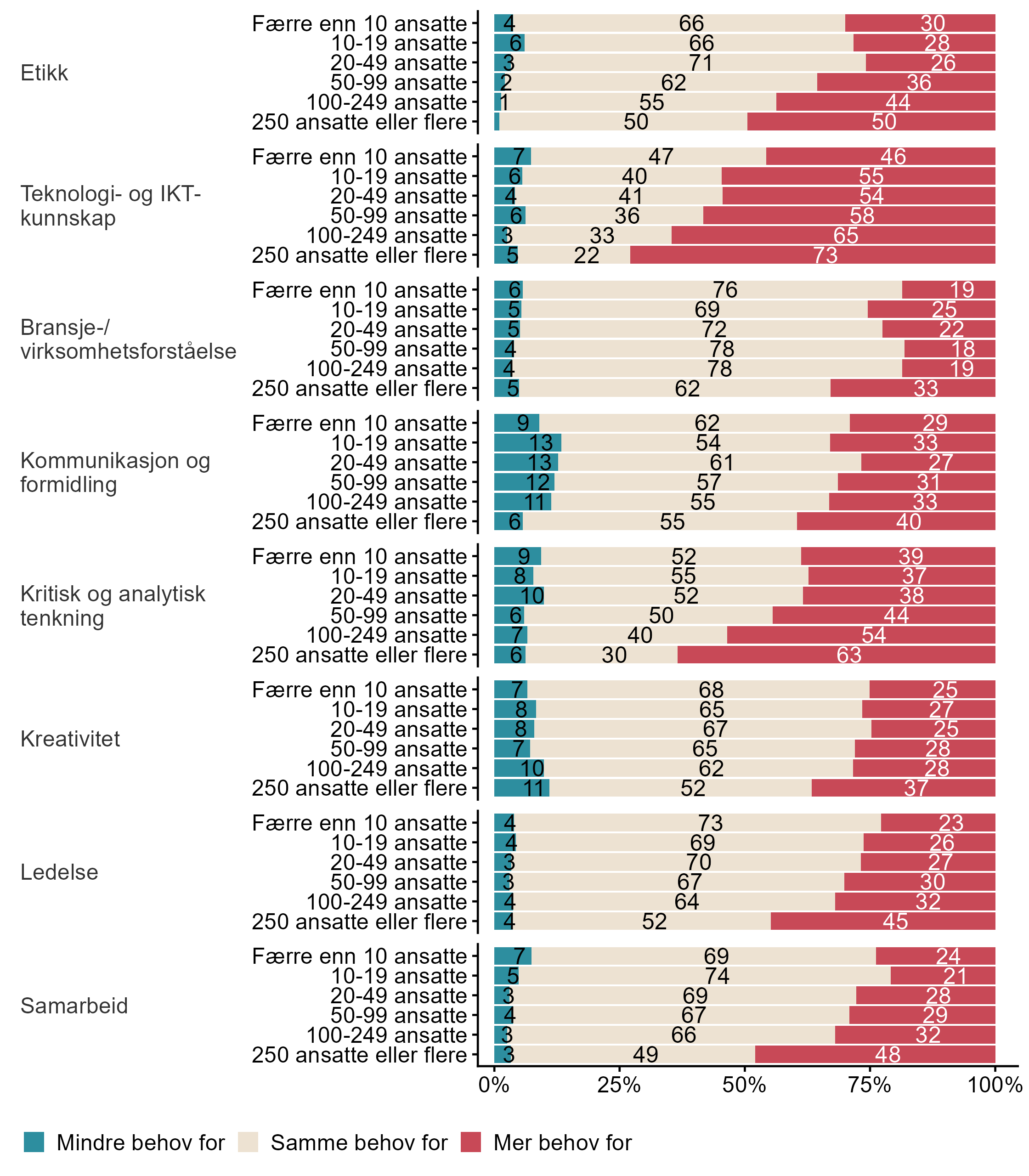 I figur 20 viser vi fordelingen av svar på om utviklingen av digital teknologi gir større eller mindre behov for kunnskaper og ferdigheter. Figur 21 viser andel svar brutt ned på bedriftsstørrelse og figur 22 viser andel svar fordelt på sentralitet.
