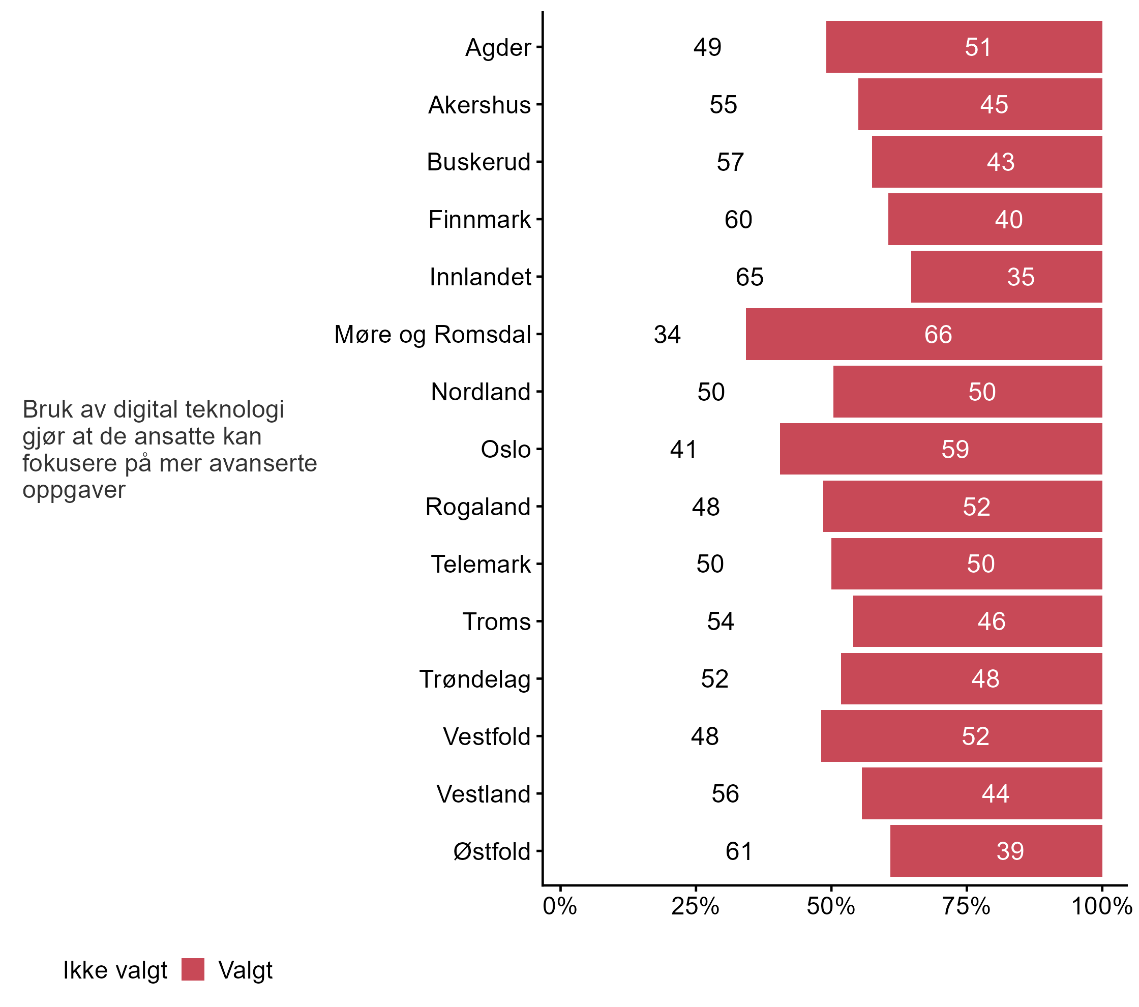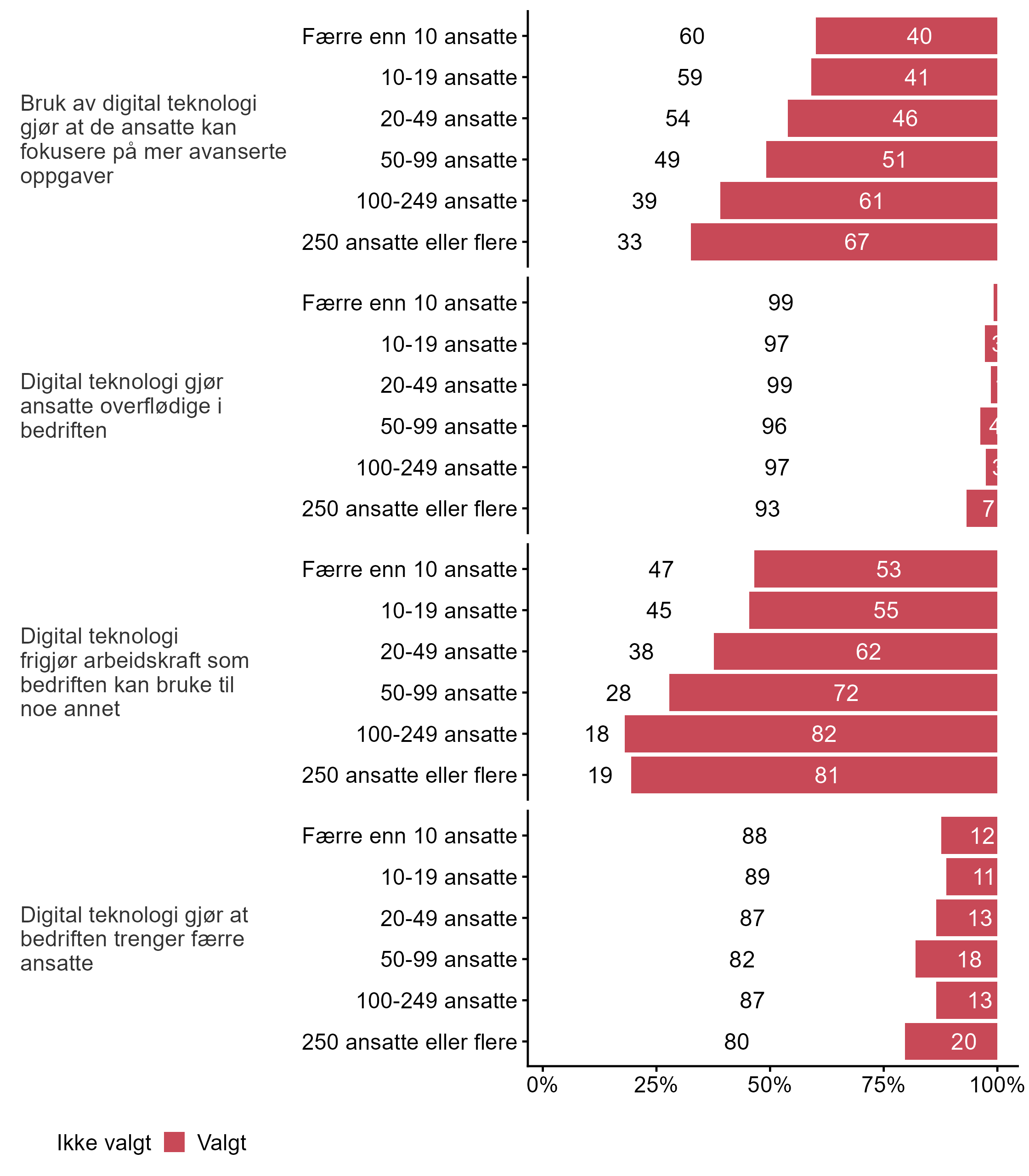 Figur 1 viser fordeling av svar på en rekke påstander om digital teknologi knyttet til blant annet arbeidsoppgaver, kompetansebehov, kompetanseheving, og kostnader. Figur 2 viser svarfordelingen på de samme påstandene fordelt på bedriftsstørrelse, mens figur 3 viser svarene fordelt på sentralitet, og figur 4 viser svarene fordelt på fylke.