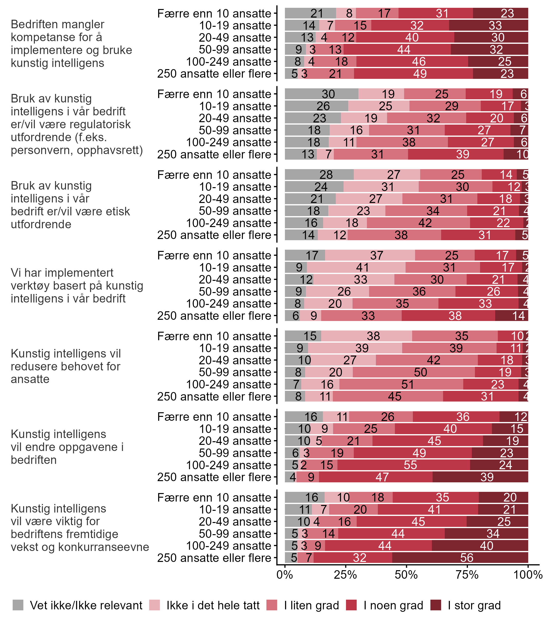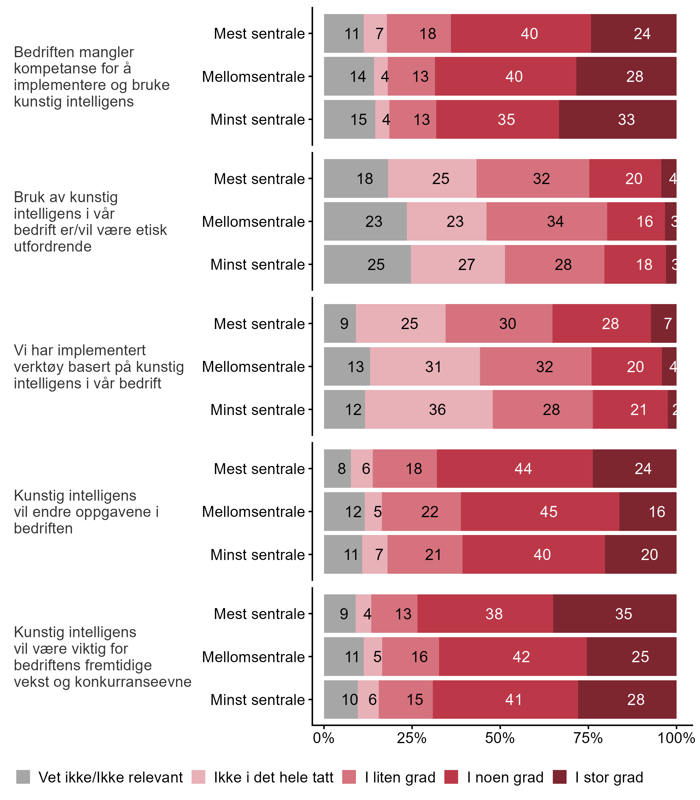 Respondenten ble presentert en rekke påstander knyttet til kunstig intelligens, figur 24 viser den overordnede fordelingen av svarene, mens figur 25 bryter svarene ned på bedriftsstørrelse, figur 26 fordeler svarene på sentralitet, og figur 27 fordeler svarene på fylke.