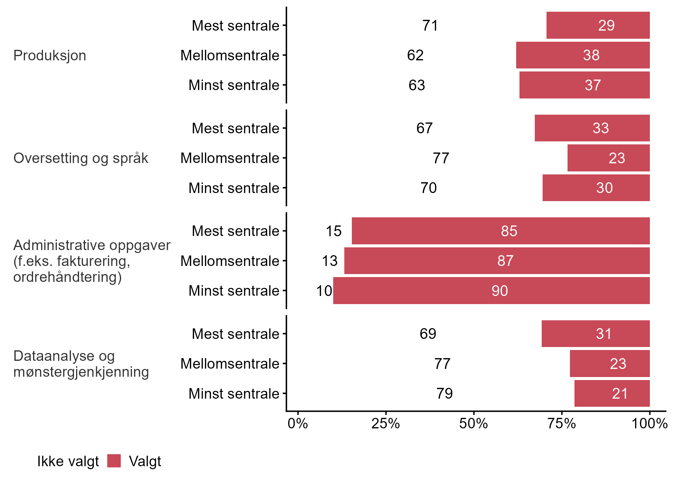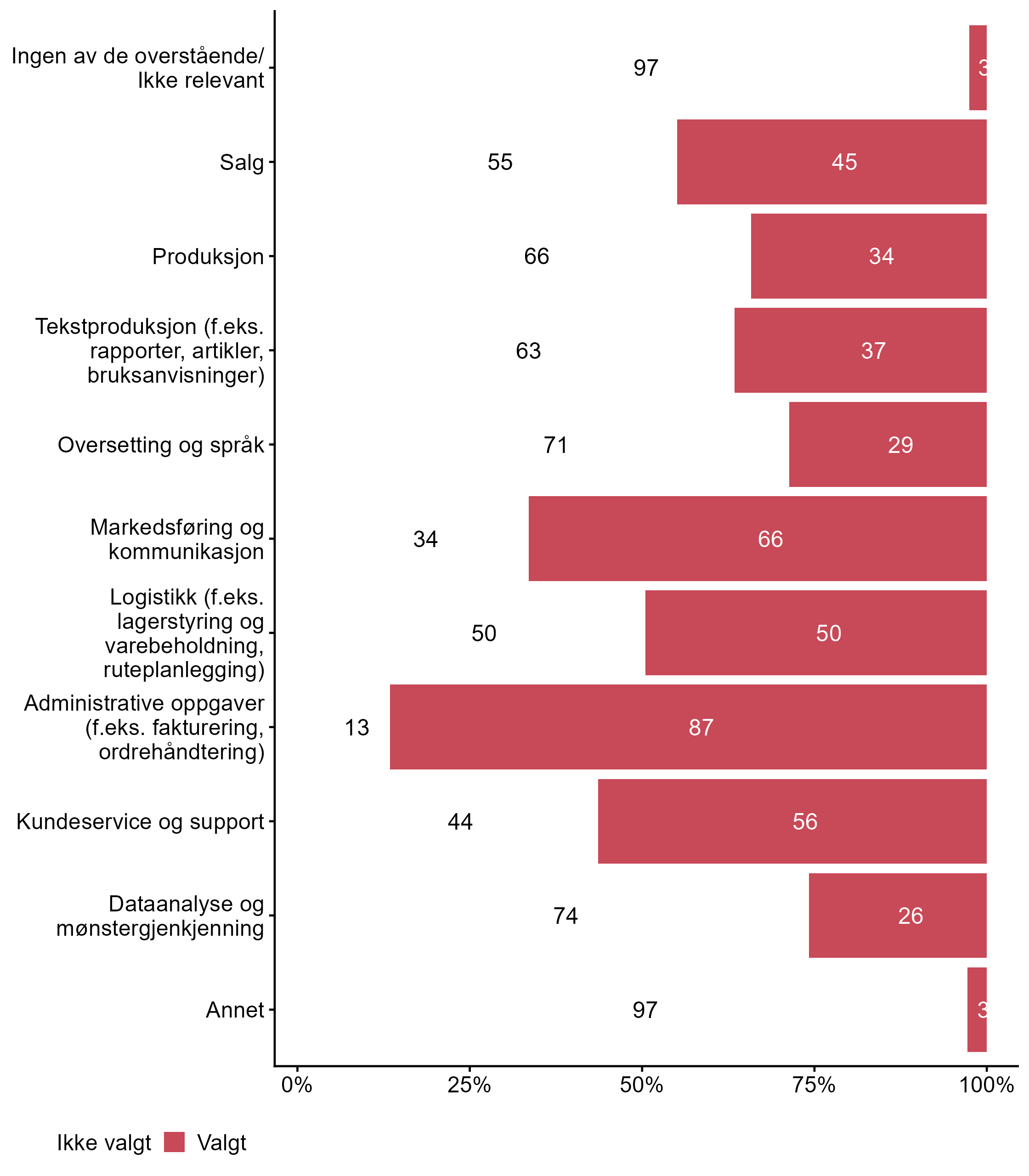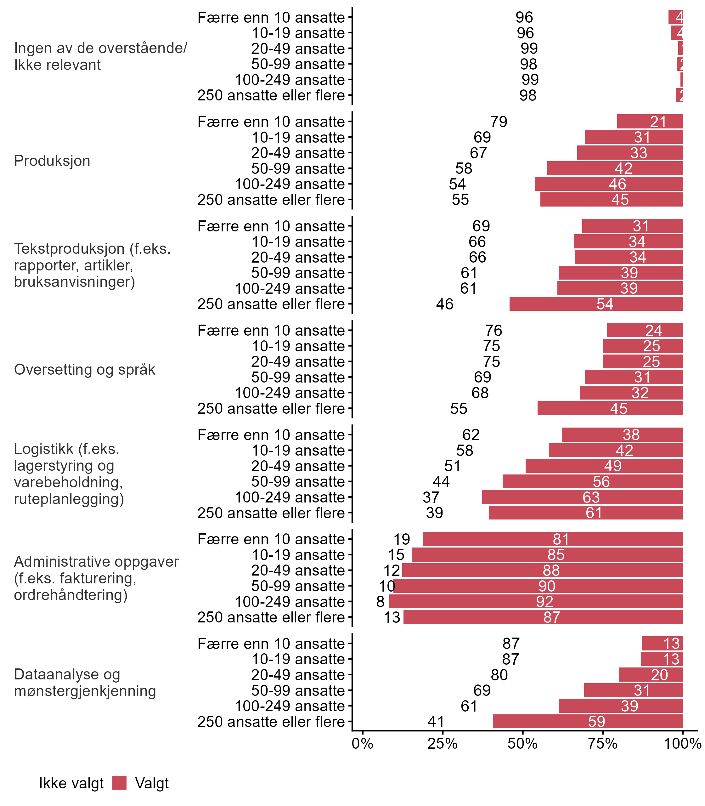 Figur 9 viser hvilke områder bedriftene som svarte på undersøkelsen bruker digital teknologi. Figur 10 viser fordelingen brutt ned på bedriftsstørrelse, figur 11 viser fordelingen fordelt på fylke, og figur 12 viser fordelingen fordelt på sentralitet.