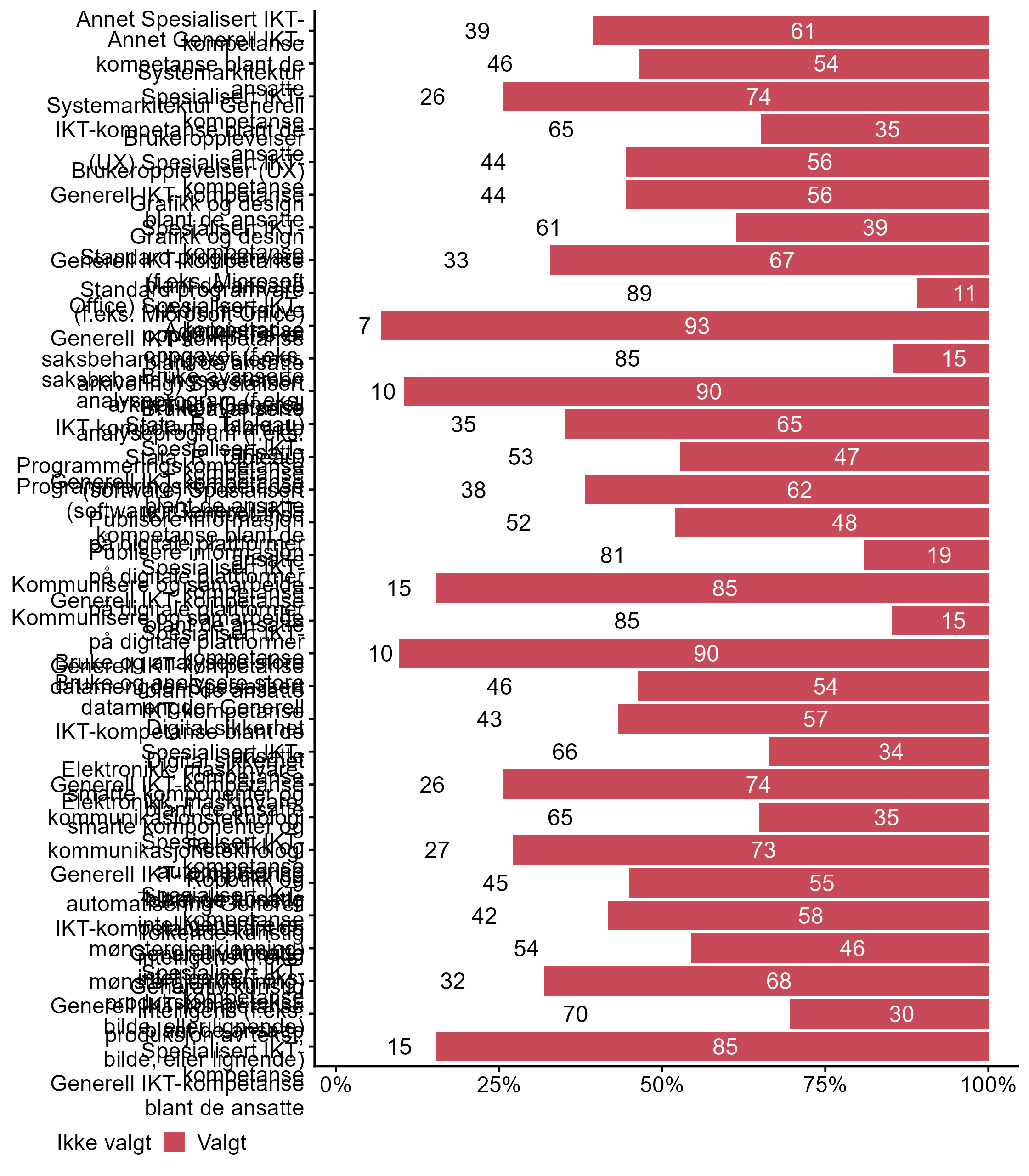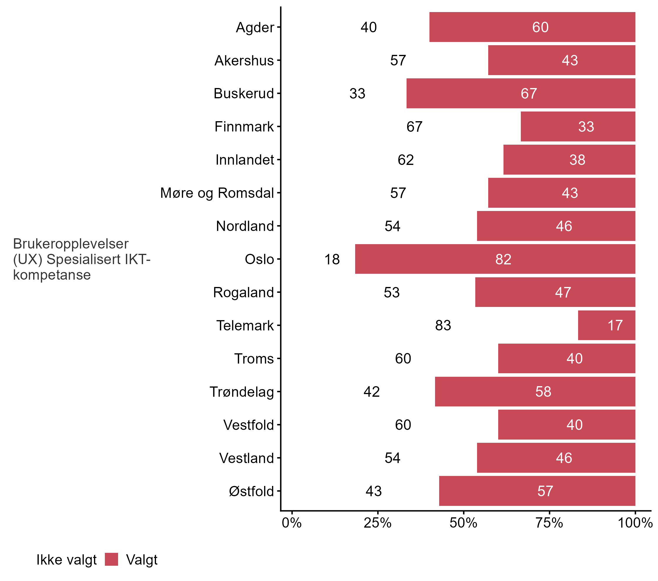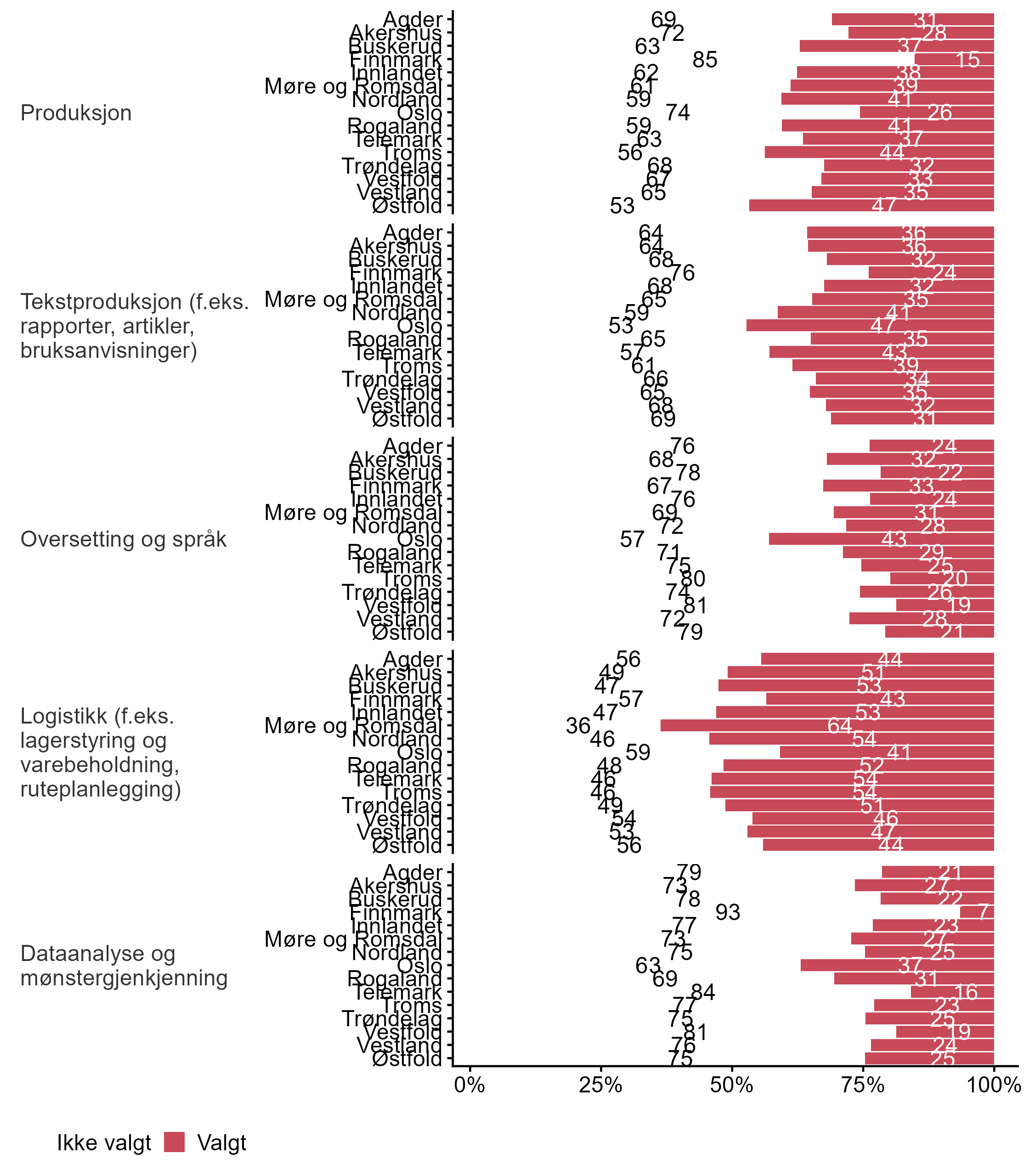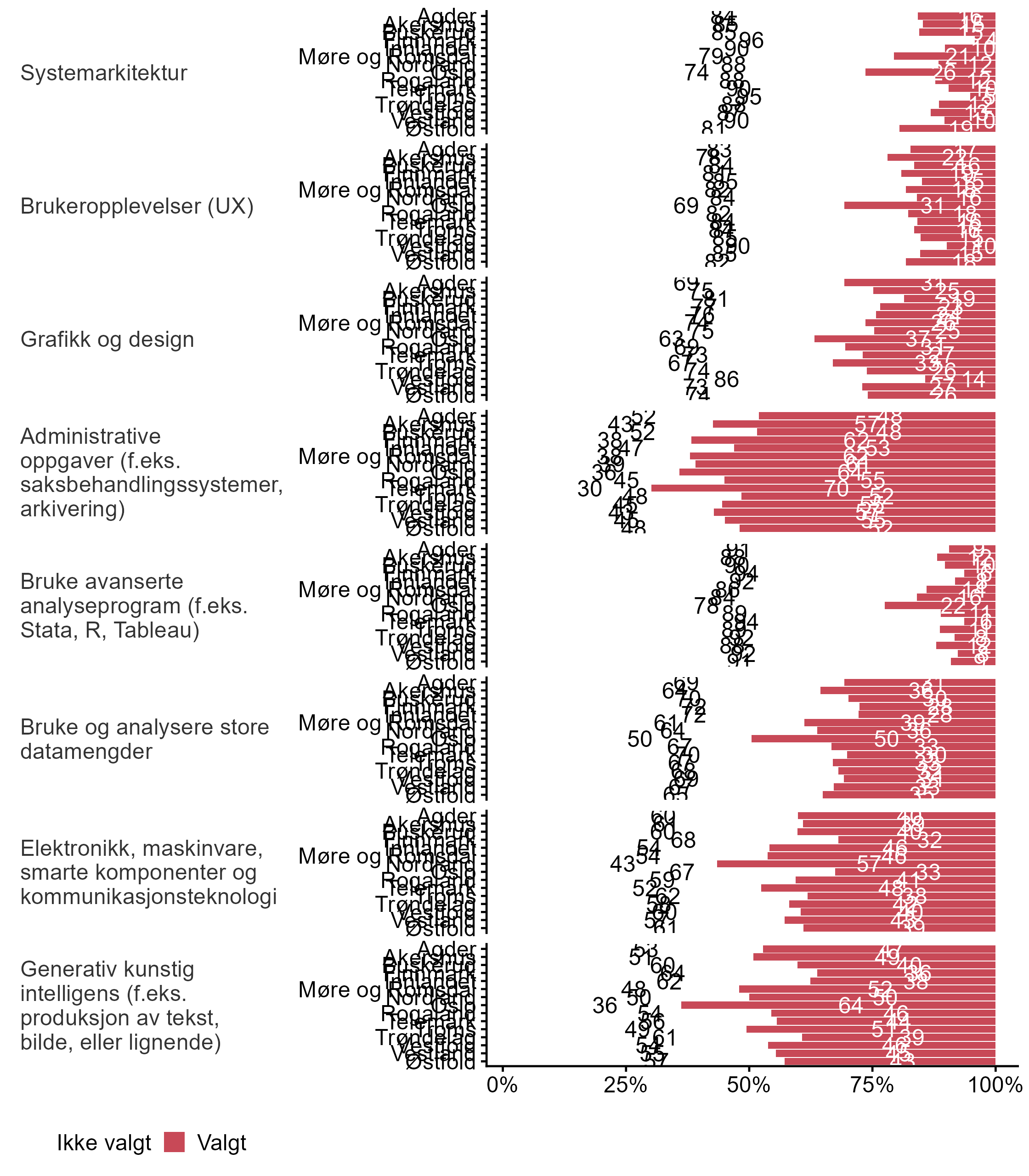 Bedriftene ble også spurt om områder der de har udekket behov for IKT-kompetanse i dag, figur 16 viser den overordnede fordelingen, mens figur 19 viser andel svar fordelt på fylke. Kun de som krysset av for spesifikke digitale teknologier på spørsmål om disse digitale teknologiene er relevante for bedriften fikk spørsmålet om udekket behov for disse kategoriene.