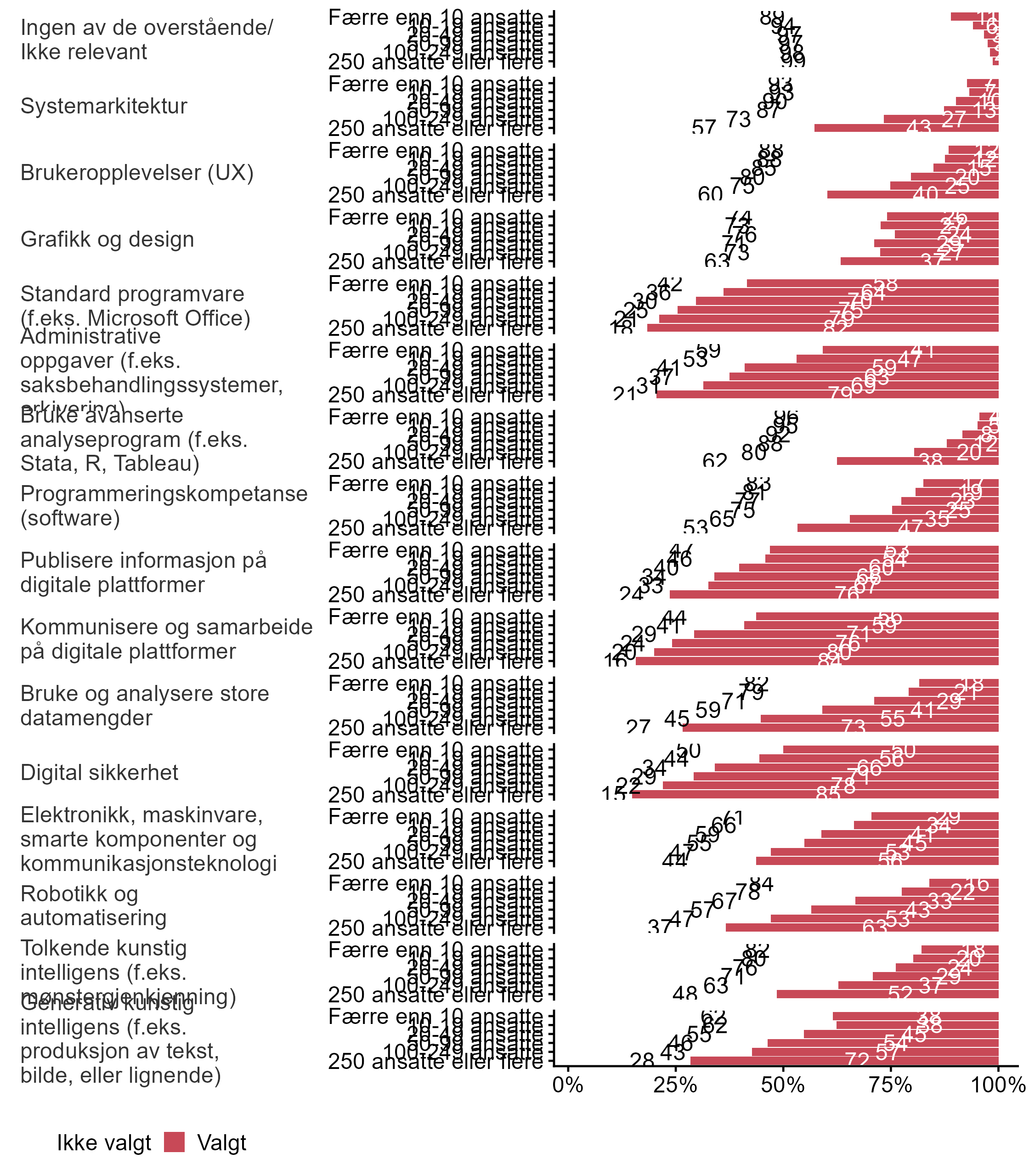 Bedriftene ble også bedt om å krysse av for hvilke digitale teknologier som var mest relevant for dem, i figur 5 viser vi svarfordelingen generelt, mens figur 6 viser svarfordelingen brutt ned på bedriftstørrelse, figur 7 viser svarfordelingen fordelt på fylke, og figur 8 viser svarfordelingen fordelt på sentralitet.