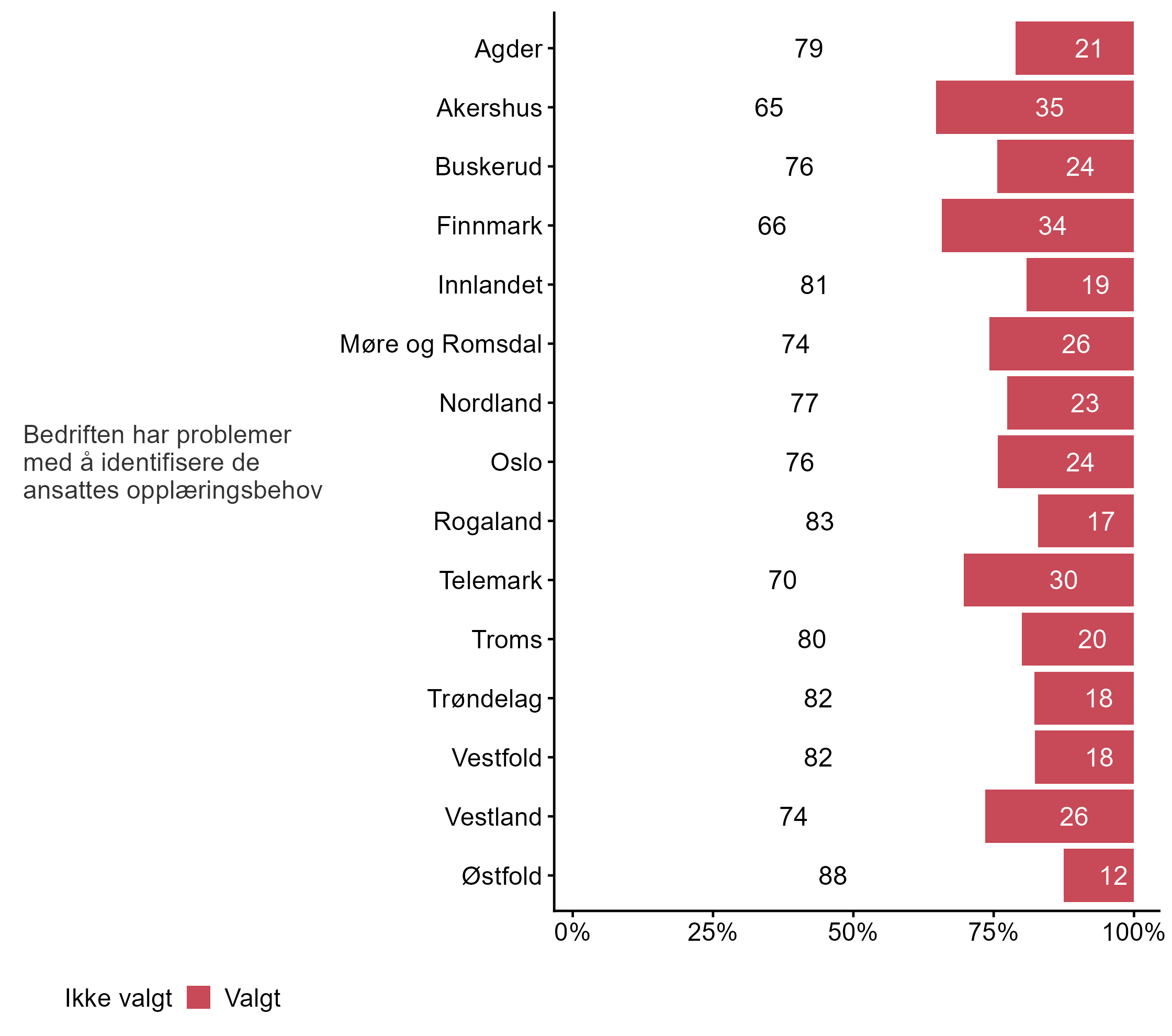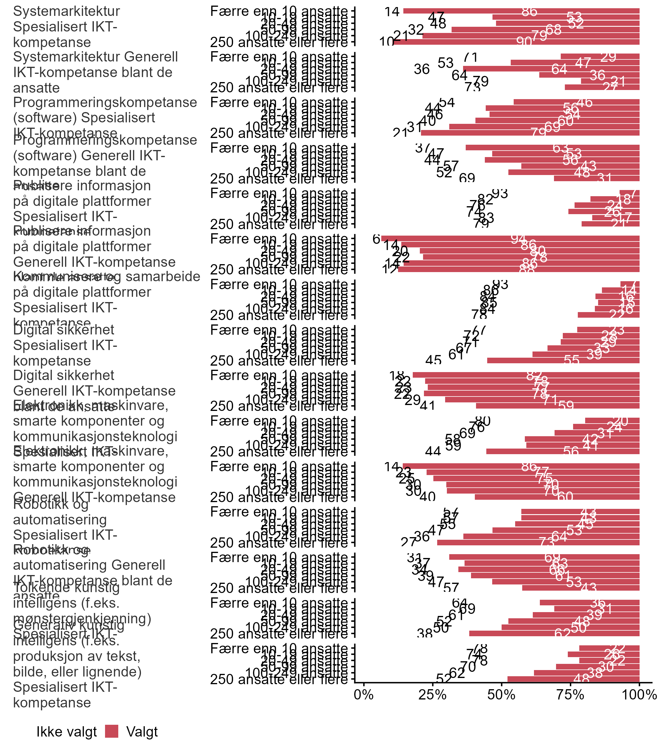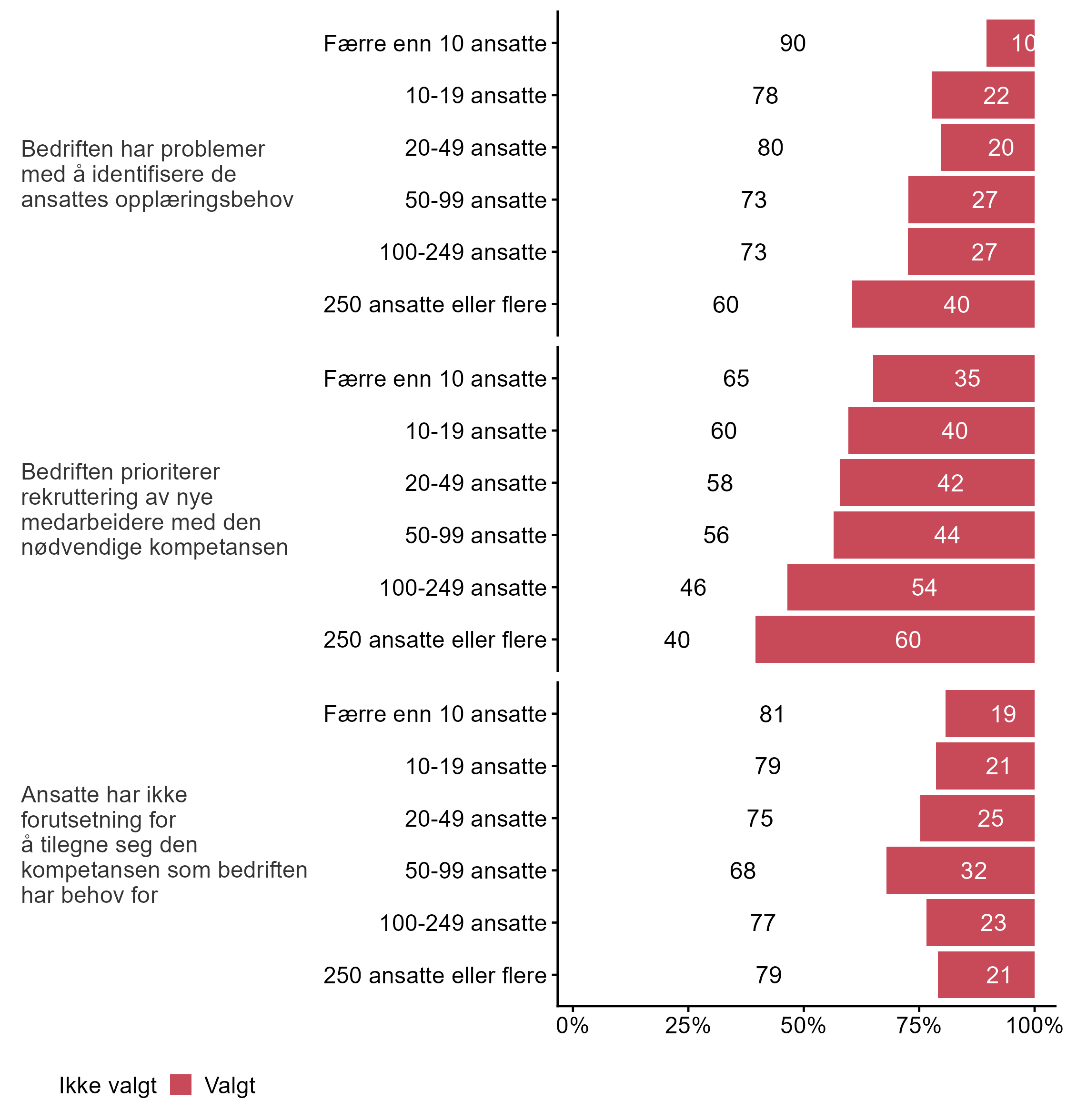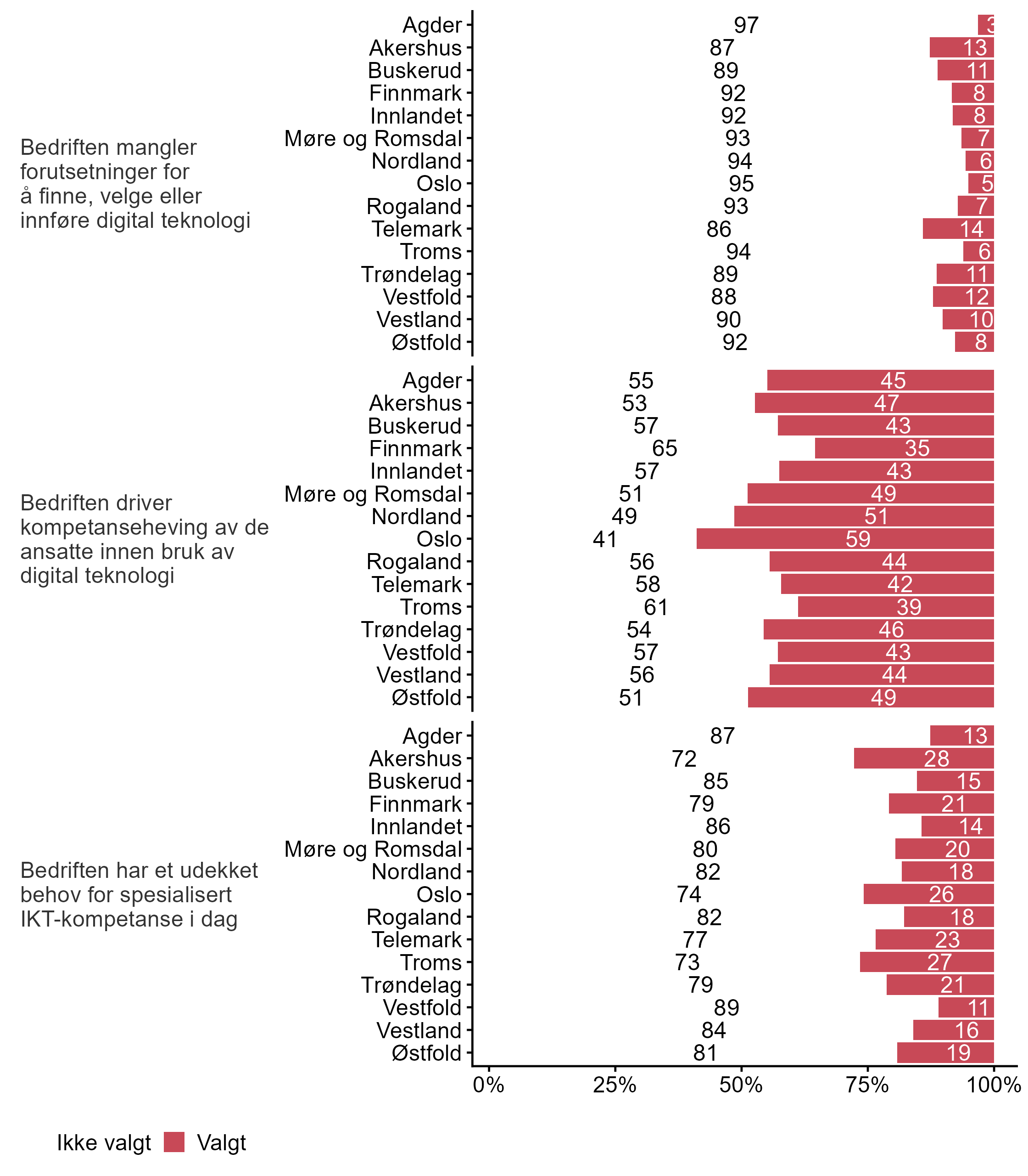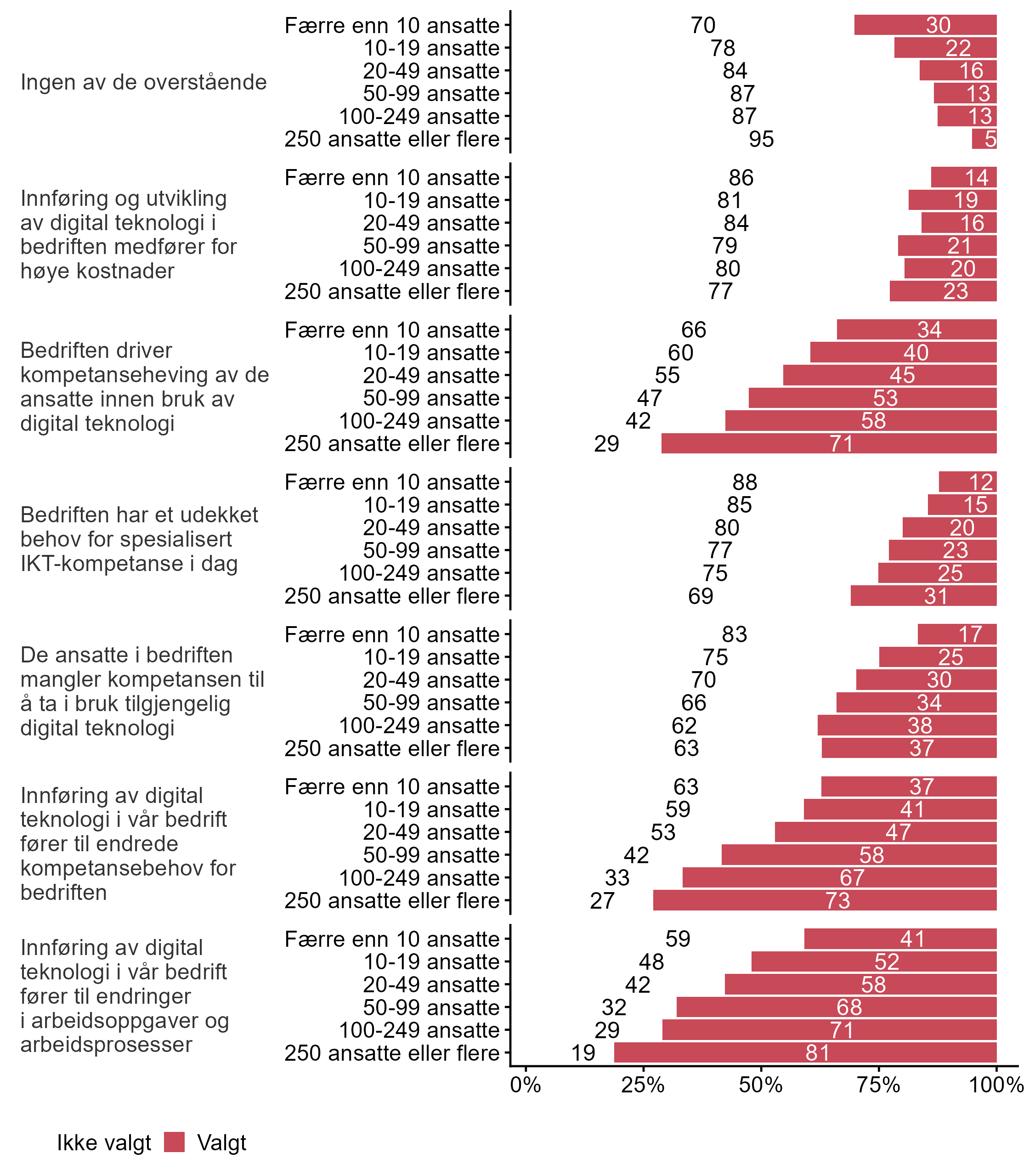 Bedriftene ble bedt om å krysse av for hvilke påstander som beskriver utfordringer knyttet til kompetansebehov og digital teknologi, figur 28 viser den overordnede svarfordelingen, mens i figur 29 blir svarene brutt ned på bedriftsstørrelse, og i figur 30 viser vi svarene fordelt på fylke.