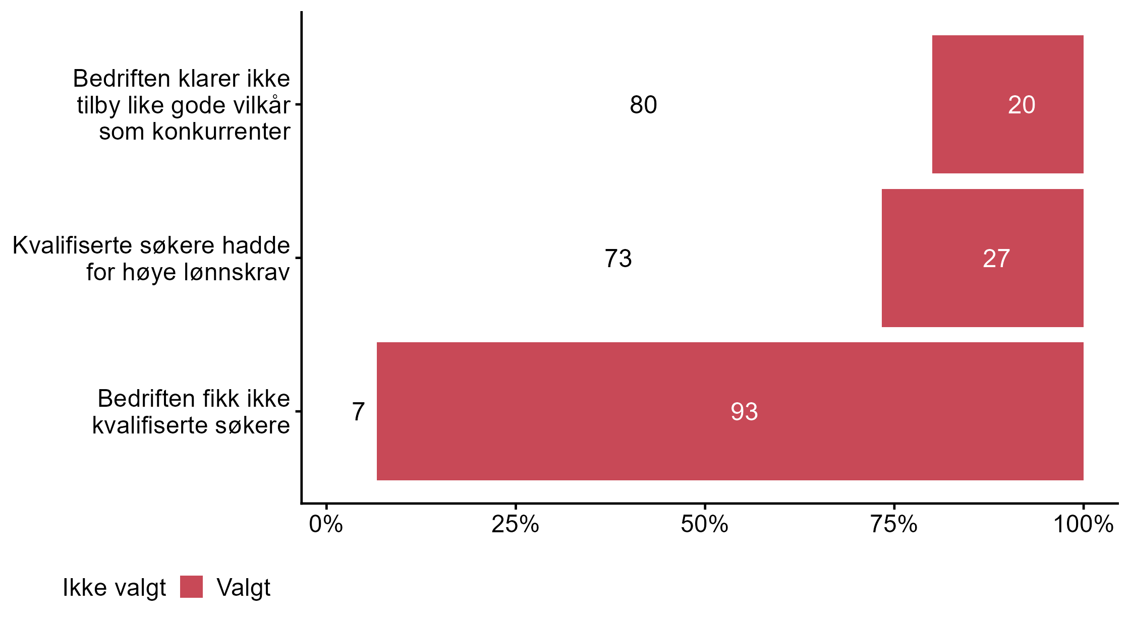 Flere respondenter svarte Valgt på Vi fikk ikke ansatt noen i målgruppen (0,6) enn for alle andre (0,4). For påstanden Vi fikk ikke ansatt noen med de kvalifikasjonene vi søkte etter, men har ansatt noen med lavere formell kompetanse var det færre som svarte Valgt i målgruppen (0,4) enn blant andre (0,53). Færre respondenter svarte Valgt for Vi fikk ikke ansatt noen med de kvalifikasjonene vi søkte etter, men har ansatt noen med annen fagkompetanse i målgruppen (0,07) enn i andre grupper (0,26).