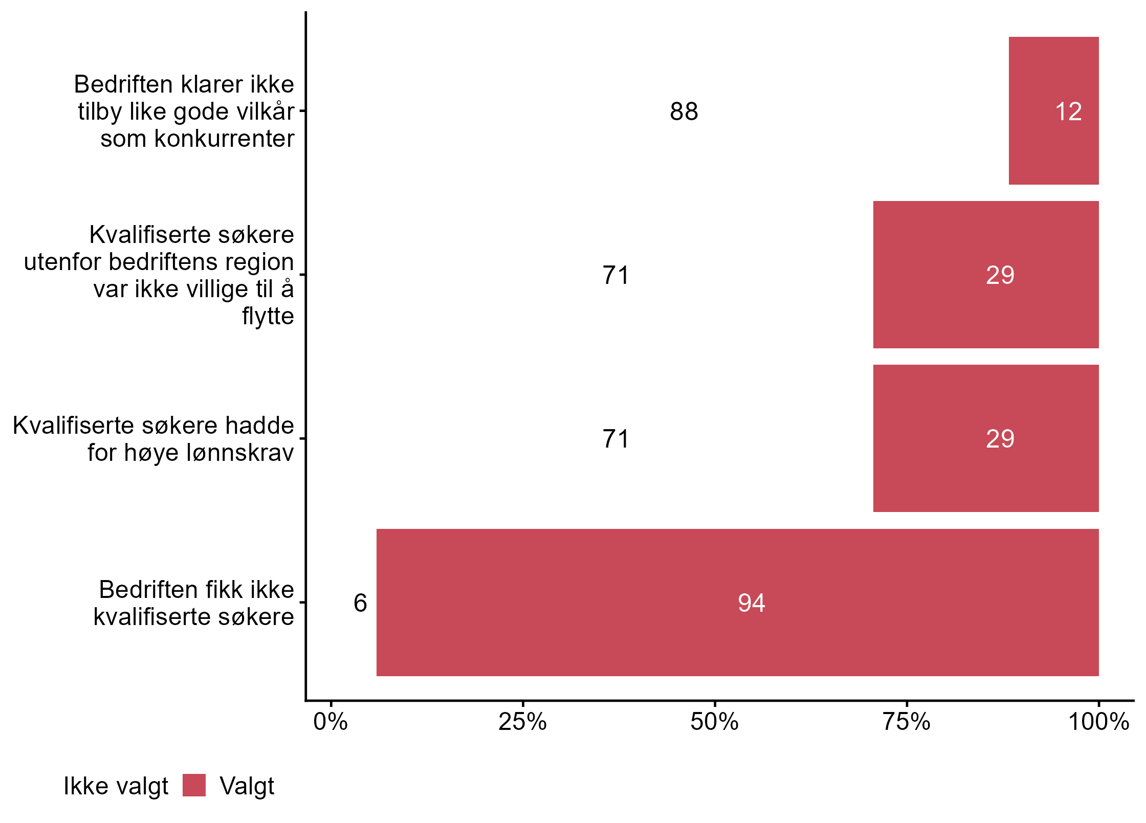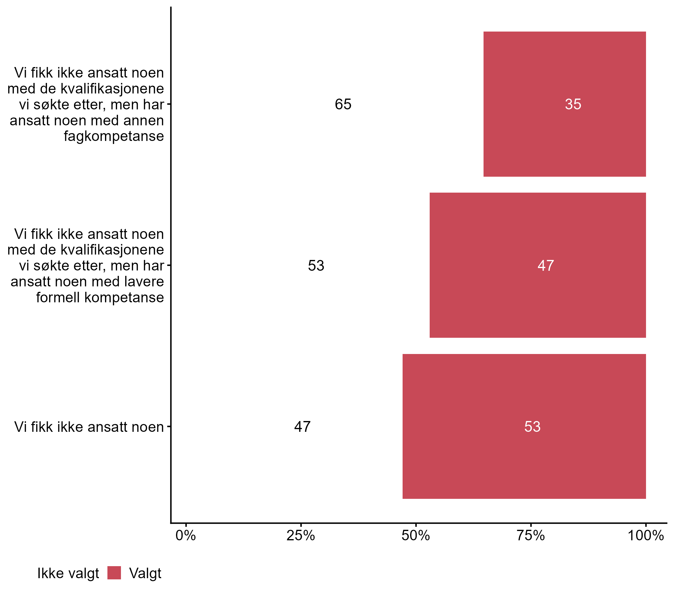 For Vi fikk ikke ansatt noen har målgruppen en høyere andel respondenter (0,53) enn alle andre (0,4) som svarte Valgt. For Vi fikk ikke ansatt noen med de kvalifikasjonene vi søkte etter, men har ansatt noen med annen fagkompetanse har målgruppen en høyere andel respondenter (0,35) enn alle andre (0,25) som svarte Valgt.