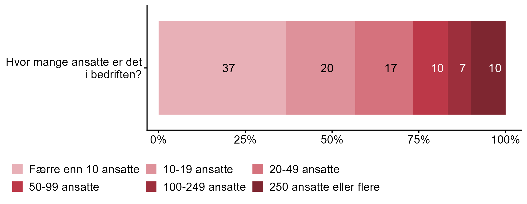 Kapittelet viser en overordnet fordeling på antall ansatte i bedrifter som har deltatt i undersøkelsen i figur 1, hvor stor andel av bedriftene som har svart fra hvert fylke i tabell 1, og andelen fordelt på sentralitet i tabell 2. Der det har vært mer oversiktlig å presentere sentralitet på en 3-delt skala har vi gjort dette.