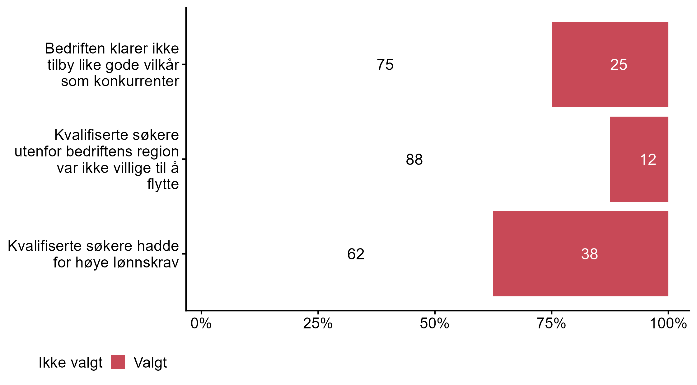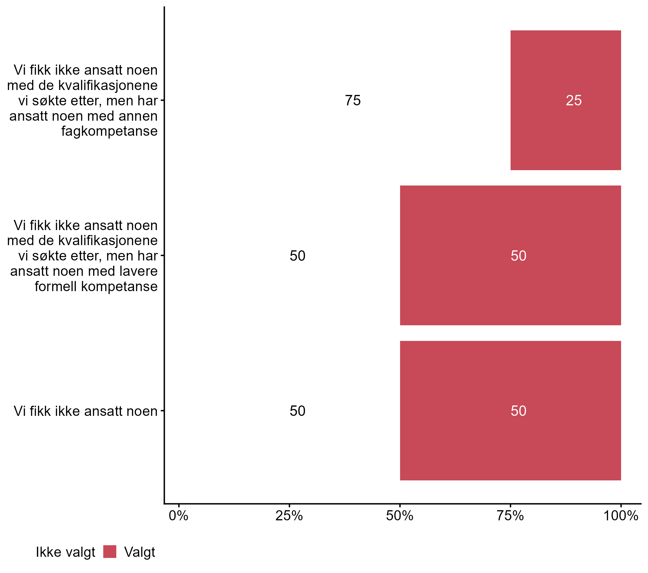 Flere respondenter svarte Valgt på Vi fikk ikke ansatt noen i målgruppen (0,5) enn for alle andre (0,4).