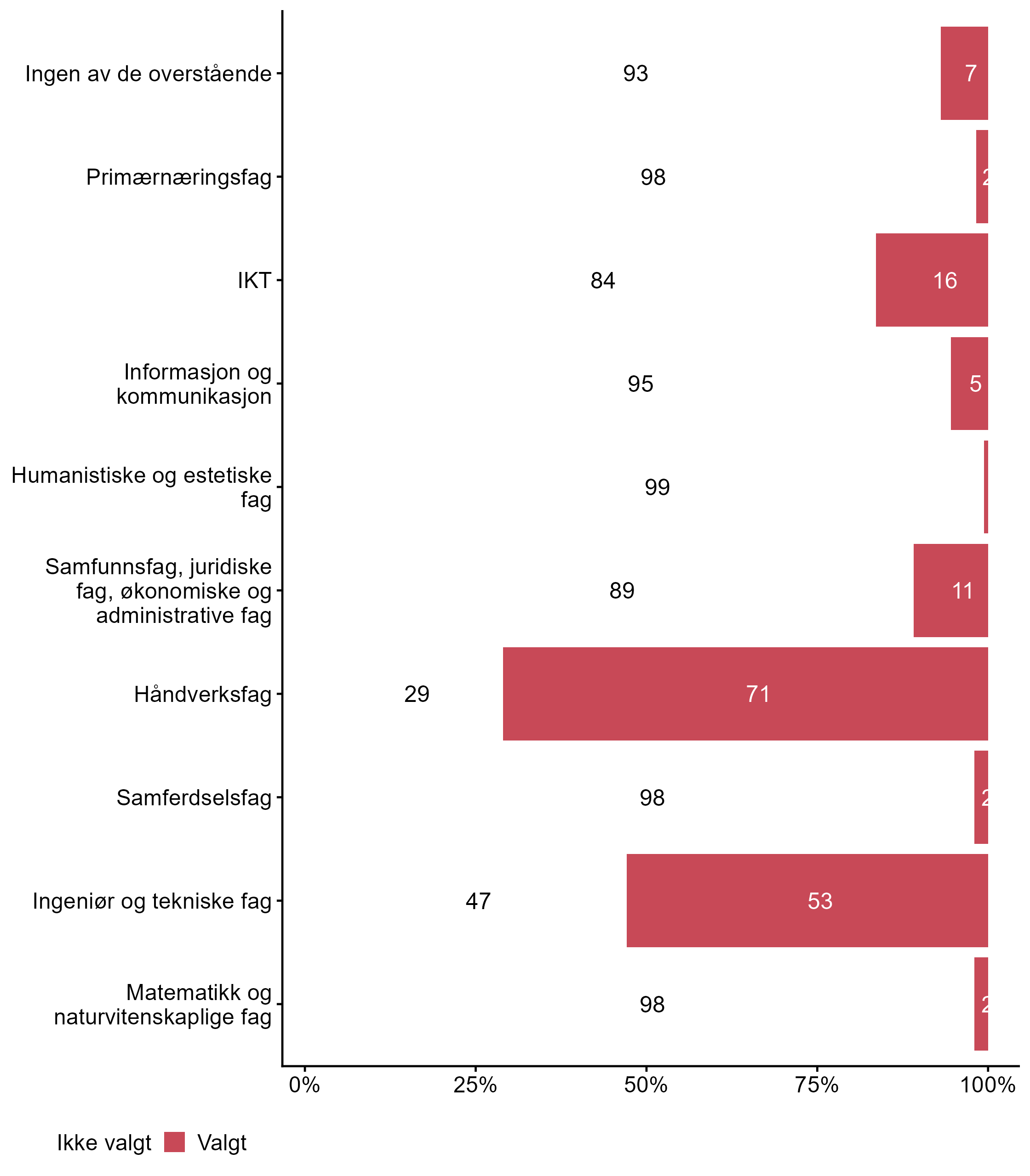 For Ingeniør og tekniske fag har målgruppen en høyere andel respondenter (0,53) enn alle andre (0,34) som svarte Valgt. Flere respondenter svarte Valgt på Håndverksfag i målgruppen (0,71) enn for alle andre (0,33). Færre respondenter svarte Valgt for Ingen av de overstående i målgruppen (0,07) enn i andre grupper (0,17).