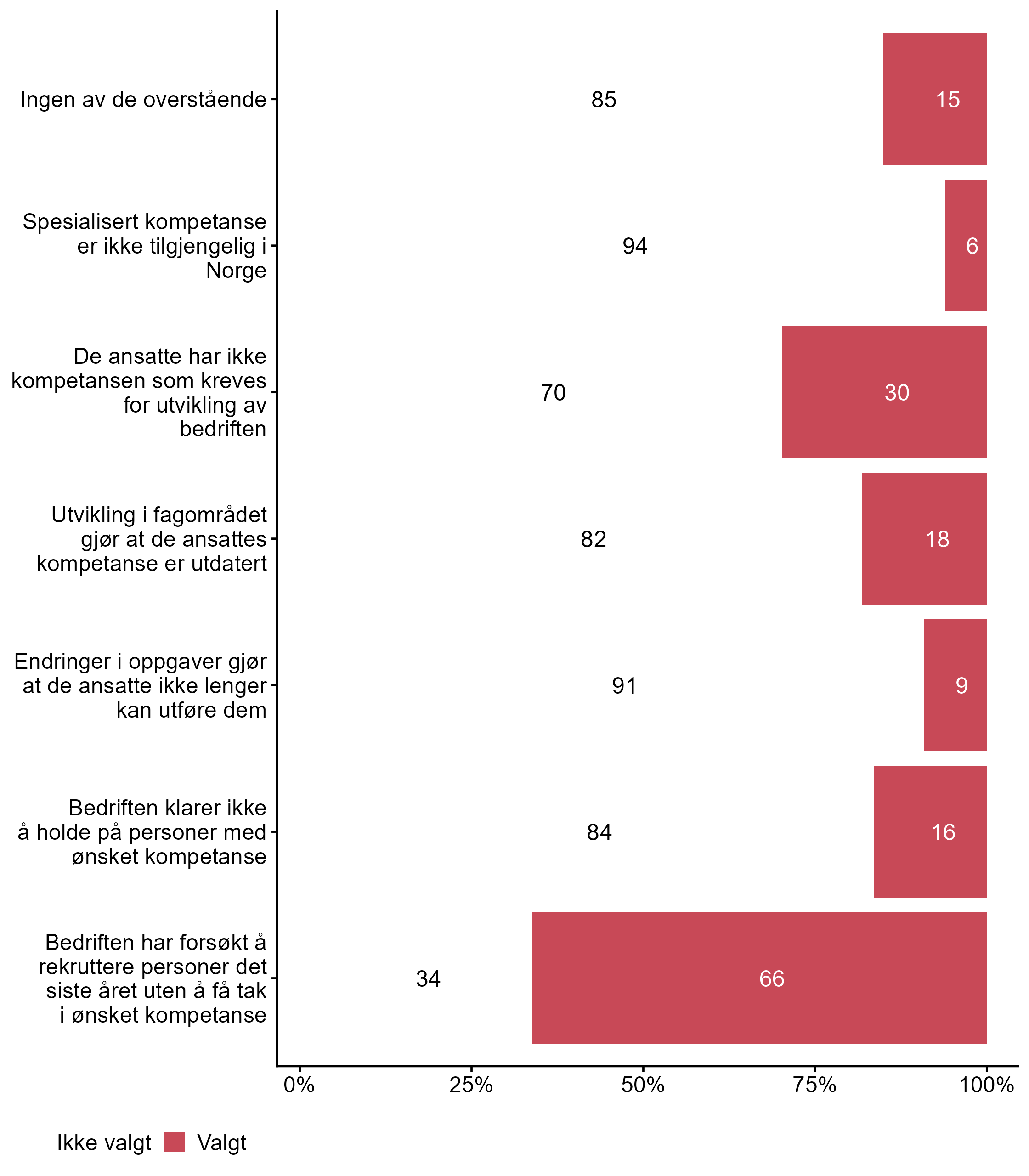 I dette kapittelet kan du sammenligne NHO Byggenæringen med andre bedrifters svar på spørsmål om kompetansebehov. Dette inkluderer i hvilken grad bedriften har behov for kompetanse innen spesifikke fagområder og utdanningsnivåer, samt årsaker til, og konsekvenser av, kompetansebehovet, og hvilke tiltak bedriften har for å dekke kompetansebehovet.
