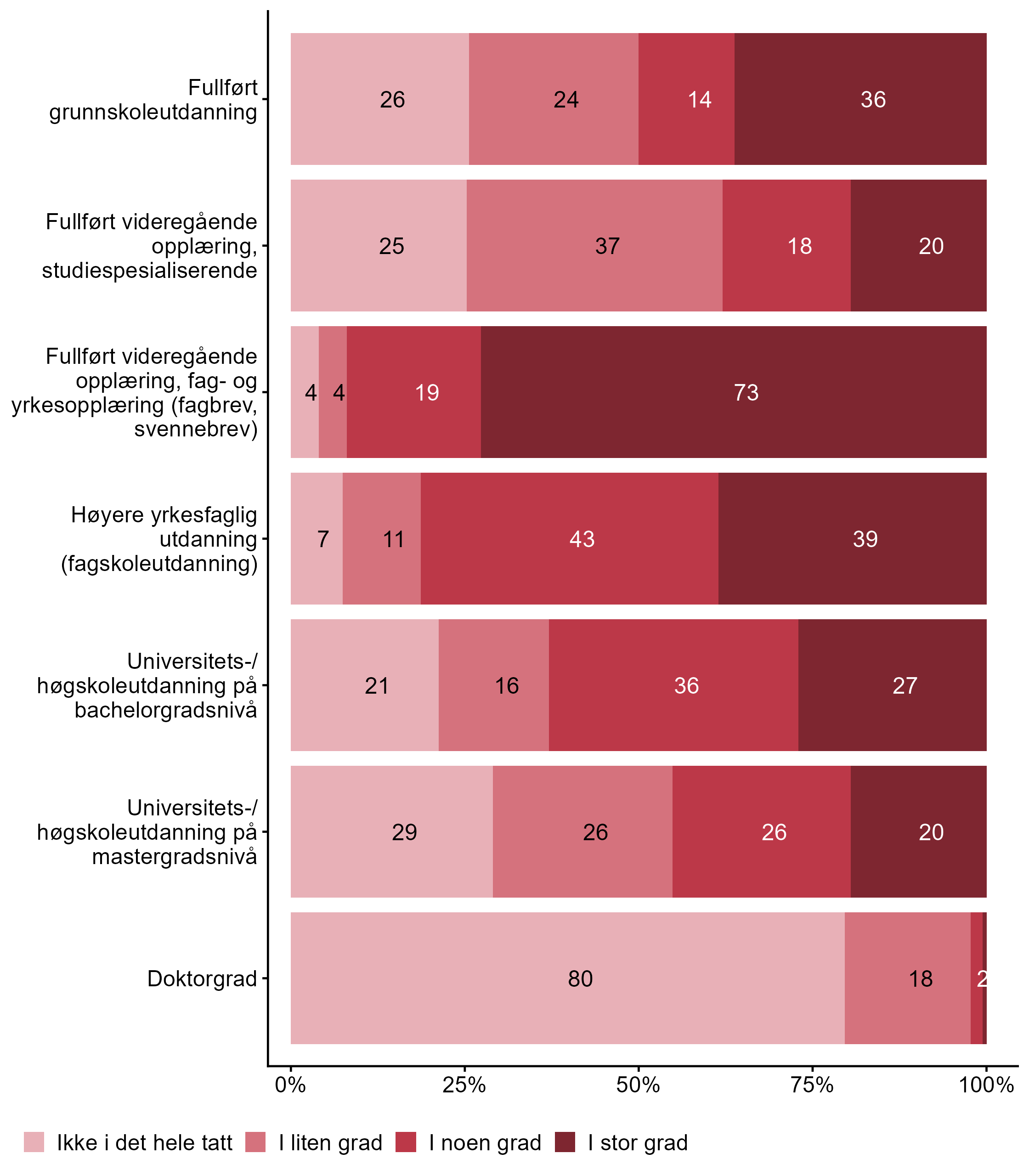 For Høyere yrkesfaglig utdanning (fagskoleutdanning) har målgruppen en høyere andel respondenter (0,81) enn alle andre (0,66) som svarte I noen grad eller I stor grad. For påstanden Fullført videregående opplæring, fag- og yrkesopplæring (fagbrev, svennebrev) var det flere som svarte I noen grad eller I stor grad i målgruppen (0,92) enn blant andre (0,74).