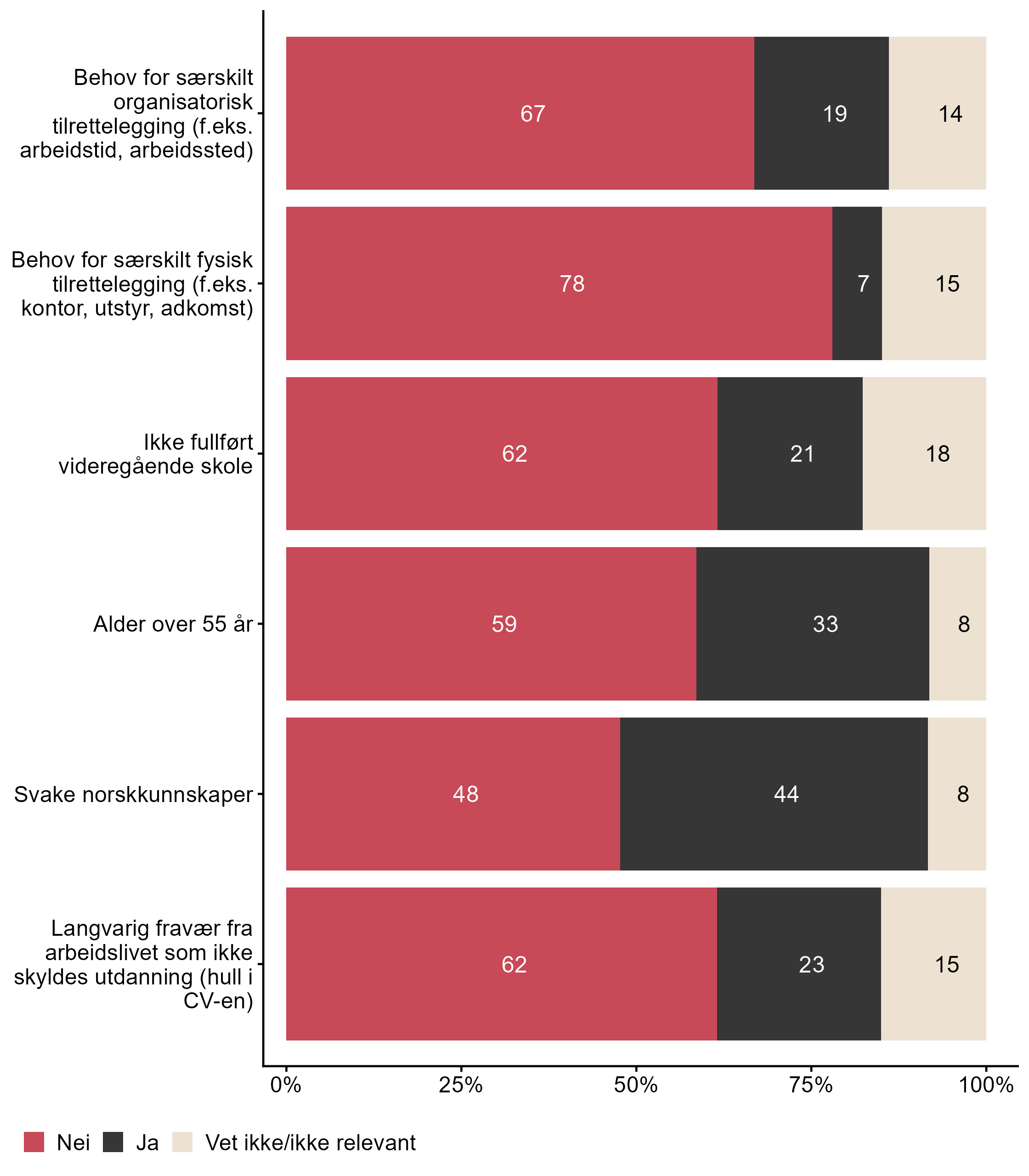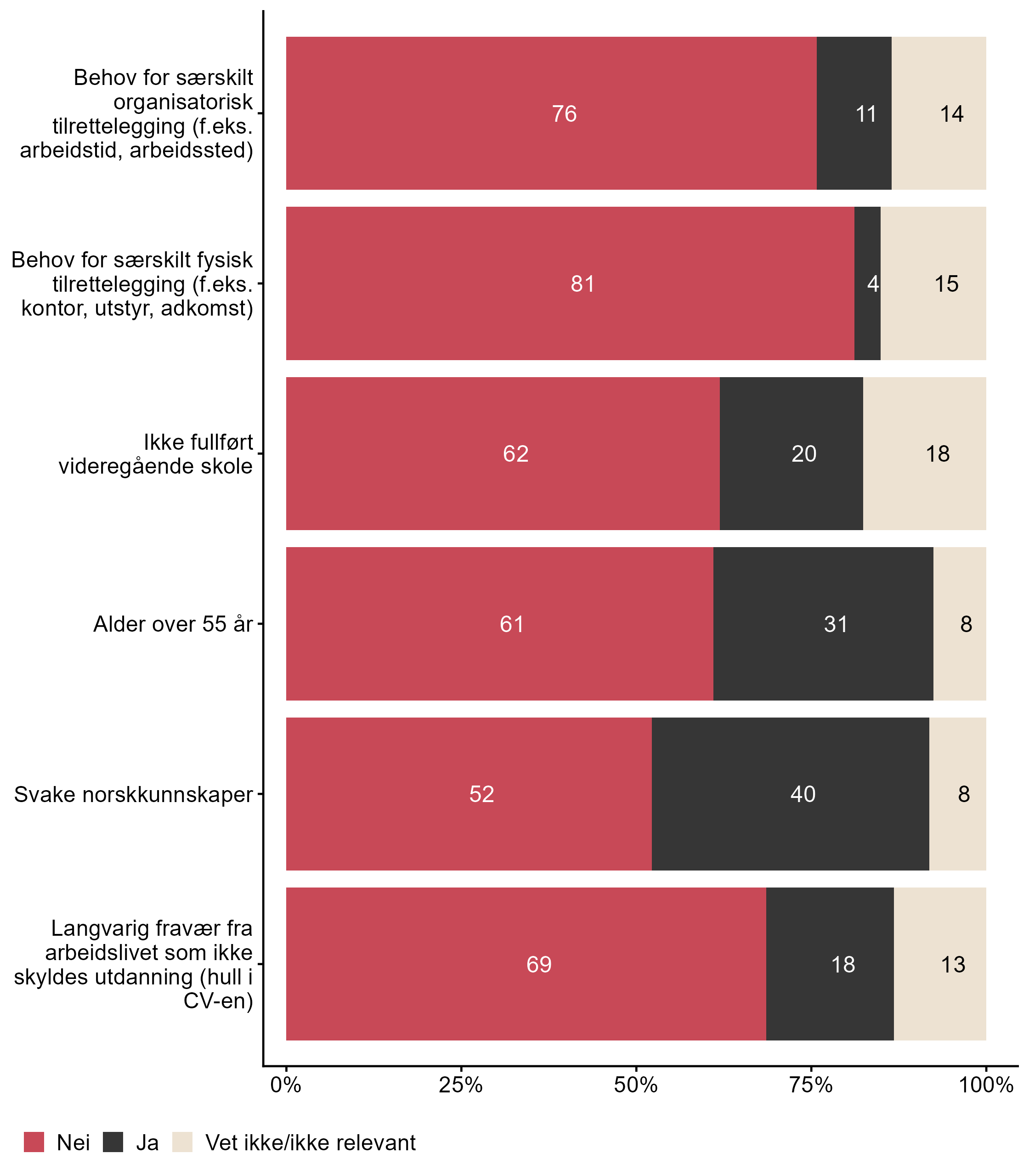 I dette kapittelet kan du sammenligne svar fra NHO Byggenæringen med andre bedrifter som svarte på undersøkelsen, og tar for seg spørsmål som går på om bedriften har ansatt personer fra grupper som har svake norskkunnskaper, er 55 år eller eldre, har langvarig fravær fra arbeidslivet som ikke skyldes utdanning, ikke fullført videregående skole, har behov for særskilt organisatorisk eller fysisk tilrettelegging.
