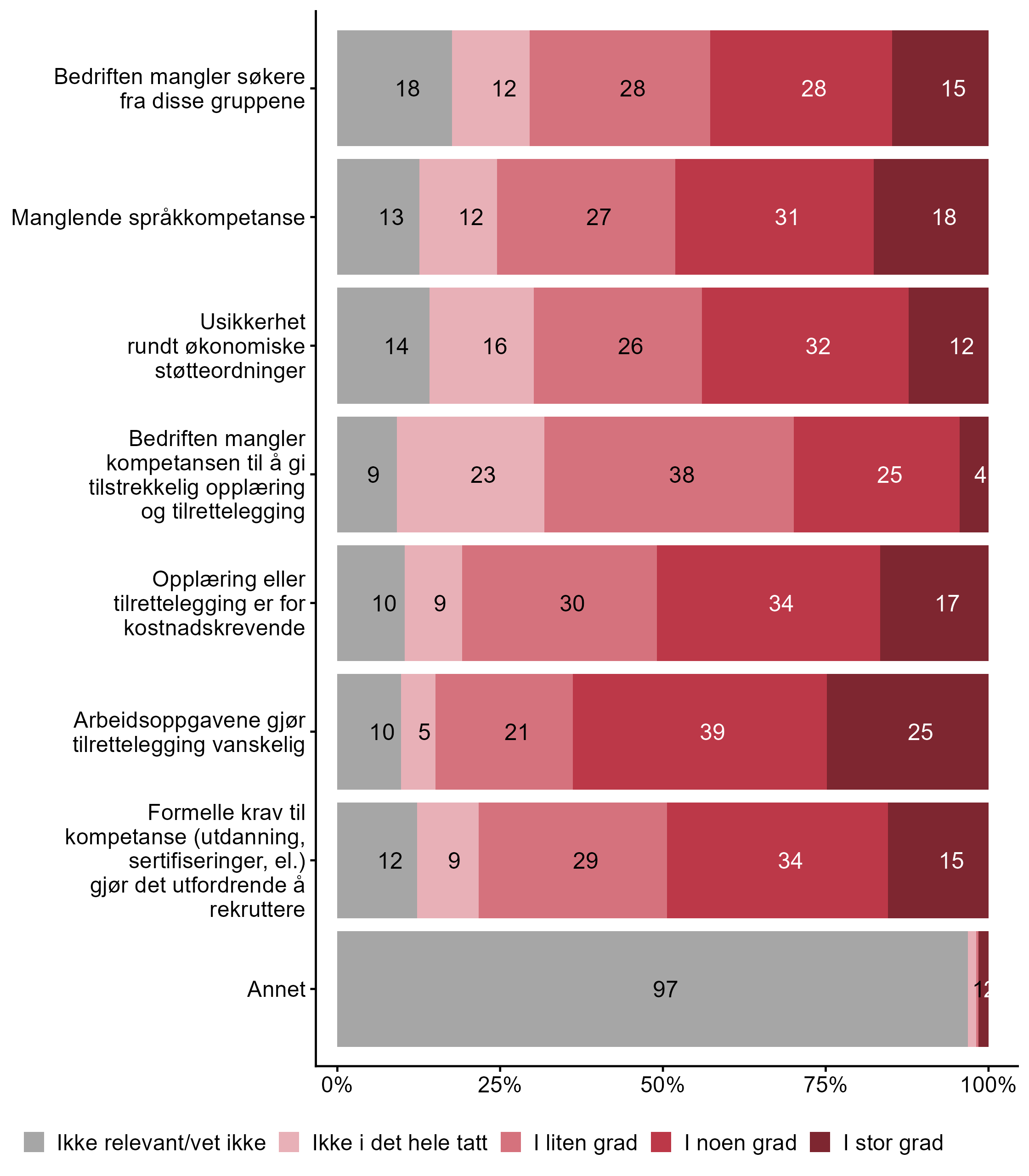 5.2 I hvilken grad opplever bedriften følgende barrierer når det gjelder å rekruttere personer fra disse gruppene?