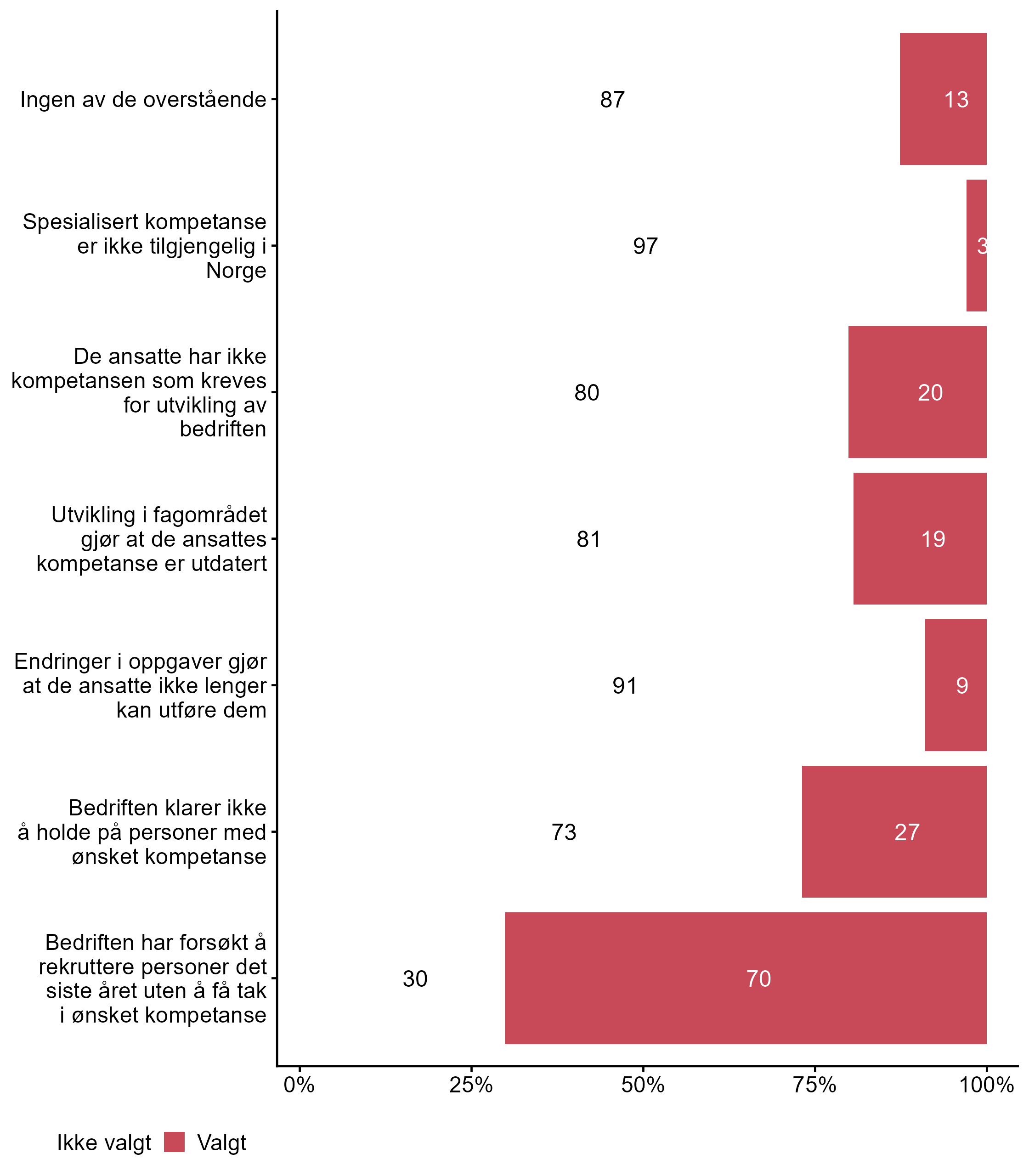 I dette kapittelet kan du sammenligne NHO Elektro med andre bedrifters svar på spørsmål om kompetansebehov. Dette inkluderer i hvilken grad bedriften har behov for kompetanse innen spesifikke fagområder og utdanningsnivåer, samt årsaker til, og konsekvenser av, kompetansebehovet, og hvilke tiltak bedriften har for å dekke kompetansebehovet.