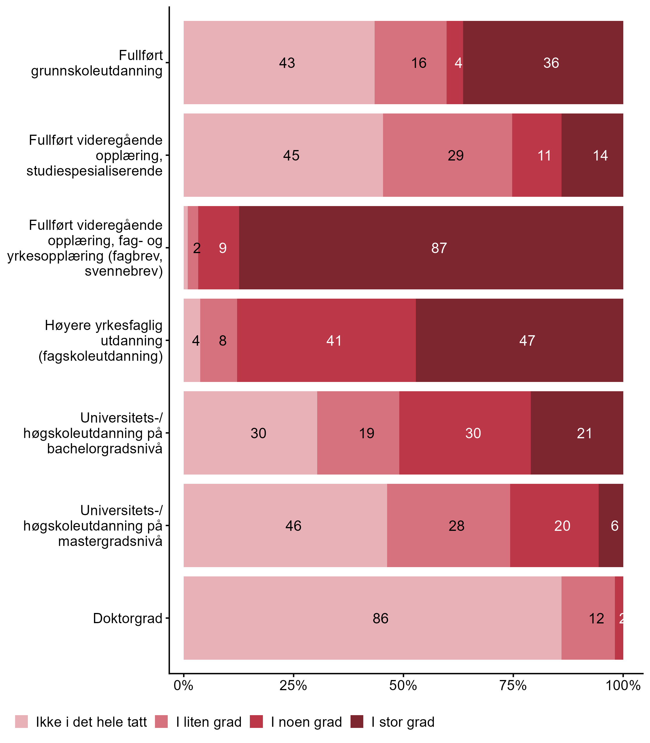 For Doktorgrad har målgruppen en lavere andel respondenter (0,14) enn alle andre (0,27) som svarte I liten grad eller I noen grad. For påstanden Universitets-/høgskoleutdanning på mastergradsnivå var det færre som svarte I noen grad eller I stor grad i målgruppen (0,26) enn blant andre (0,51). For påstanden Universitets-/høgskoleutdanning på bachelorgradsnivå var det færre som svarte I noen grad eller I stor grad i målgruppen (0,51) enn blant andre (0,65). For Høyere yrkesfaglig utdanning (fagskoleutdanning) har målgruppen en høyere andel respondenter (0,88) enn alle andre (0,66) som svarte I noen grad eller I stor grad. Flere respondenter svarte I noen grad eller I stor grad på Fullført videregående opplæring, fag- og yrkesopplæring (fagbrev, svennebrev) i målgruppen (0,97) enn for alle andre (0,75). For påstanden Fullført videregående opplæring, studiespesialiserende var det færre som svarte I noen grad eller I stor grad i målgruppen (0,25) enn blant andre (0,41).