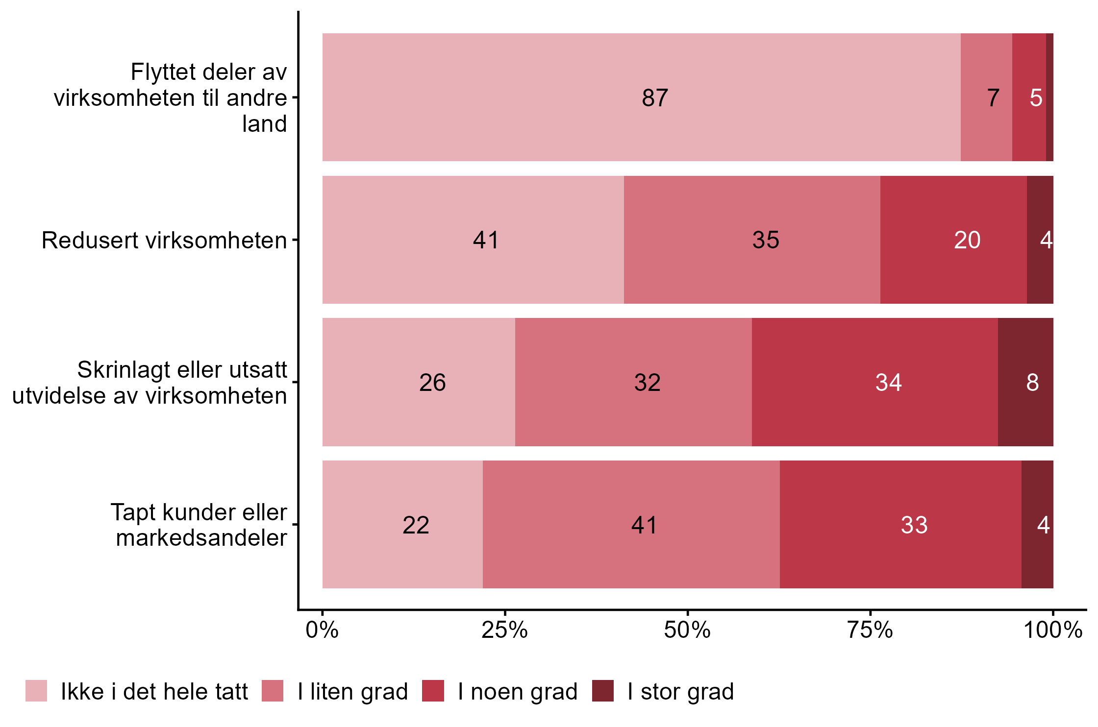 For Skrinlagt eller utsatt utvidelse av virksomheten har målgruppen en høyere andel respondenter (0,58) enn alle andre (0,41) som svarte I noen grad eller I stor grad.