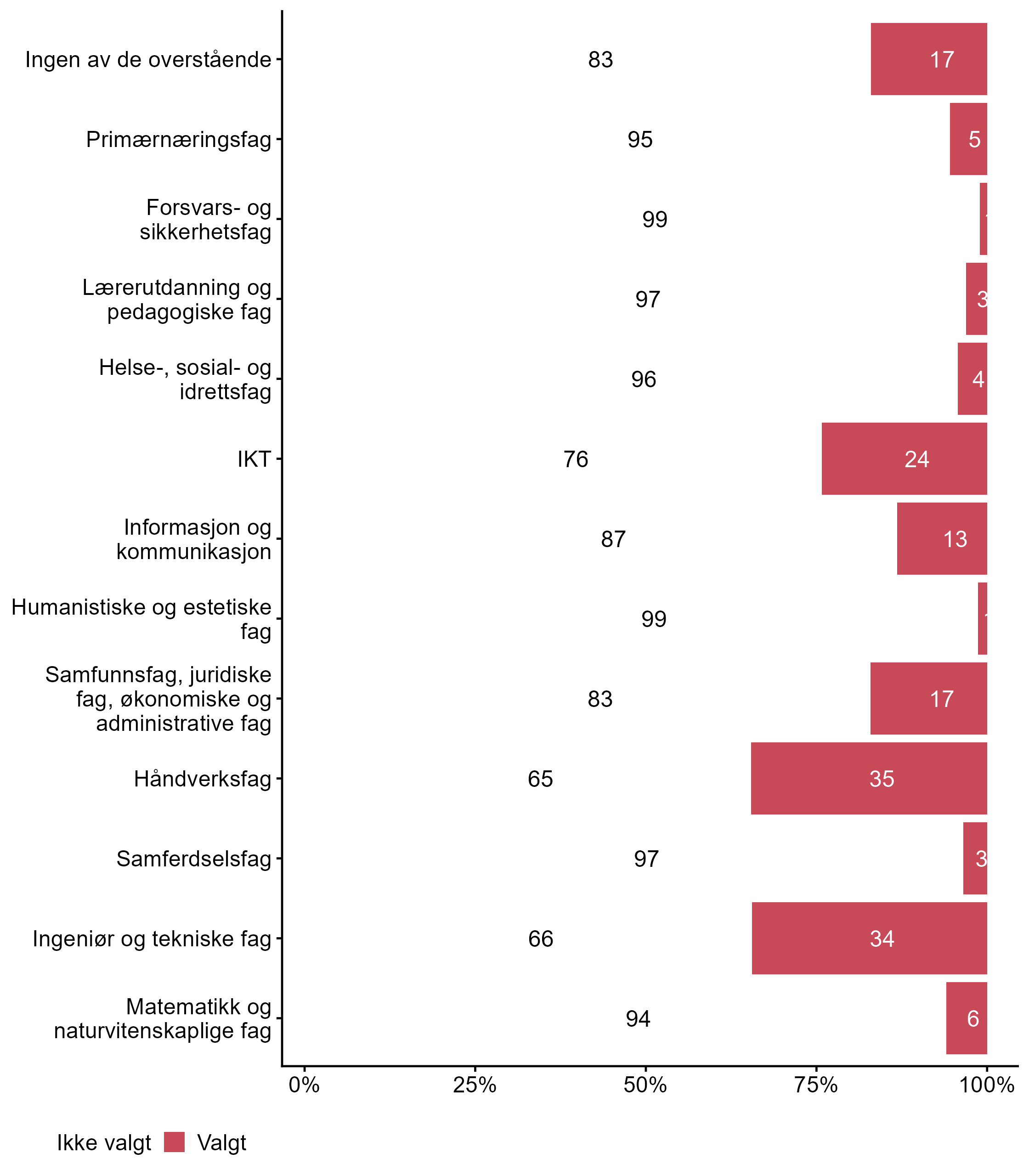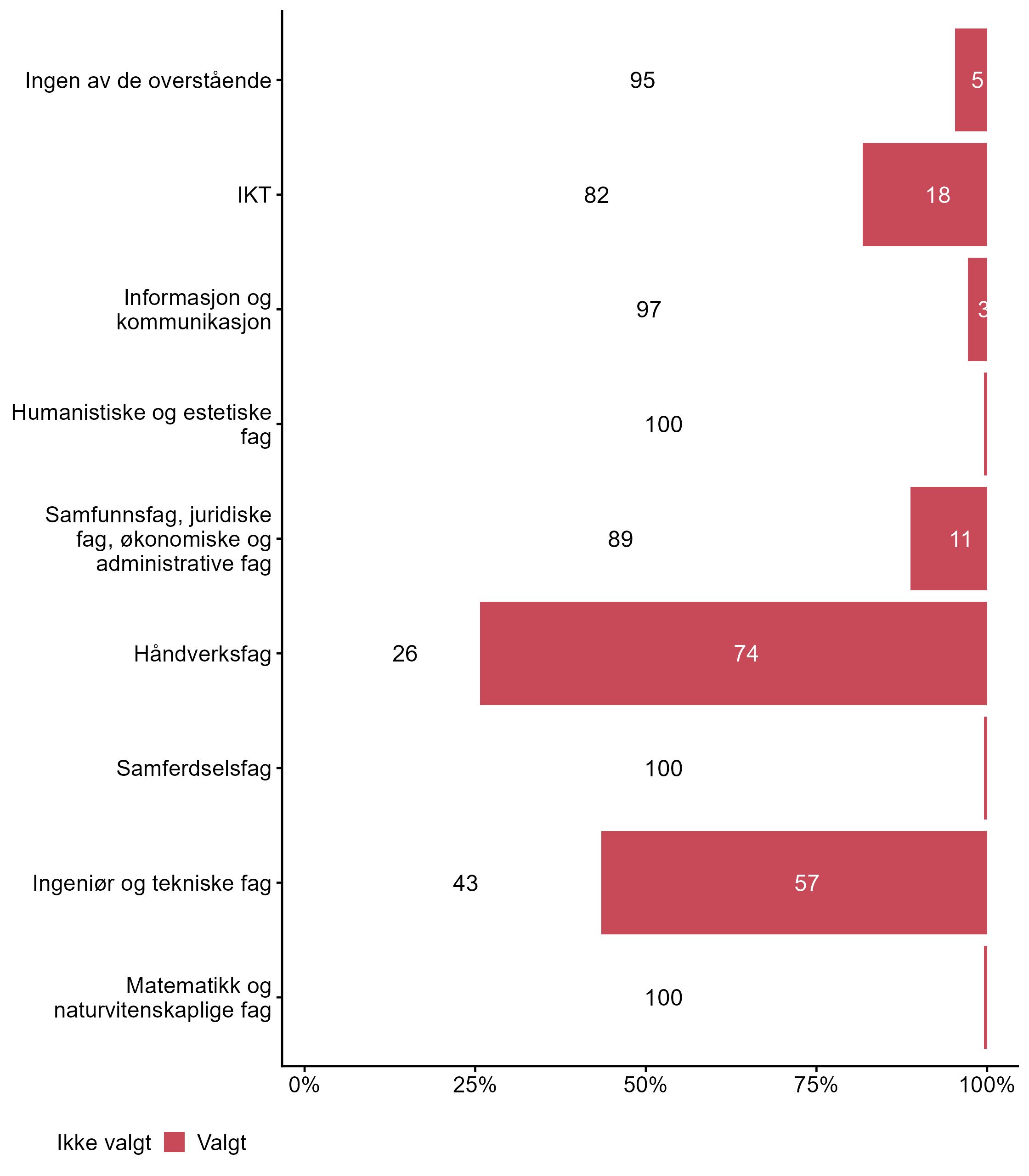 For påstanden Ingeniør og tekniske fag var det flere som svarte Valgt i målgruppen (0,57) enn blant andre (0,34). For Håndverksfag har målgruppen en høyere andel respondenter (0,74) enn alle andre (0,35) som svarte Valgt. Færre respondenter svarte Valgt for Informasjon og kommunikasjon i målgruppen (0,03) enn i andre grupper (0,13). Færre respondenter svarte Valgt for Ingen av de overstående i målgruppen (0,05) enn i andre grupper (0,17).