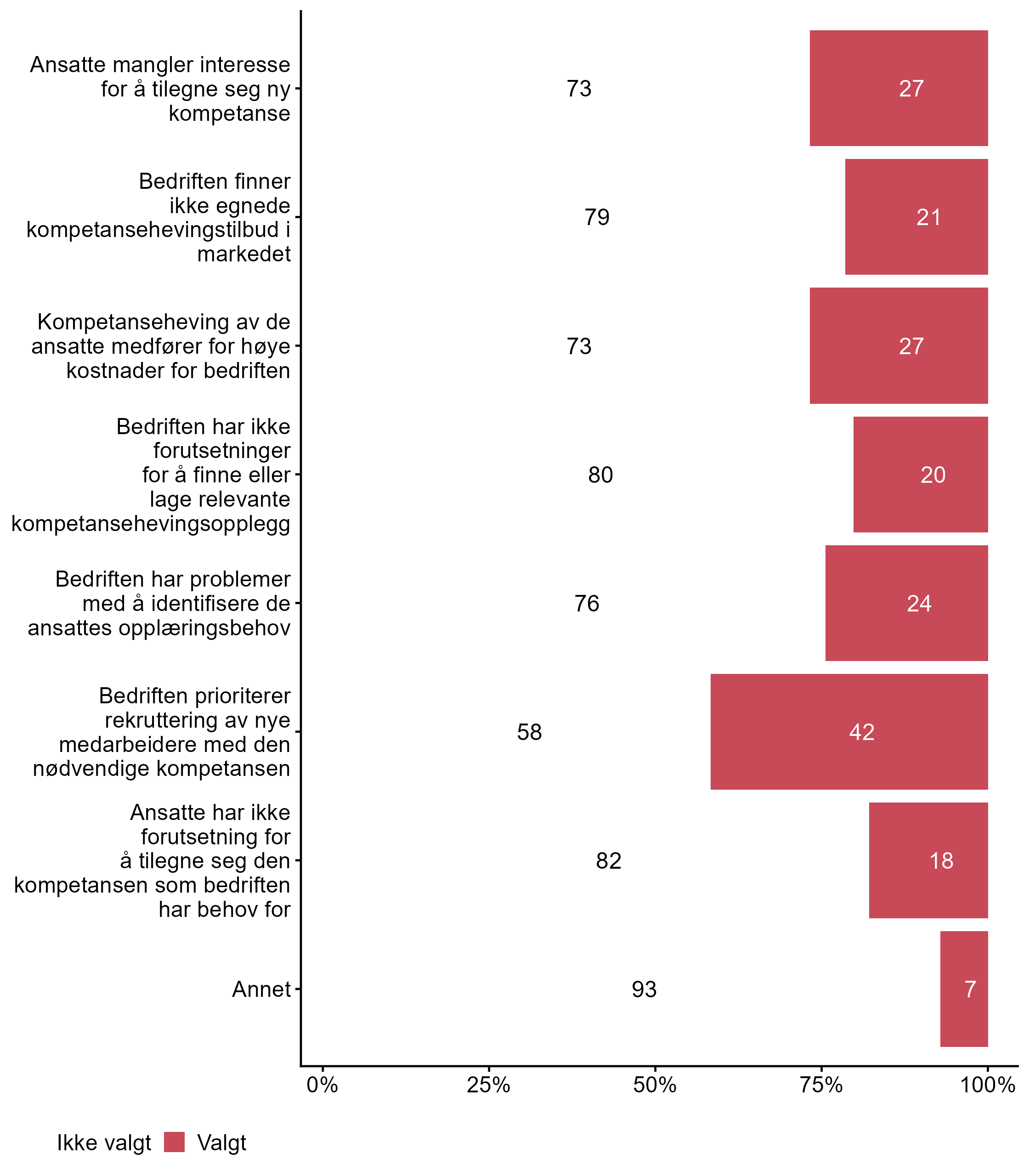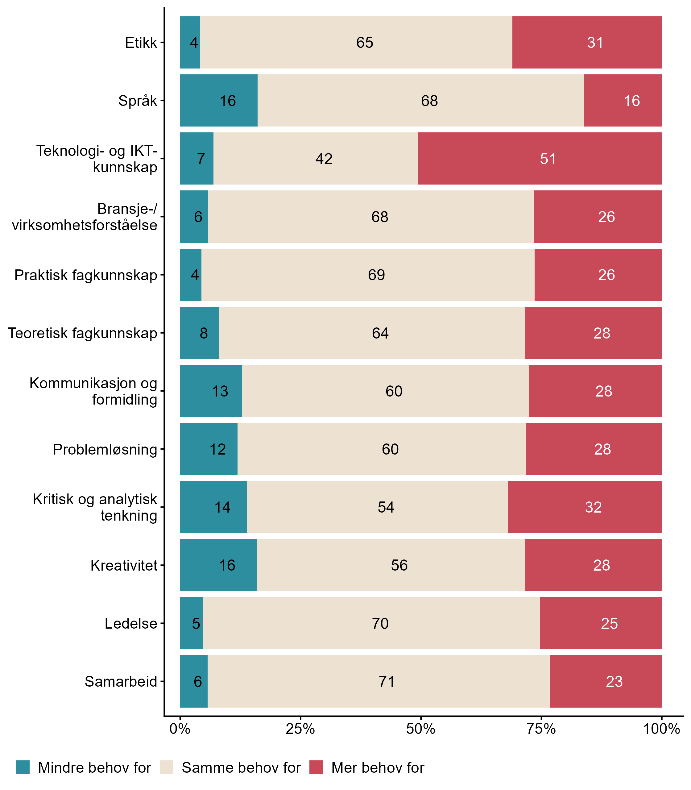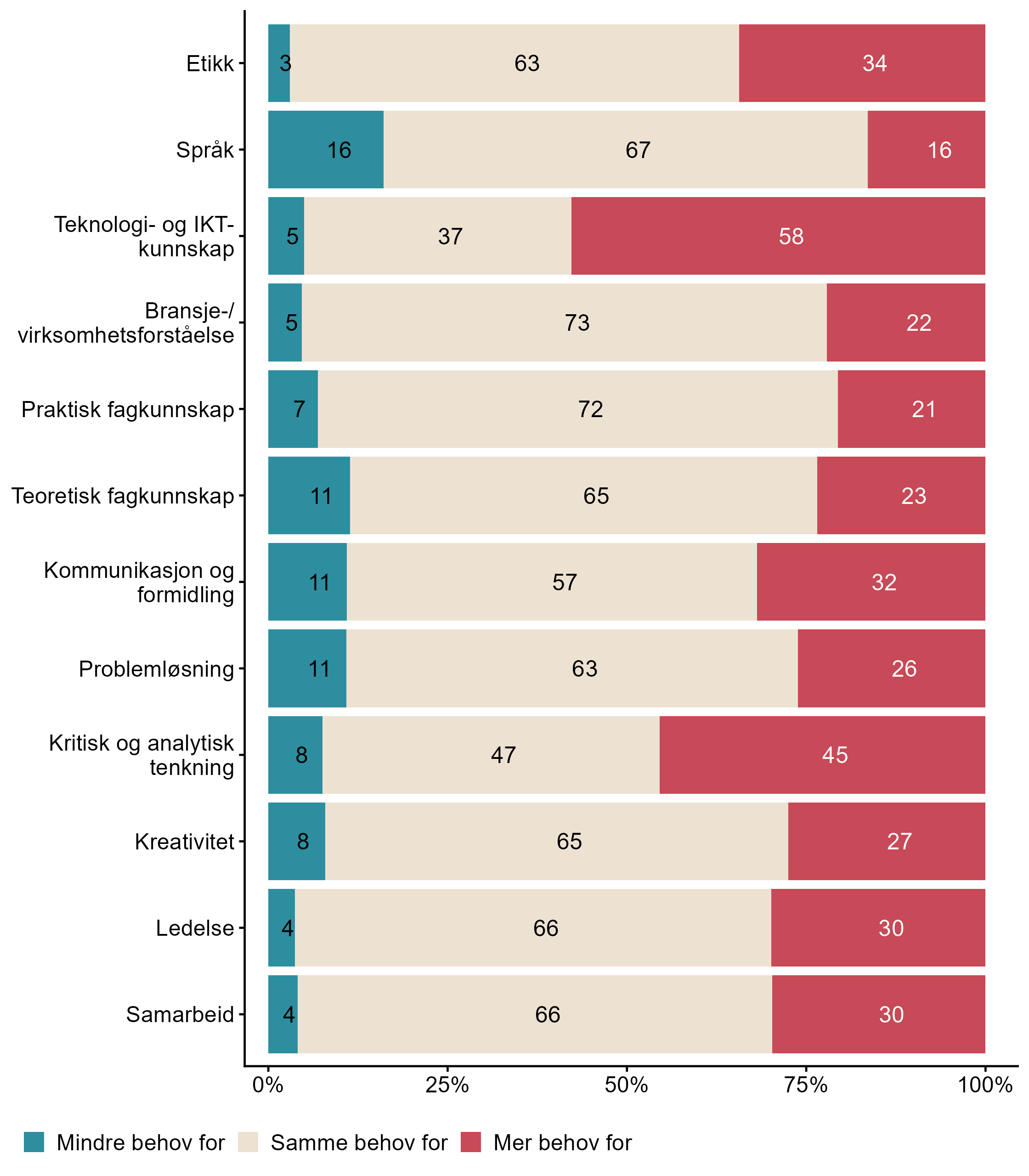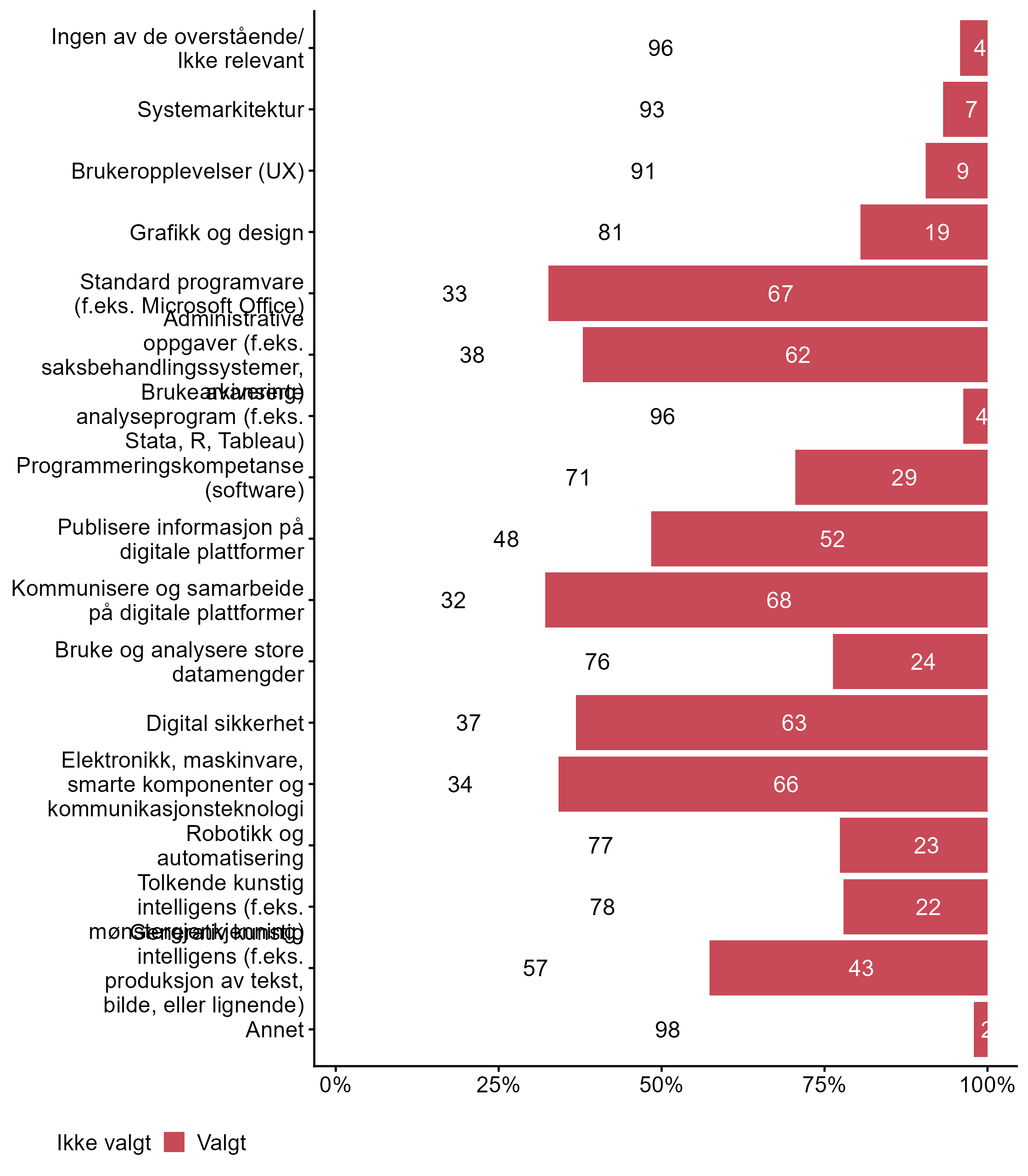 | Generativ kunstig intelligens (f.eks. produksjon av tekst, bilde, eller lignende) Spesialisert IKT-kompetanse | 79 | 21 | 67 |