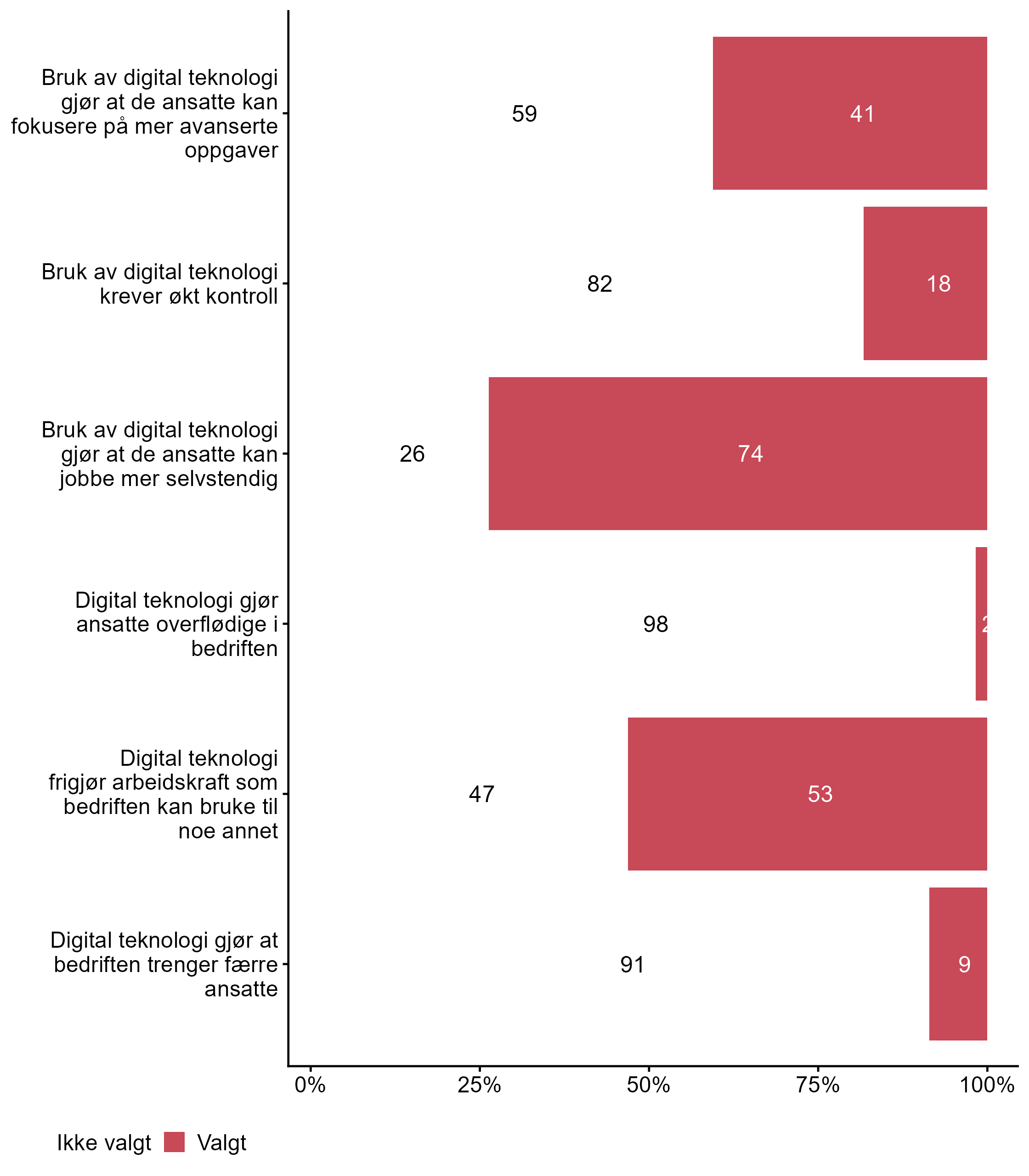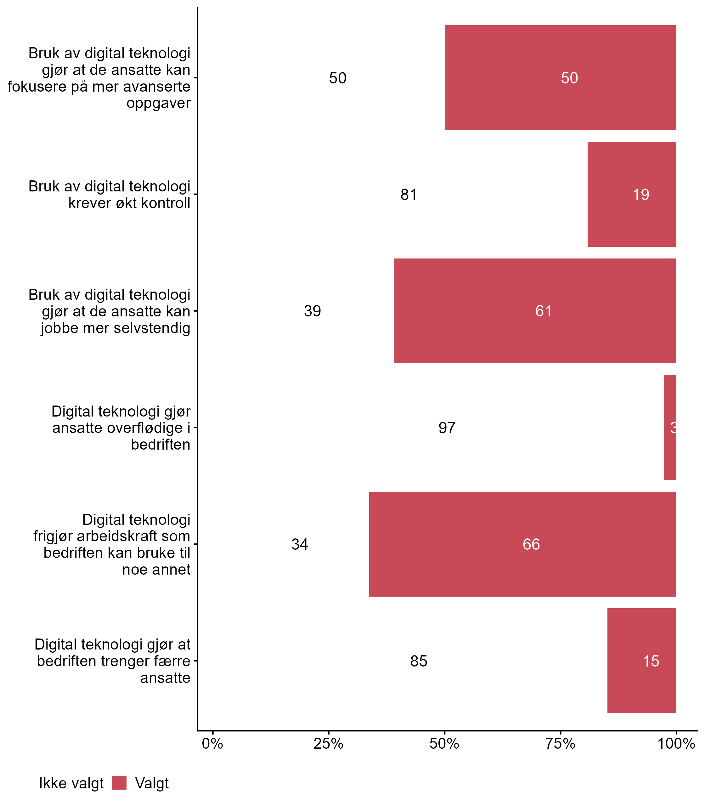 For påstanden Digital teknologi frigjør arbeidskraft som bedriften kan bruke til noe annet var det færre som svarte Valgt i målgruppen (0,53) enn blant andre (0,66). Flere respondenter svarte Valgt på Bruk av digital teknologi gjør at de ansatte kan jobbe mer selvstendig i målgruppen (0,74) enn for alle andre (0,61).