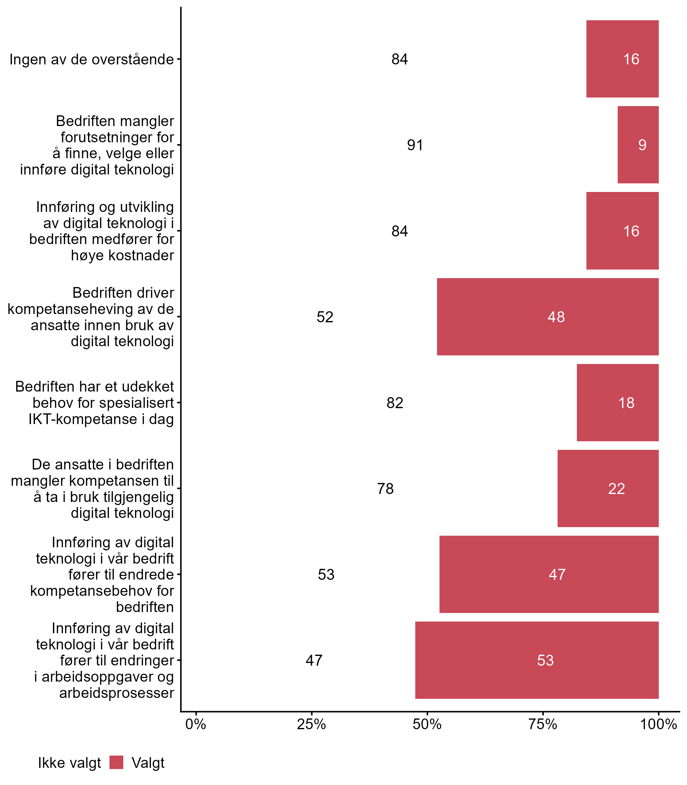 Bedriftene i undersøkelsen fikk spørsmål om IKT og digitalisering, hvilke eventuelle endringer det fører til i bedriften, relevante digitale teknologier, og hvordan digital teknologi påvirker kompetansebehovet for bedriften. I tillegg fikk respondentene en rekke påstander om kunstig intelligens og utfordringer bedriften har knyttet til kompetansebehov innen digital teknologi.