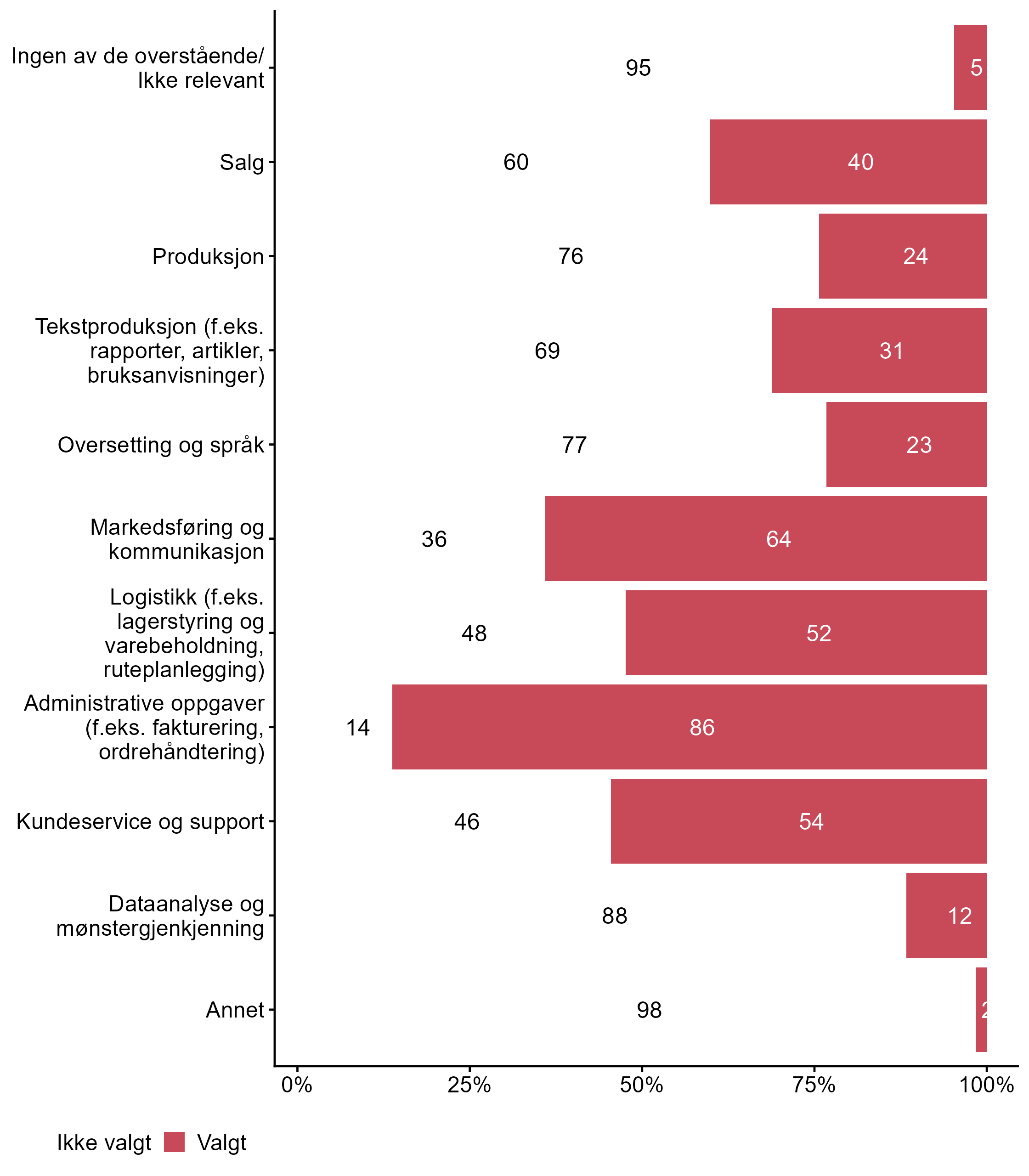 Færre respondenter svarte Valgt for Dataanalyse og mønstergjenkjenning i målgruppen (0,12) enn i andre grupper (0,27). Færre respondenter svarte Valgt for Produksjon i målgruppen (0,24) enn i andre grupper (0,35).