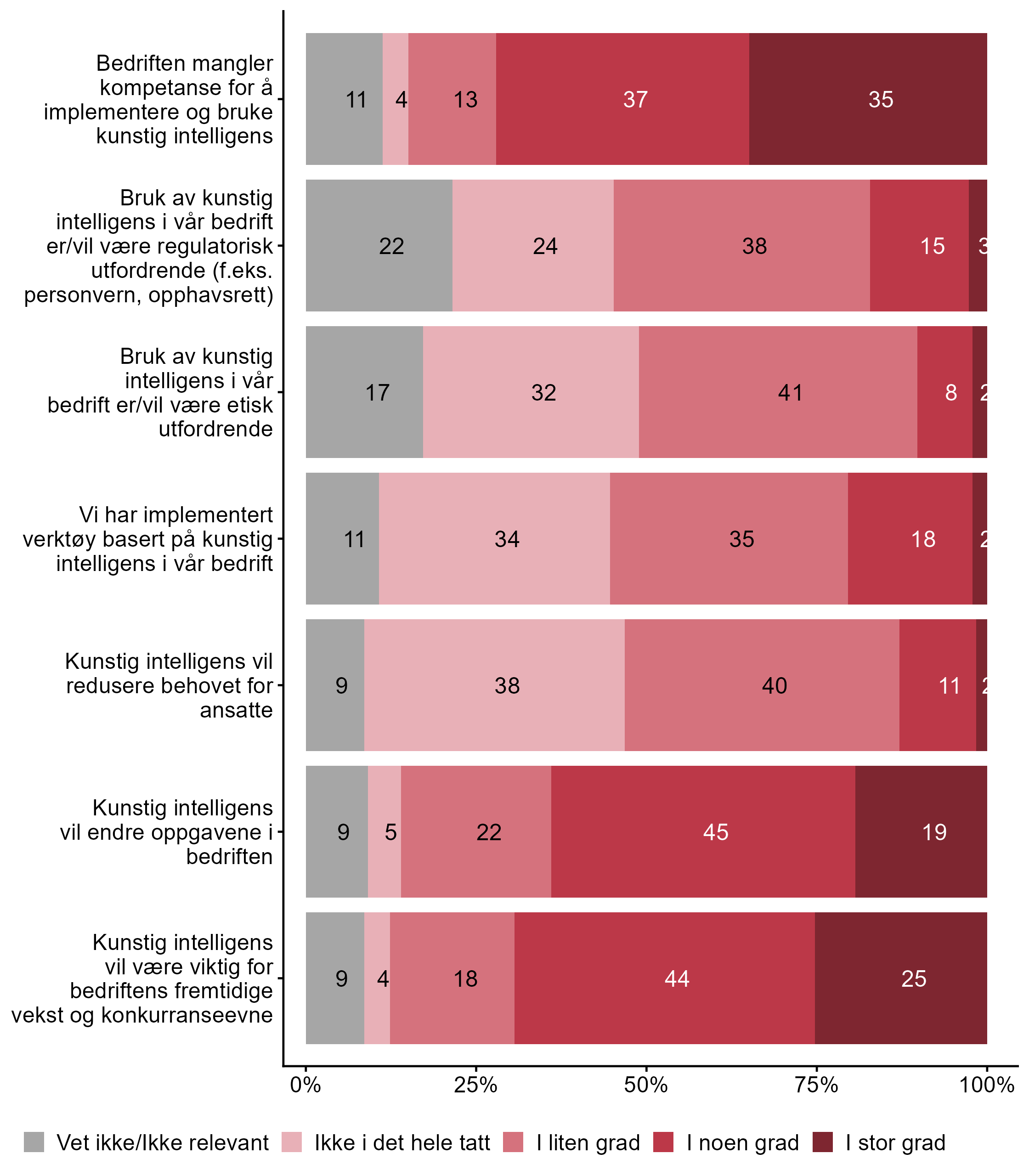 | Generativ kunstig intelligens (f.eks. produksjon av tekst, bilde, eller lignende) Generell IKT-kompetanse blant de ansatte | 16 | 84 | 681 |