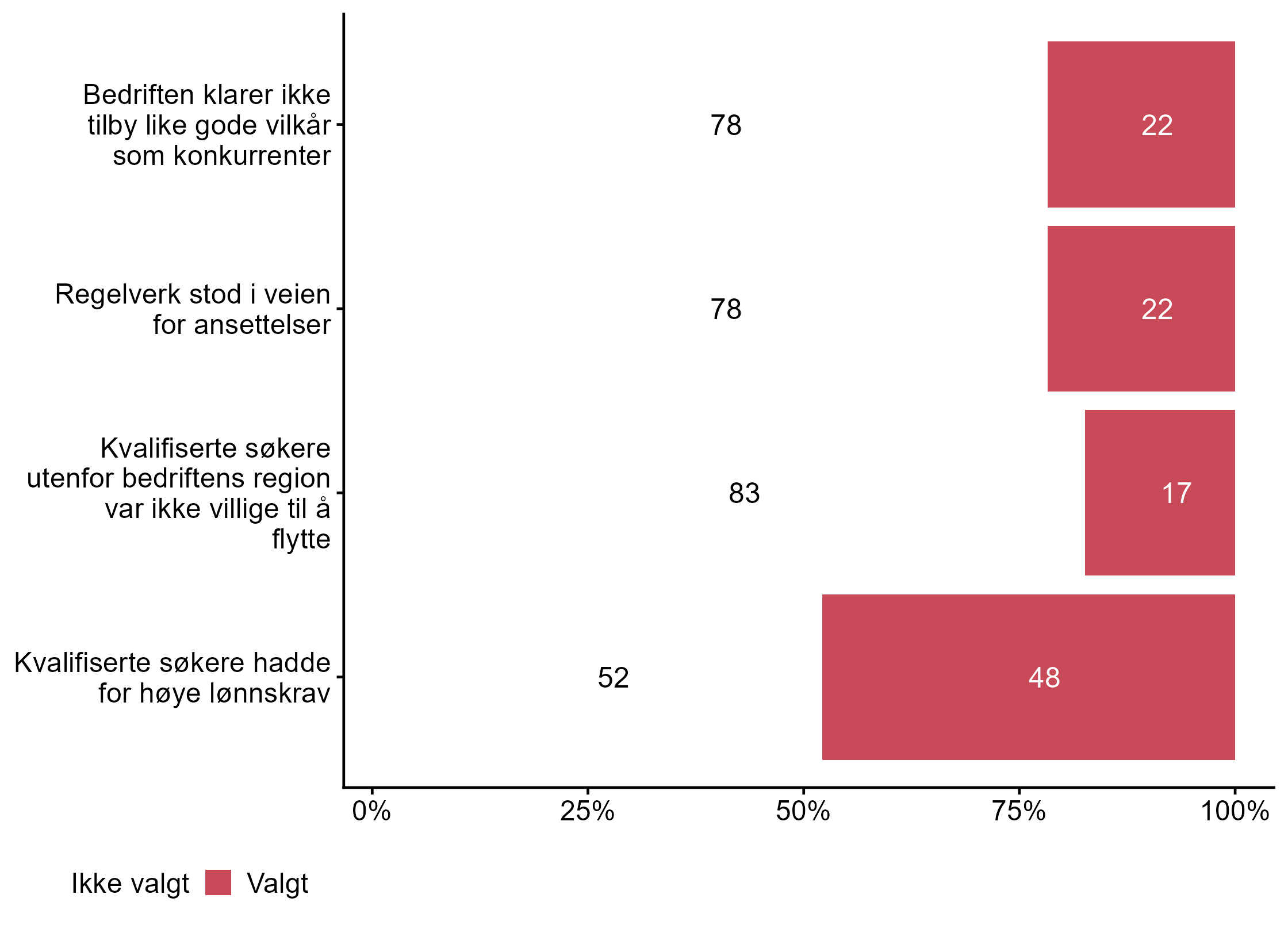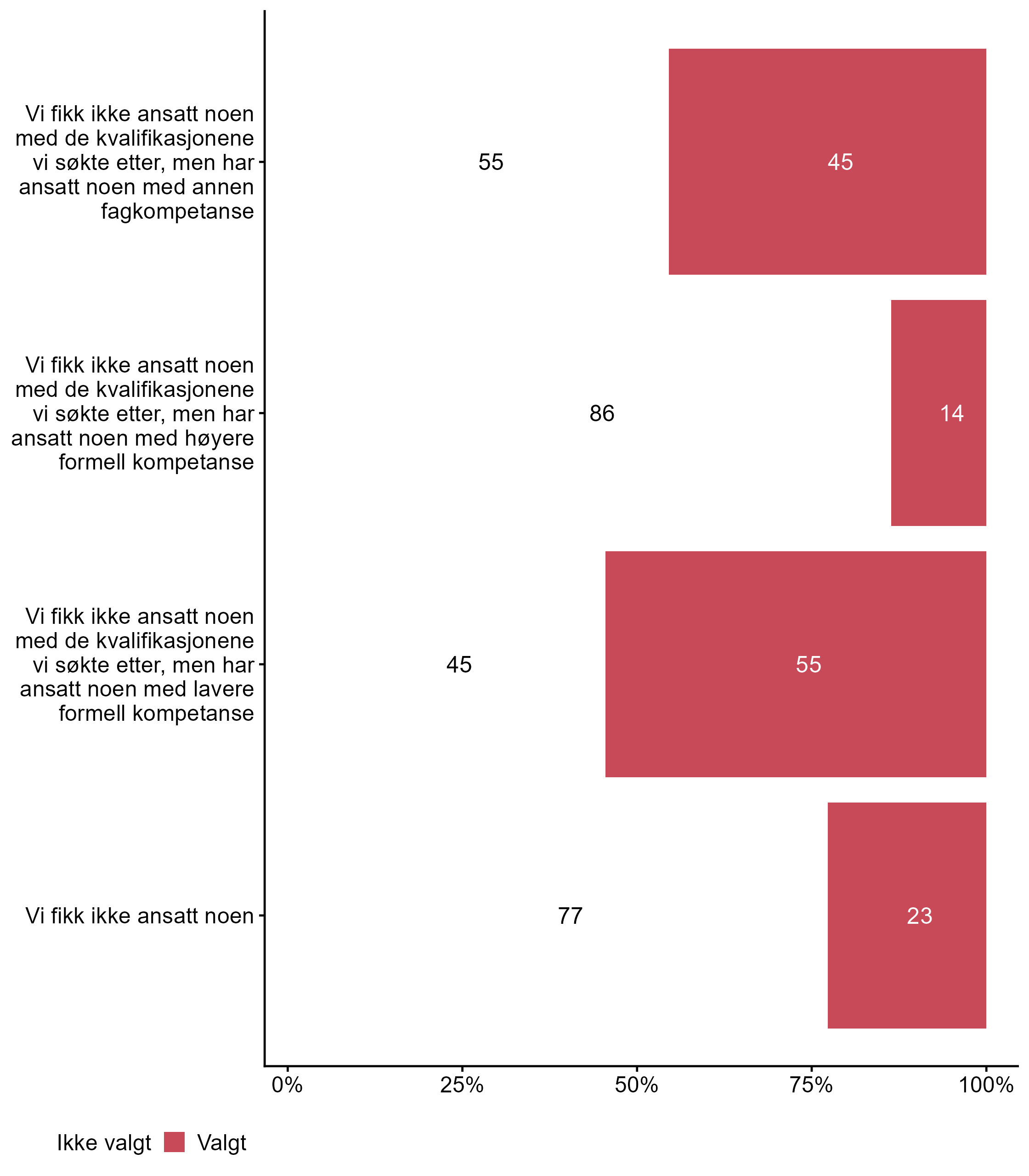Færre respondenter svarte Valgt for Vi fikk ikke ansatt noen i målgruppen (0,23) enn i andre grupper (0,4). Flere respondenter svarte Valgt på Vi fikk ikke ansatt noen med de kvalifikasjonene vi søkte etter, men har ansatt noen med annen fagkompetanse i målgruppen (0,45) enn for alle andre (0,25).