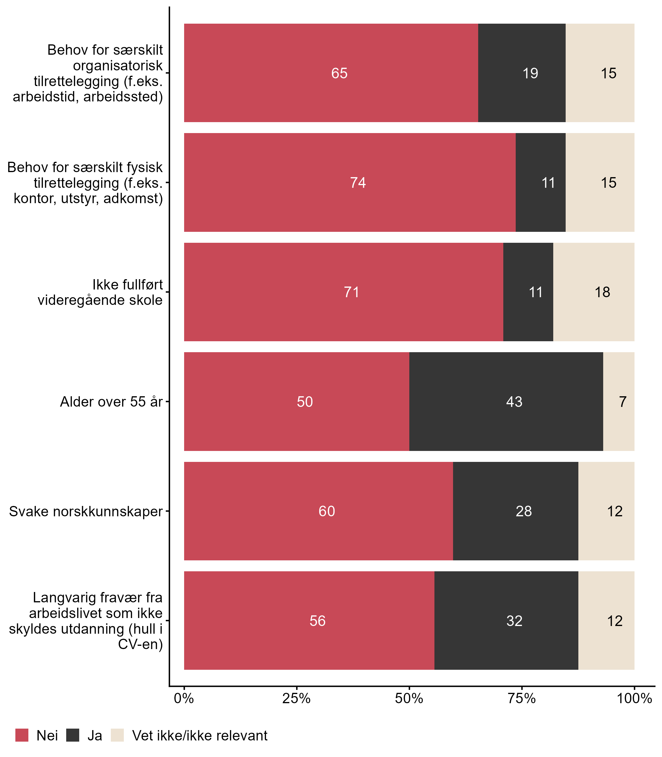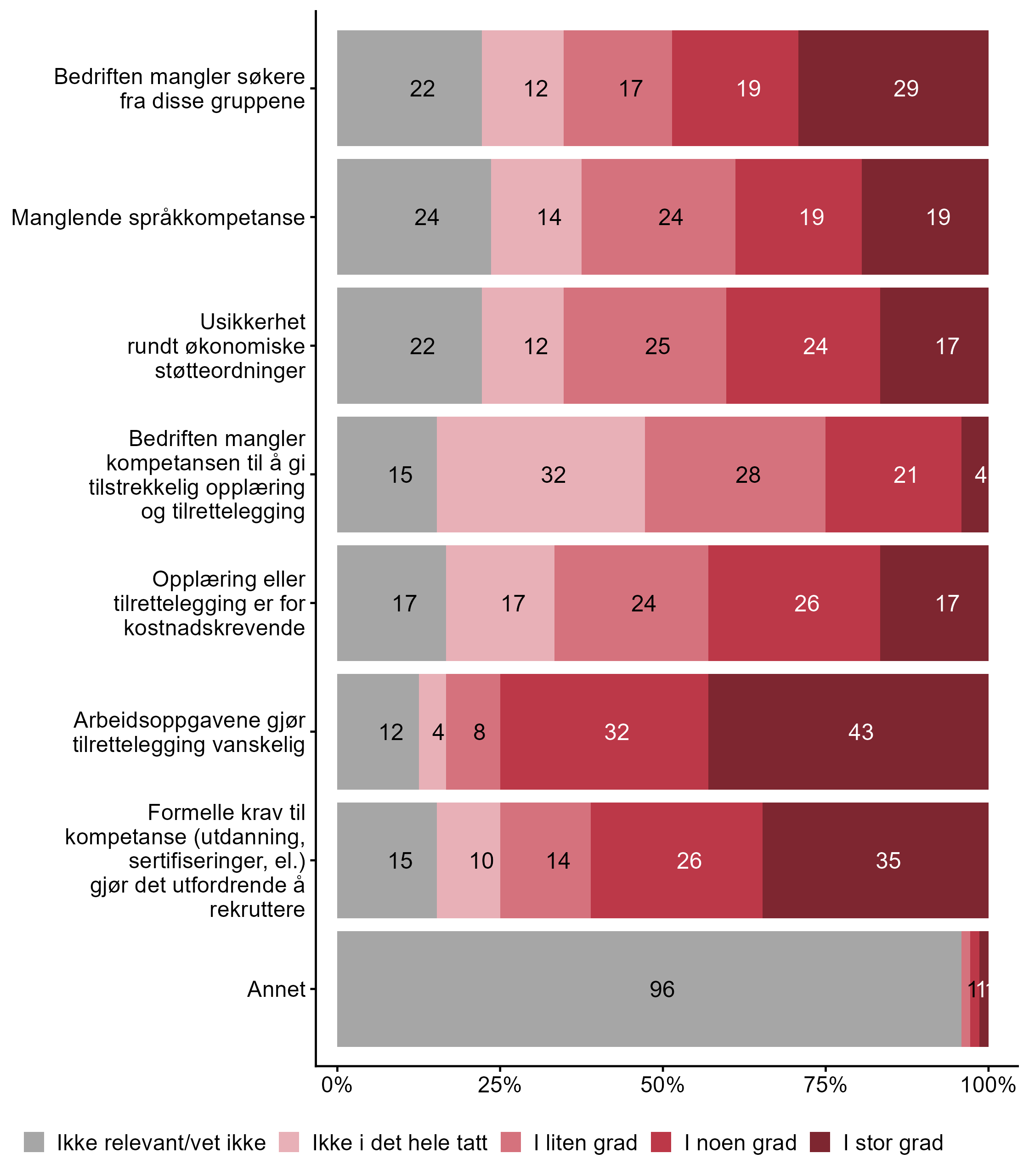 For Formelle krav til kompetanse (utdanning, sertifiseringer, el.) gjør det utfordrende å rekruttere har målgruppen en høyere andel respondenter (0,61) enn alle andre (0,48) som svarte I noen grad eller I stor grad. For Arbeidsoppgavene gjør tilrettelegging vanskelig har målgruppen en høyere andel respondenter (0,75) enn alle andre (0,57) som svarte I noen grad eller I stor grad.