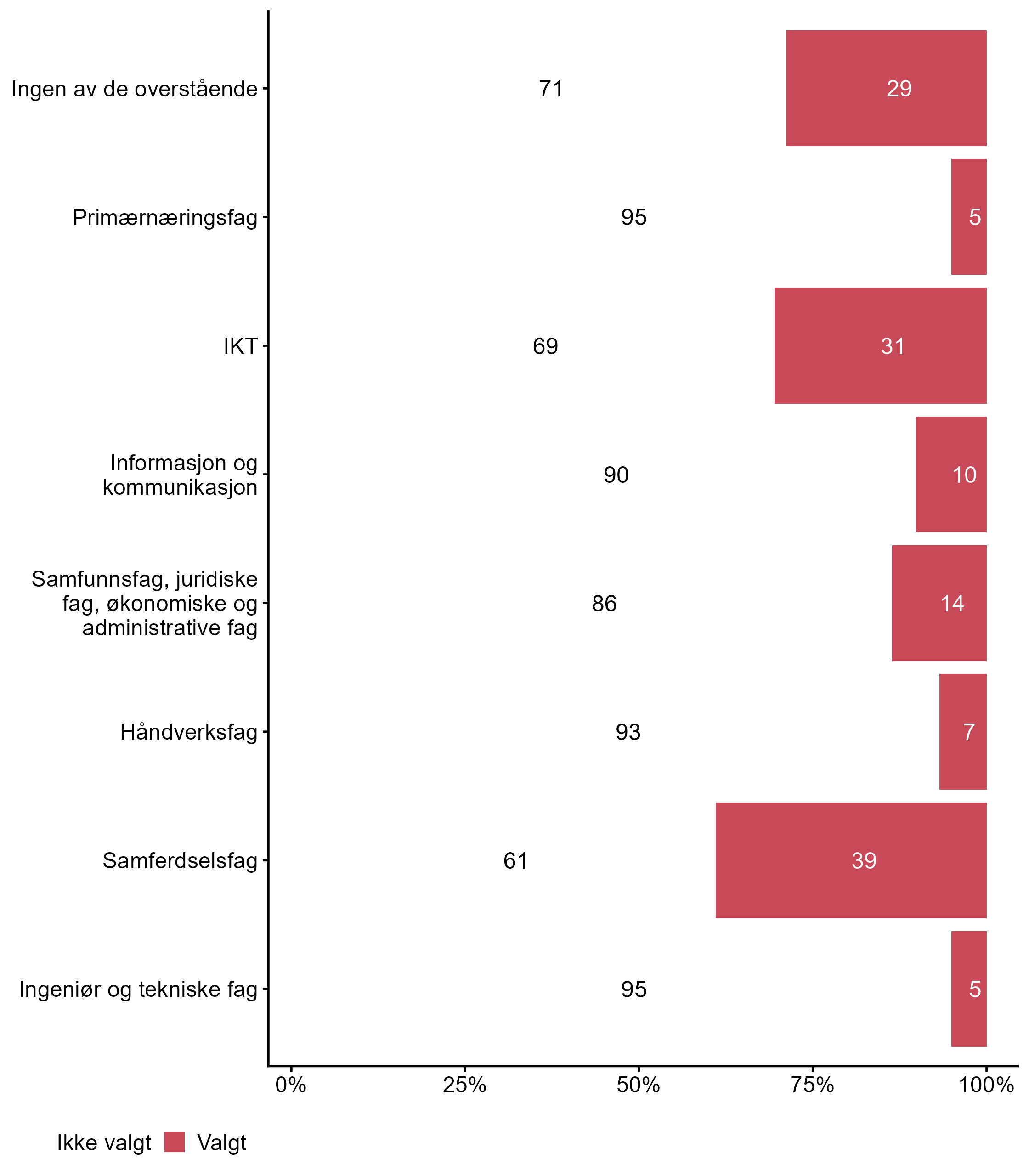 For påstanden Ingeniør og tekniske fag var det færre som svarte Valgt i målgruppen (0,05) enn blant andre (0,37). Flere respondenter svarte Valgt på Samferdselsfag i målgruppen (0,39) enn for alle andre (0,02). Færre respondenter svarte Valgt for Håndverksfag i målgruppen (0,07) enn i andre grupper (0,39). Flere respondenter svarte Valgt på Ingen av de overstående i målgruppen (0,29) enn for alle andre (0,16).