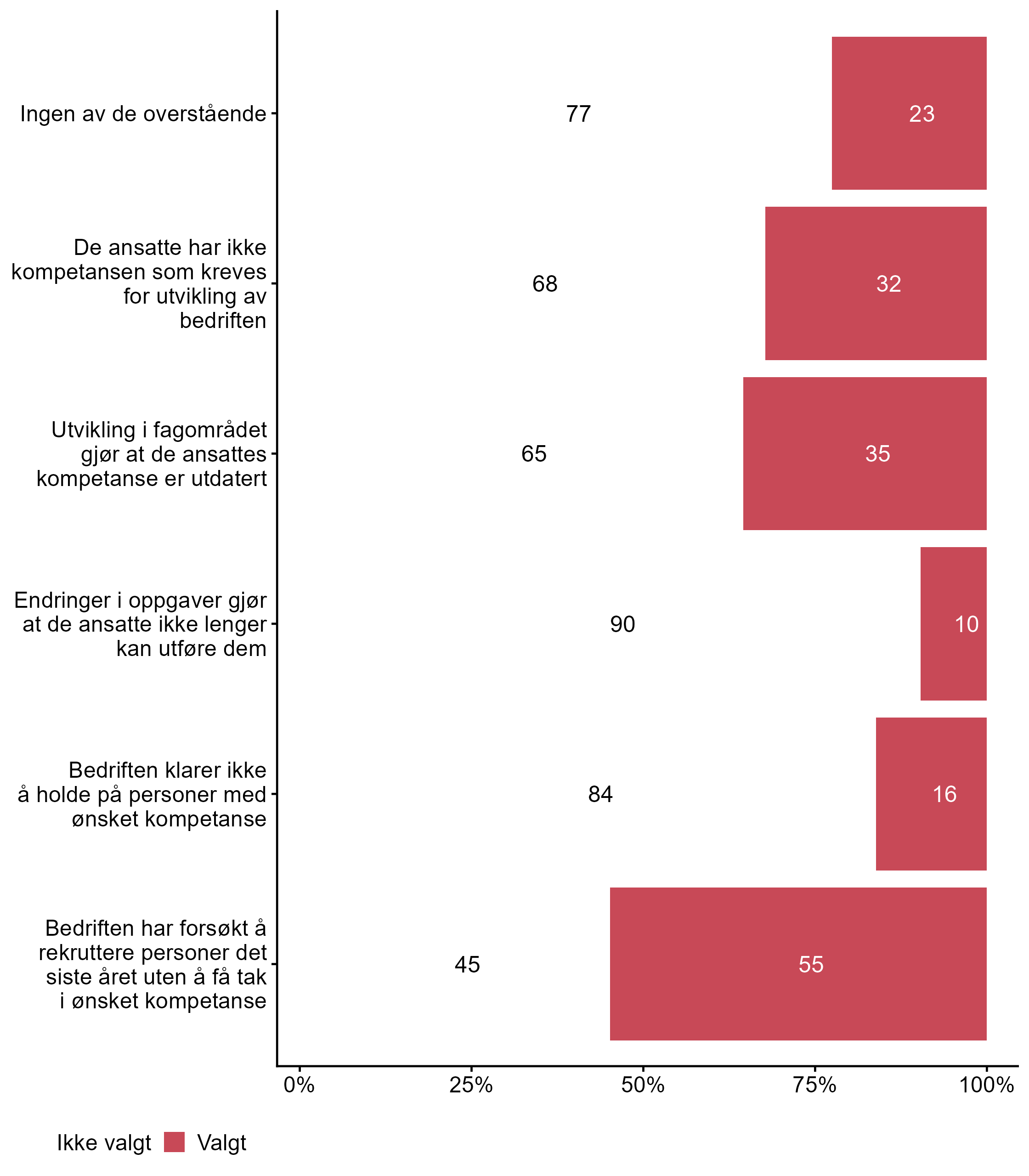 For Utvikling i fagområdet gjør at de ansattes kompetanse er utdatert har målgruppen en høyere andel respondenter (0,35) enn alle andre (0,22) som svarte Valgt.