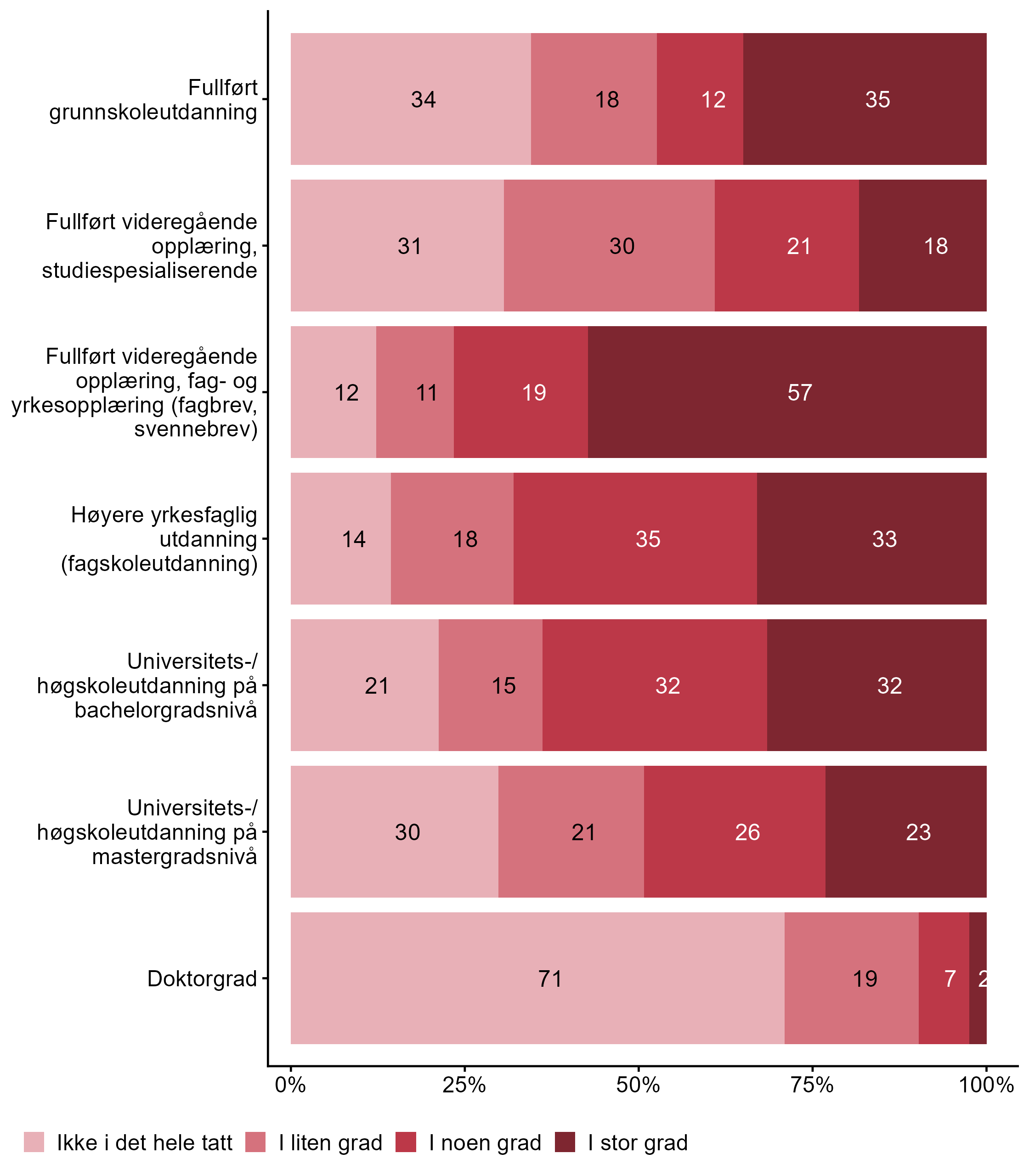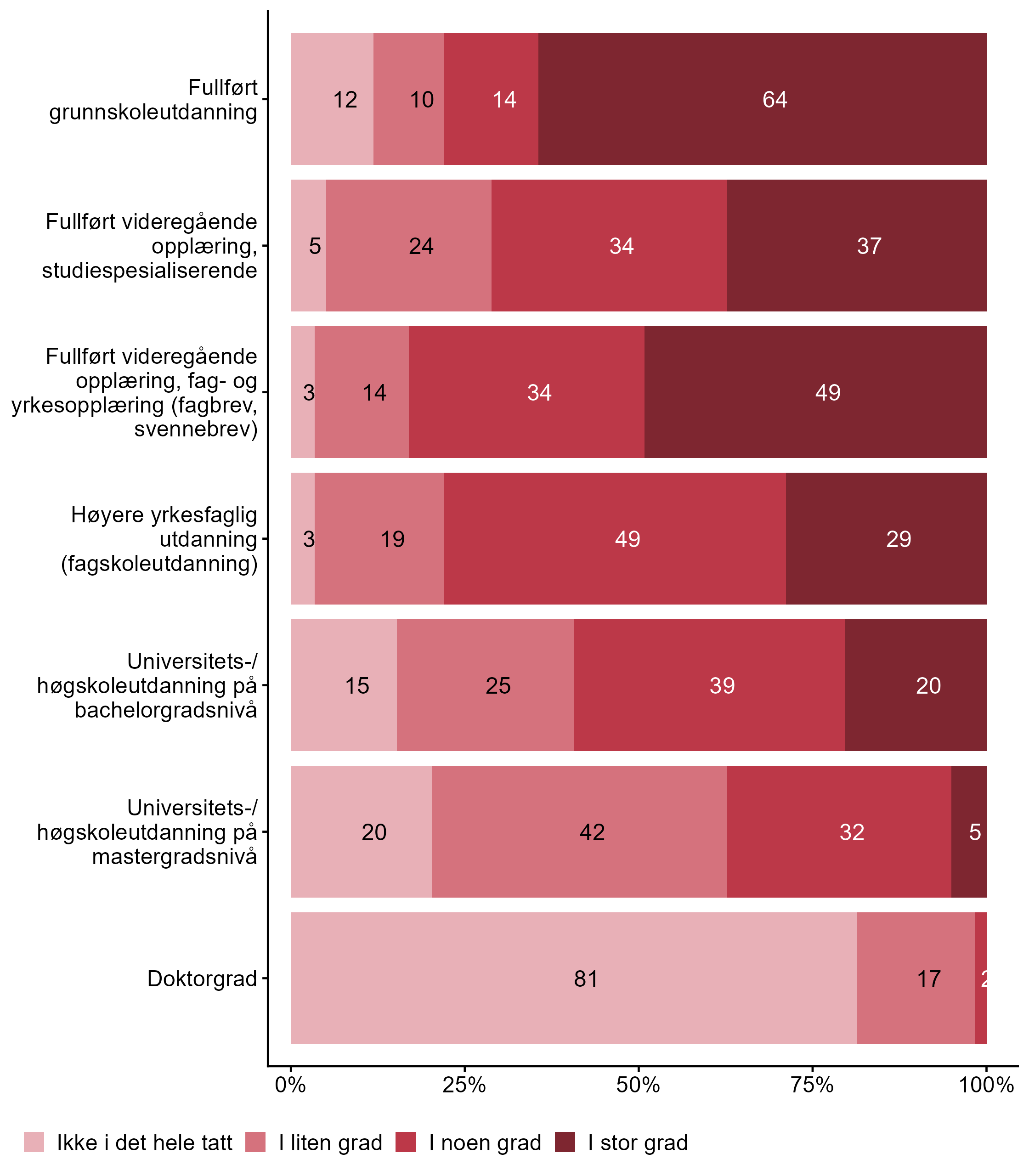Færre respondenter svarte I noen grad eller I stor grad for Universitets-/høgskoleutdanning på mastergradsnivå i målgruppen (0,37) enn i andre grupper (0,49). For Fullført videregående opplæring, studiespesialiserende har målgruppen en høyere andel respondenter (0,71) enn alle andre (0,39) som svarte I noen grad eller I stor grad. For påstanden Fullført grunnskoleutdanning var det flere som svarte I noen grad eller I stor grad i målgruppen (0,78) enn blant andre (0,47).