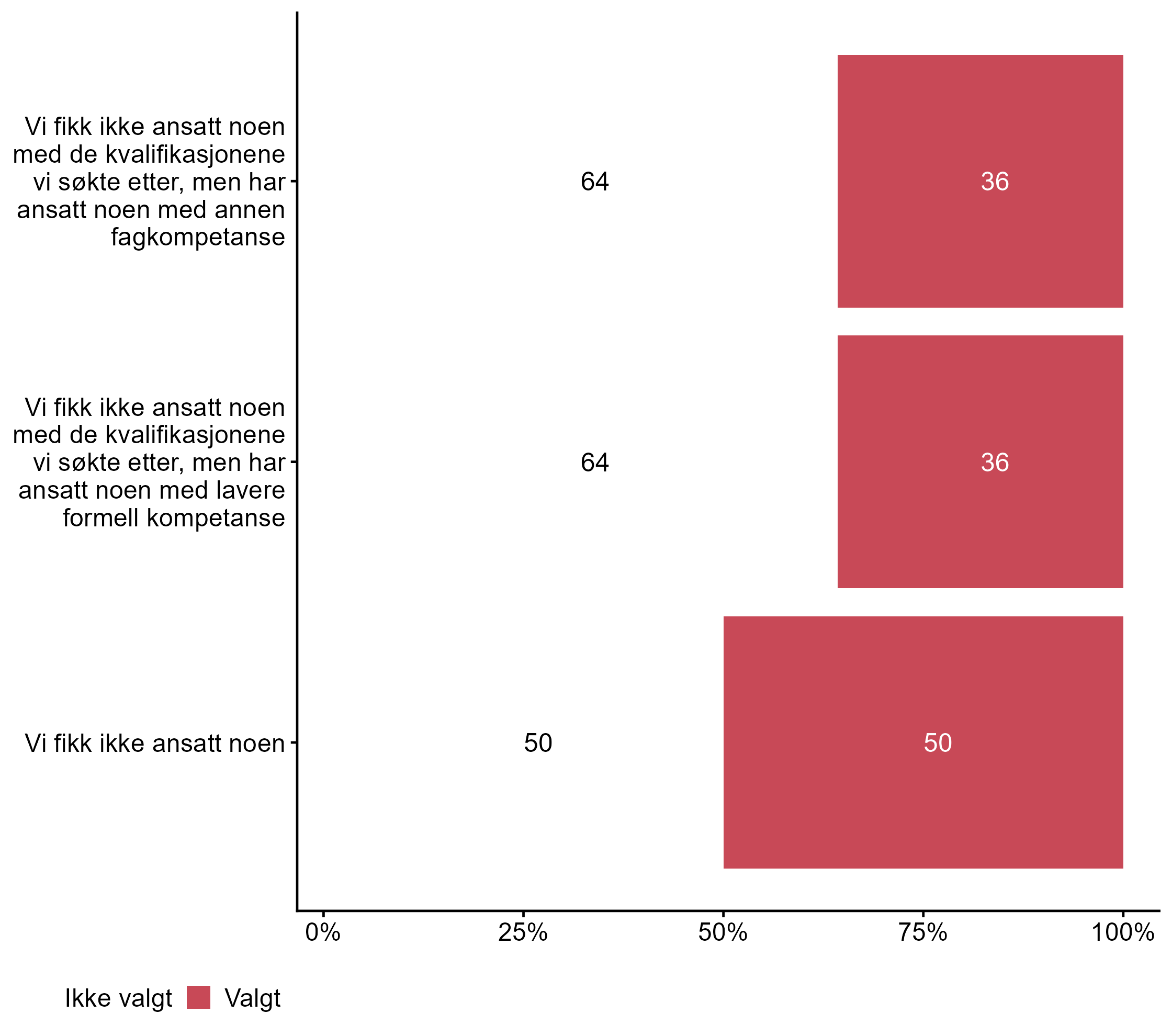 For Vi fikk ikke ansatt noen har målgruppen en høyere andel respondenter (0,5) enn alle andre (0,4) som svarte Valgt. For påstanden Vi fikk ikke ansatt noen med de kvalifikasjonene vi søkte etter, men har ansatt noen med lavere formell kompetanse var det færre som svarte Valgt i målgruppen (0,36) enn blant andre (0,53). For Vi fikk ikke ansatt noen med de kvalifikasjonene vi søkte etter, men har ansatt noen med annen fagkompetanse har målgruppen en høyere andel respondenter (0,36) enn alle andre (0,25) som svarte Valgt.