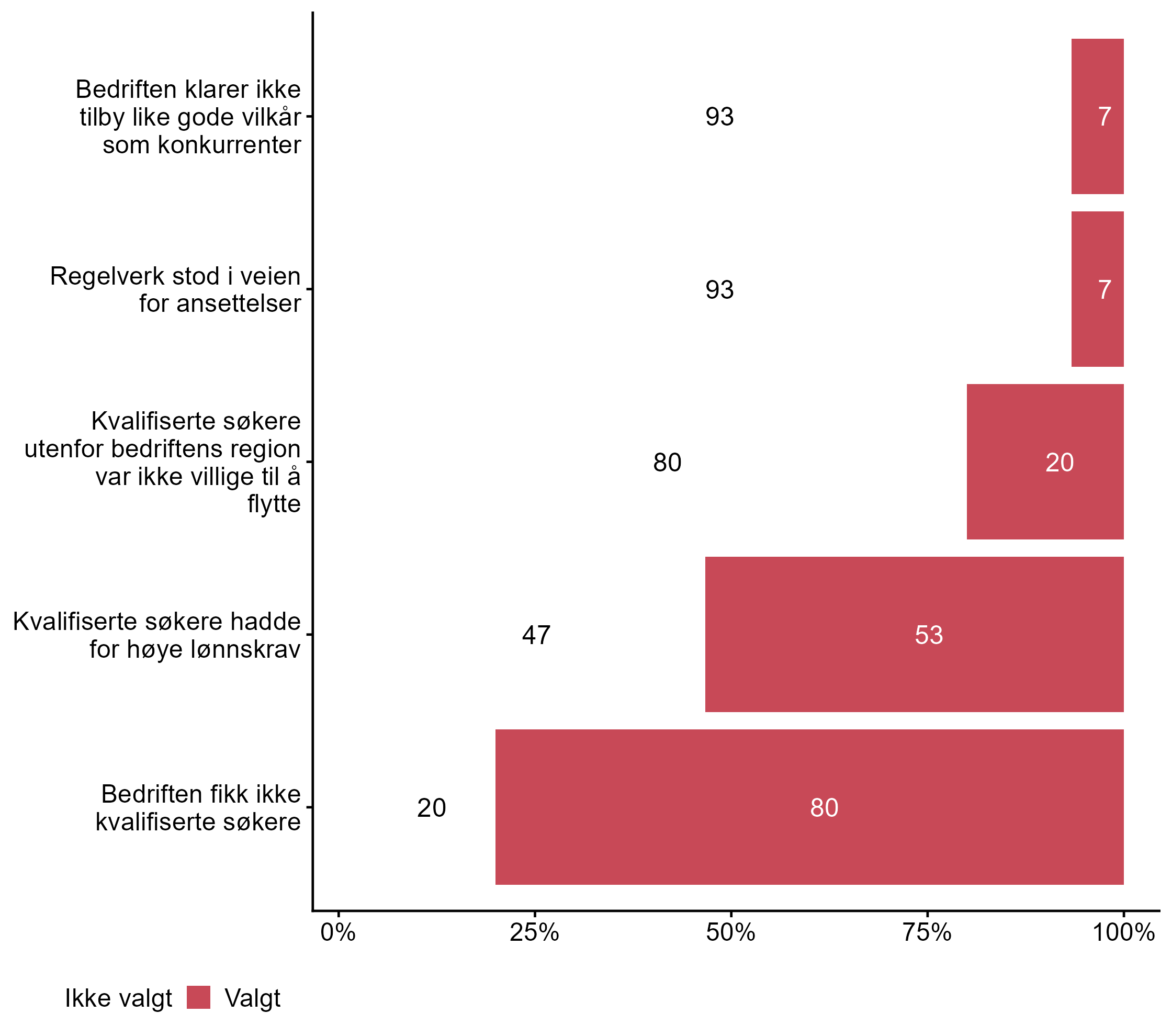 For påstanden Kvalifiserte søkere hadde for høye lønnskrav var det flere som svarte Valgt i målgruppen (0,53) enn blant andre (0,32). For Bedriften klarer ikke tilby like gode vilkår som konkurrenter har målgruppen en lavere andel respondenter (0,07) enn alle andre (0,18) som svarte Valgt.