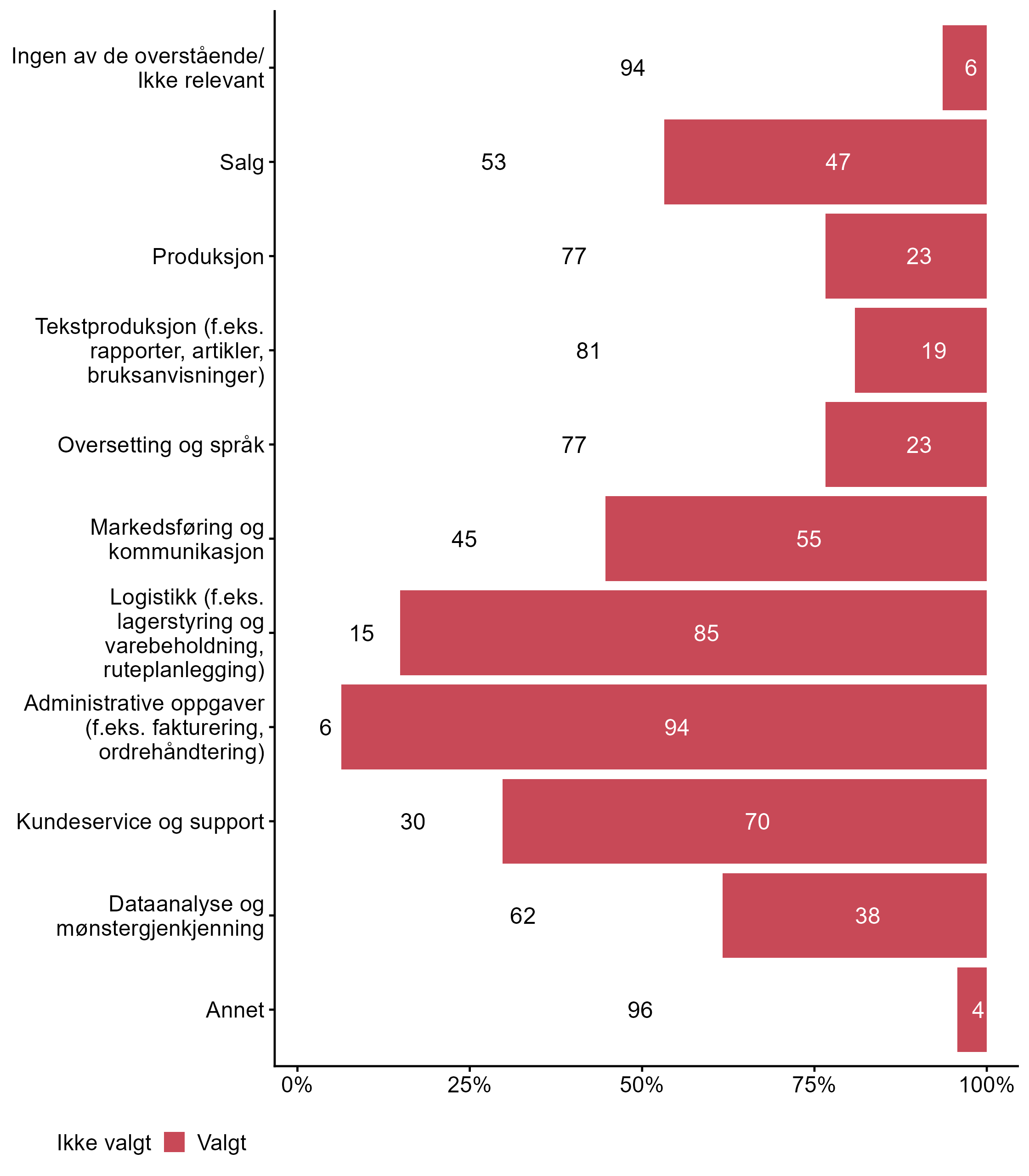 For påstanden Dataanalyse og mønstergjenkjenning var det flere som svarte Valgt i målgruppen (0,38) enn blant andre (0,25). Flere respondenter svarte Valgt på Kundeservice og support i målgruppen (0,7) enn for alle andre (0,56). Flere respondenter svarte Valgt på Logistikk (f.eks. lagerstyring og varebeholdning, ruteplanlegging) i målgruppen (0,85) enn for alle andre (0,49). For Markedsføring og kommunikasjon har målgruppen en lavere andel respondenter (0,55) enn alle andre (0,67) som svarte Valgt. For påstanden Tekstproduksjon (f.eks. rapporter, artikler, bruksanvisninger) var det færre som svarte Valgt i målgruppen (0,19) enn blant andre (0,37). Færre respondenter svarte Valgt for Produksjon i målgruppen (0,23) enn i andre grupper (0,34).