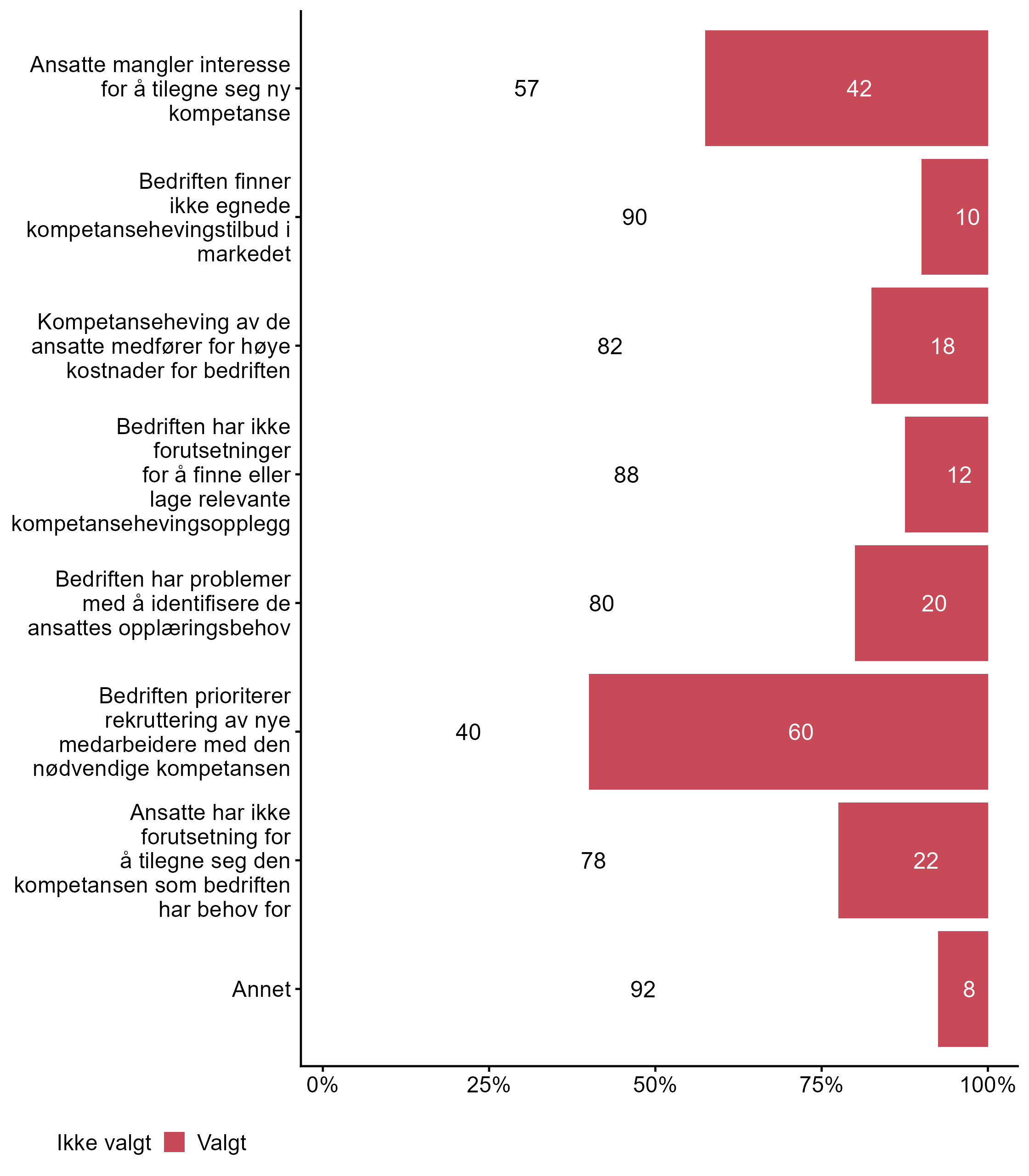 For påstanden Bedriften prioriterer rekruttering av nye medarbeidere med den nødvendige kompetansen var det flere som svarte Valgt i målgruppen (0,6) enn blant andre (0,44). For påstanden Ansatte mangler interesse for å tilegne seg ny kompetanse var det flere som svarte Valgt i målgruppen (0,42) enn blant andre (0,27).