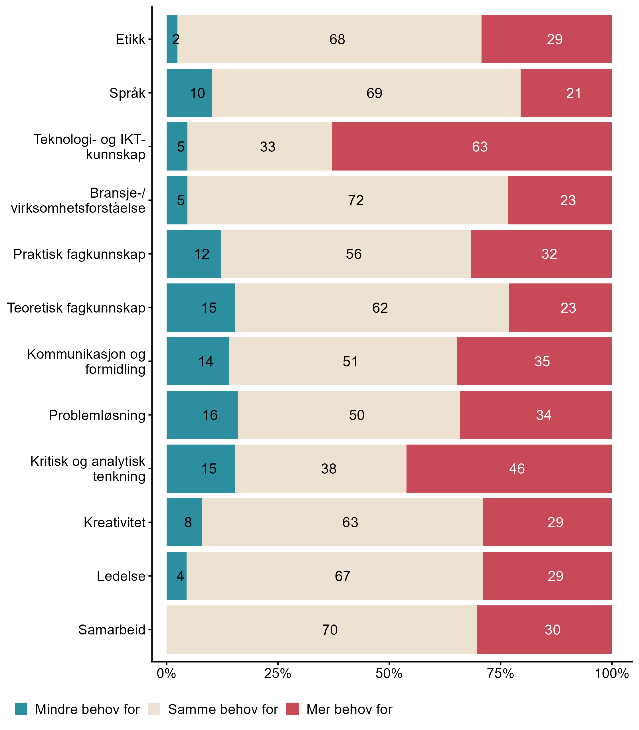 | Bruke avanserte analyseprogram (f.eks. Stata, R, Tableau) Spesialisert IKT-kompetanse | 34 | 66 | 128 |