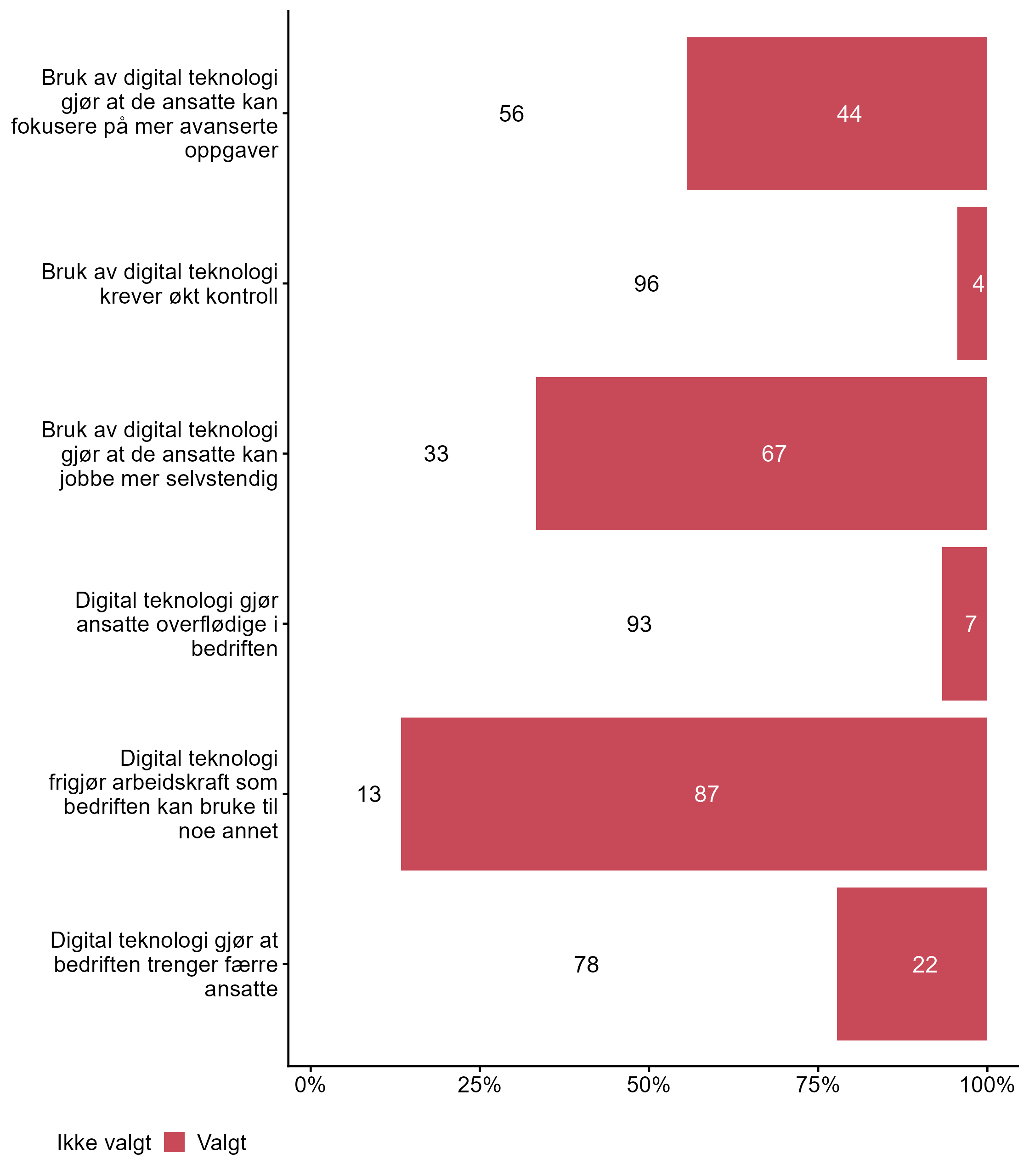 Flere respondenter svarte Valgt på Digital teknologi frigjør arbeidskraft som bedriften kan bruke til noe annet i målgruppen (0,87) enn for alle andre (0,65). Færre respondenter svarte Valgt for Bruk av digital teknologi krever økt kontroll i målgruppen (0,04) enn i andre grupper (0,19).