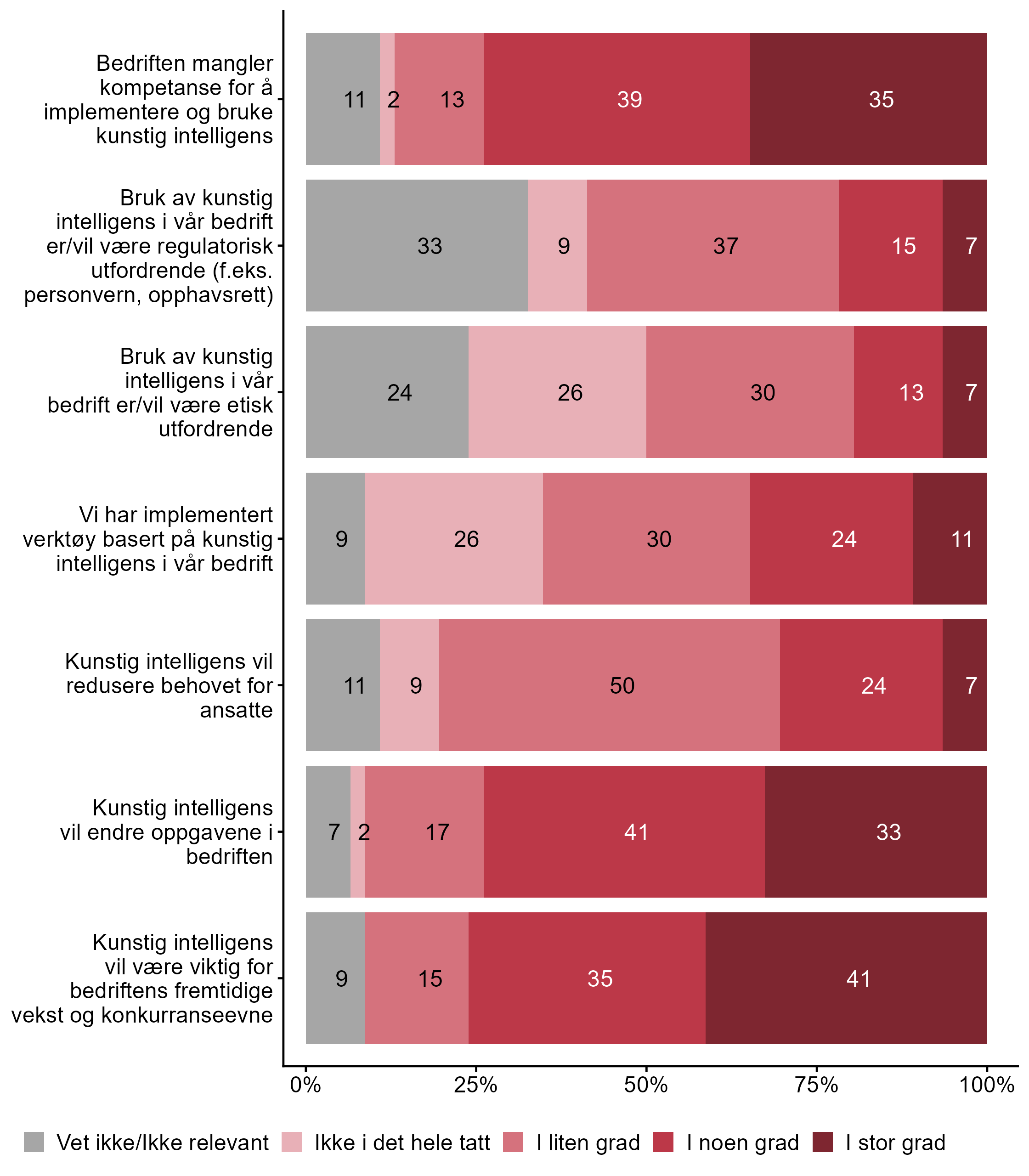 | Generativ kunstig intelligens (f.eks. produksjon av tekst, bilde, eller lignende) Generell IKT-kompetanse blant de ansatte | 15 | 85 | 13 |