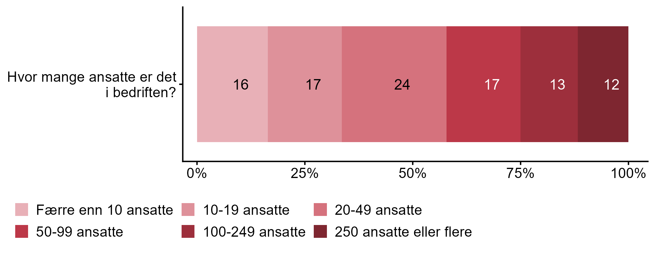 Kapittelet viser en overordnet fordeling på antall ansatte i bedrifter som har deltatt i undersøkelsen i figur 1, hvor stor andel av bedriftene som har svart fra hvert fylke i tabell 1, og andelen fordelt på sentralitet i tabell 2. Der det har vært mer oversiktlig å presentere sentralitet på en 3-delt skala har vi gjort dette.