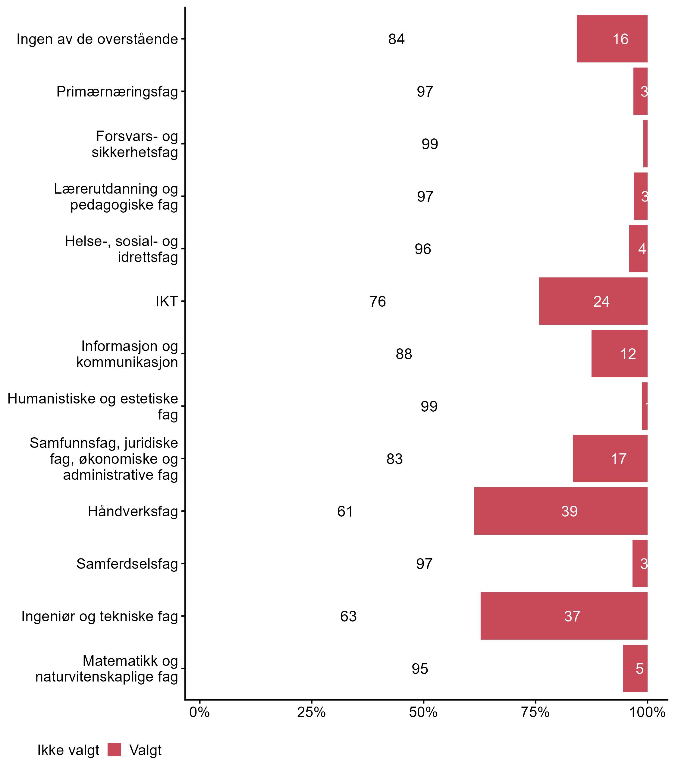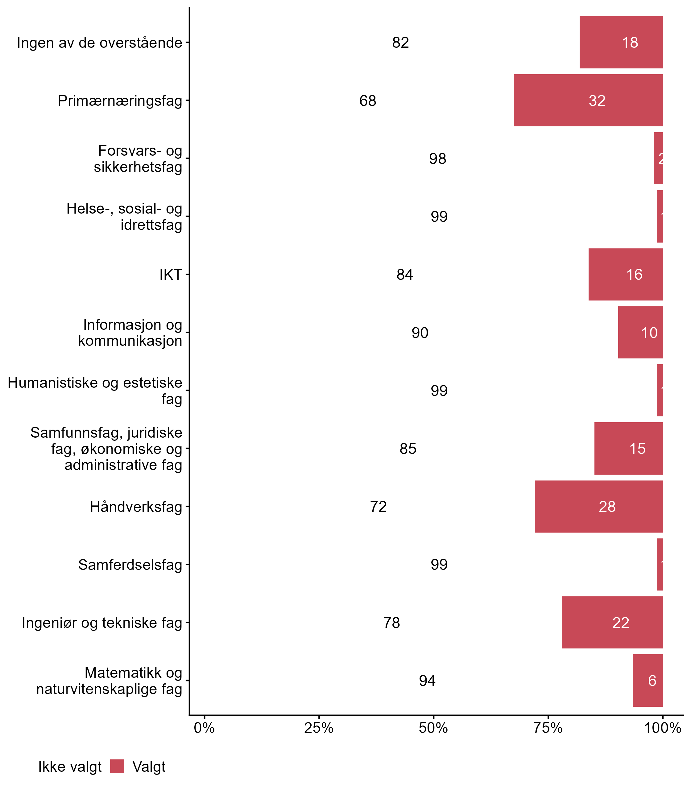 For Ingeniør og tekniske fag har målgruppen en lavere andel respondenter (0,22) enn alle andre (0,37) som svarte Valgt. For Håndverksfag har målgruppen en lavere andel respondenter (0,28) enn alle andre (0,39) som svarte Valgt. For Primærnæringsfag har målgruppen en høyere andel respondenter (0,32) enn alle andre (0,03) som svarte Valgt.