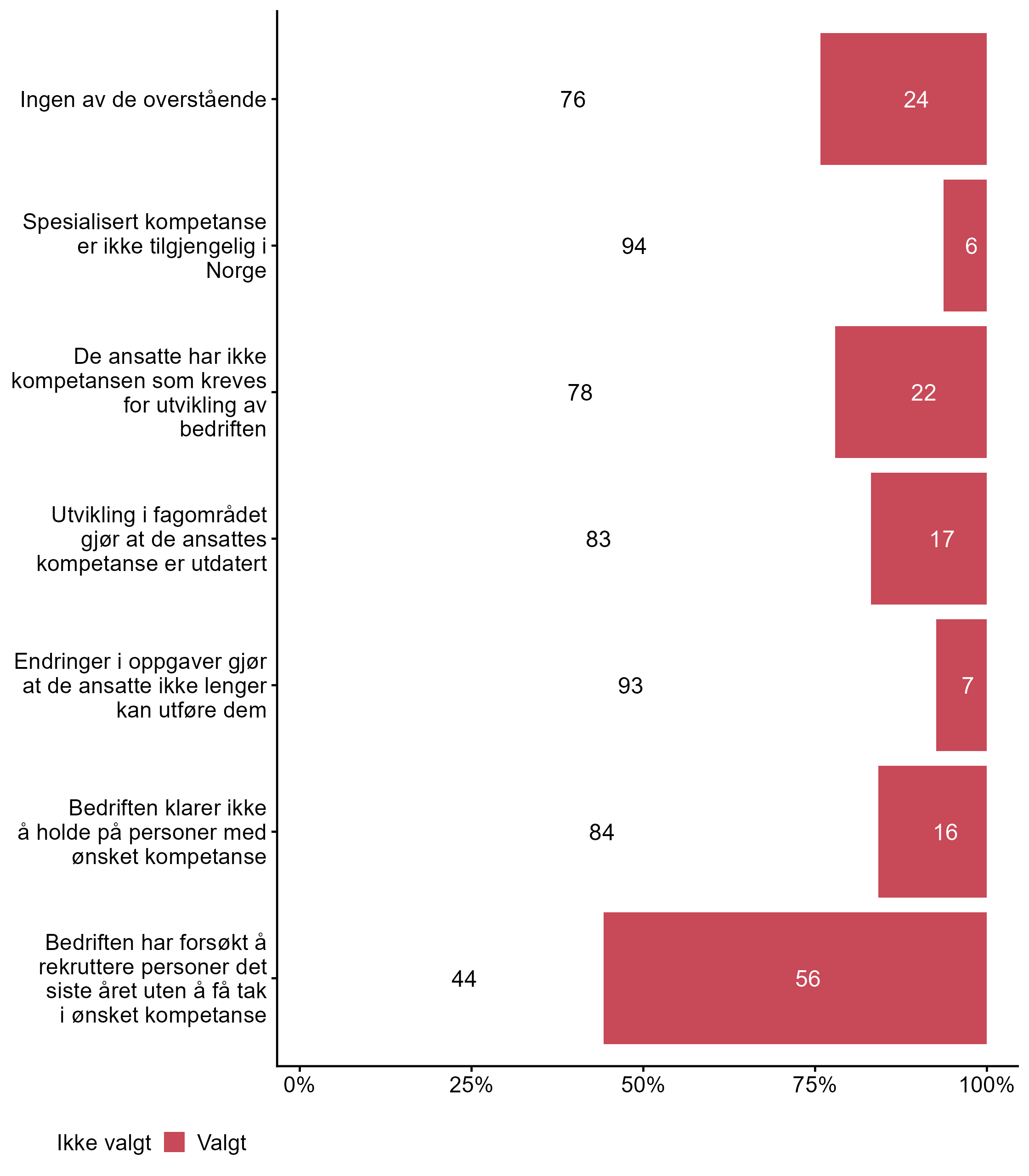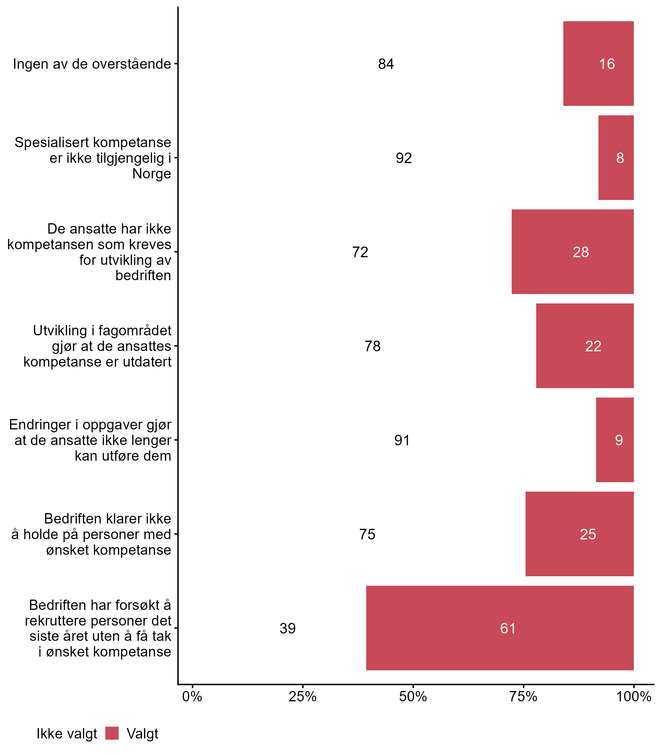 I dette kapittelet kan du sammenligne NHO Mat og Drikke med andre bedrifters svar på spørsmål om kompetansebehov. Dette inkluderer i hvilken grad bedriften har behov for kompetanse innen spesifikke fagområder og utdanningsnivåer, samt årsaker til, og konsekvenser av, kompetansebehovet, og hvilke tiltak bedriften har for å dekke kompetansebehovet.