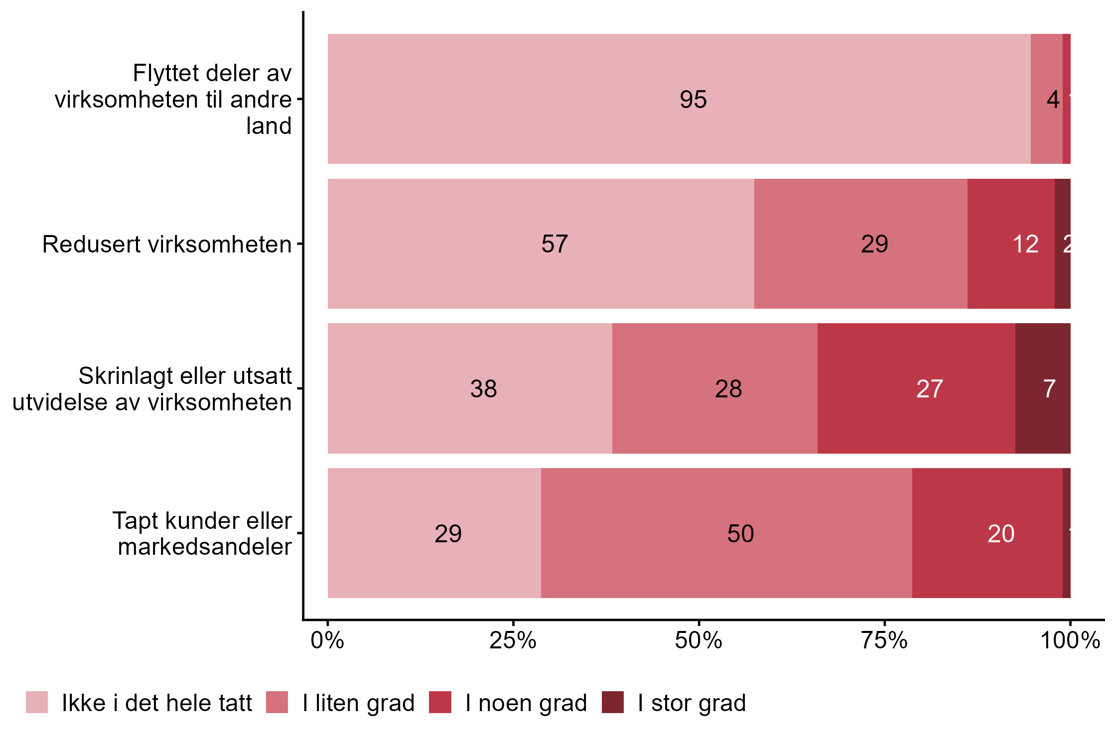 For påstanden Tapt kunder eller markedsandeler var det færre som svarte I noen grad eller I stor grad i målgruppen (0,21) enn blant andre (0,39). Færre respondenter svarte I noen grad eller I stor grad for Redusert virksomheten i målgruppen (0,14) enn i andre grupper (0,25).