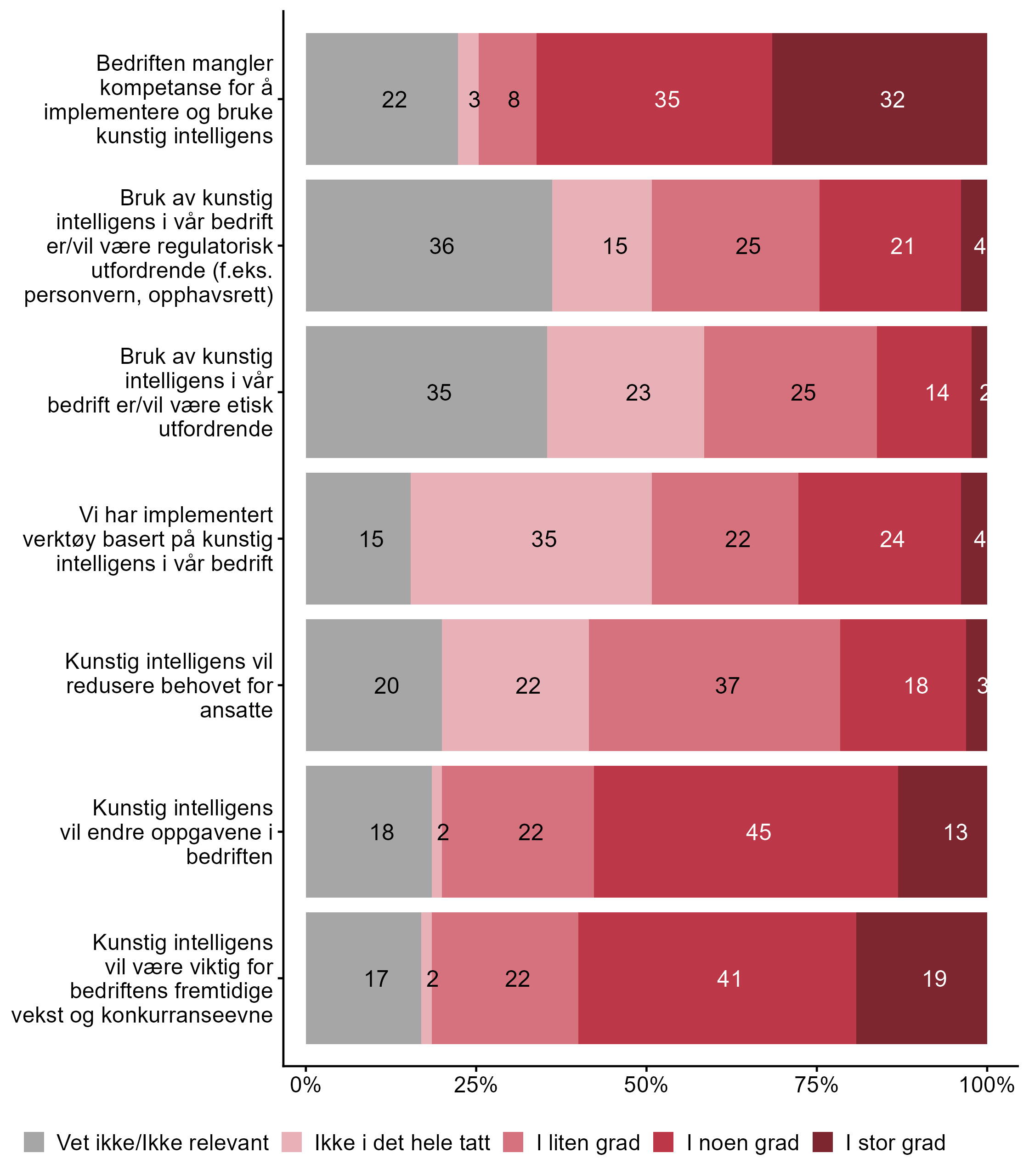 | Generativ kunstig intelligens (f.eks. produksjon av tekst, bilde, eller lignende) Generell IKT-kompetanse blant de ansatte | 16 | 84 | 31 |