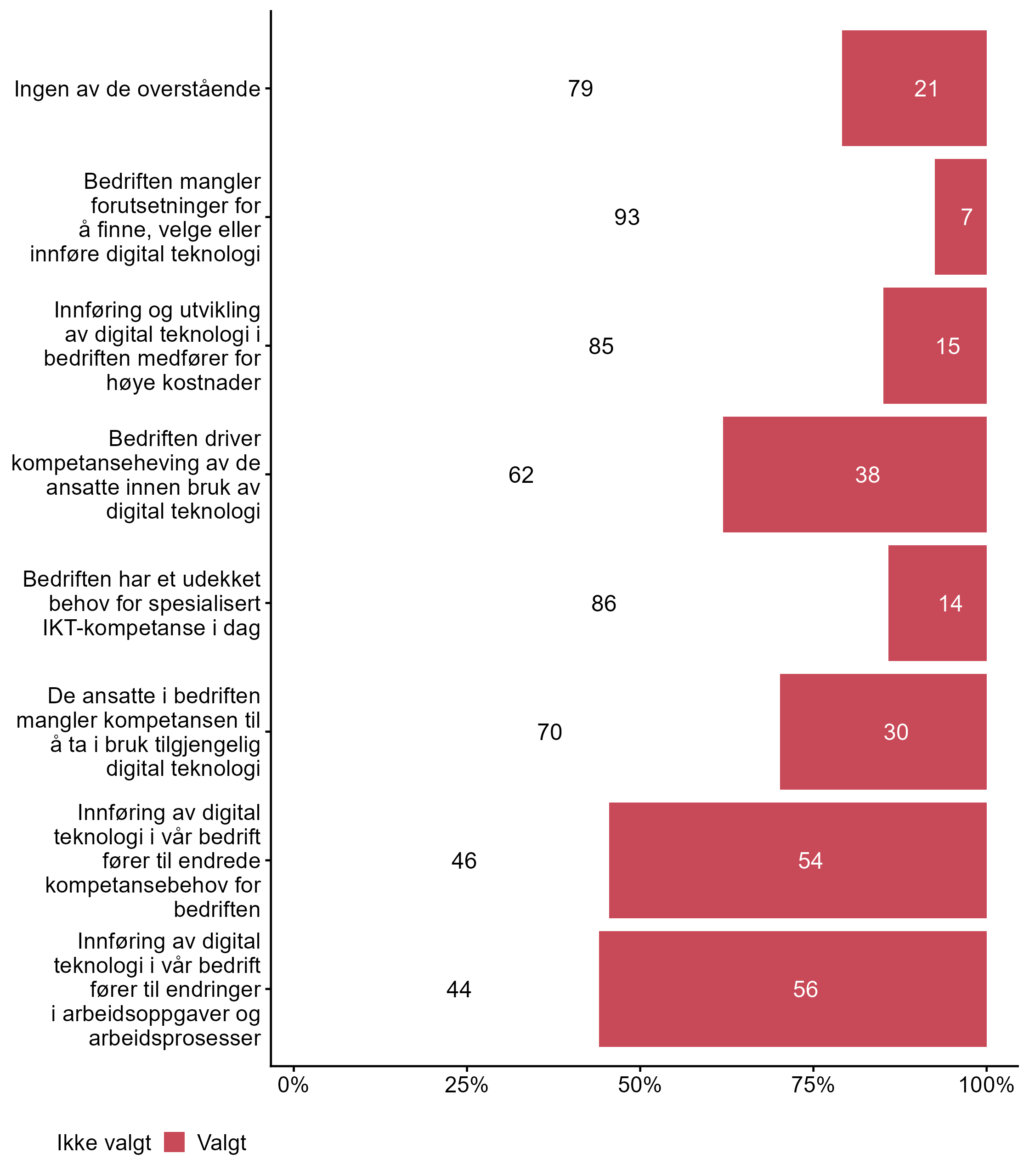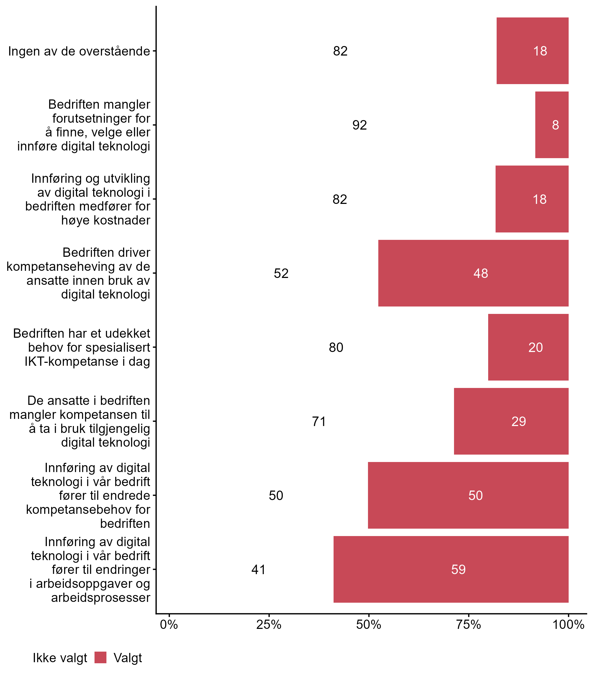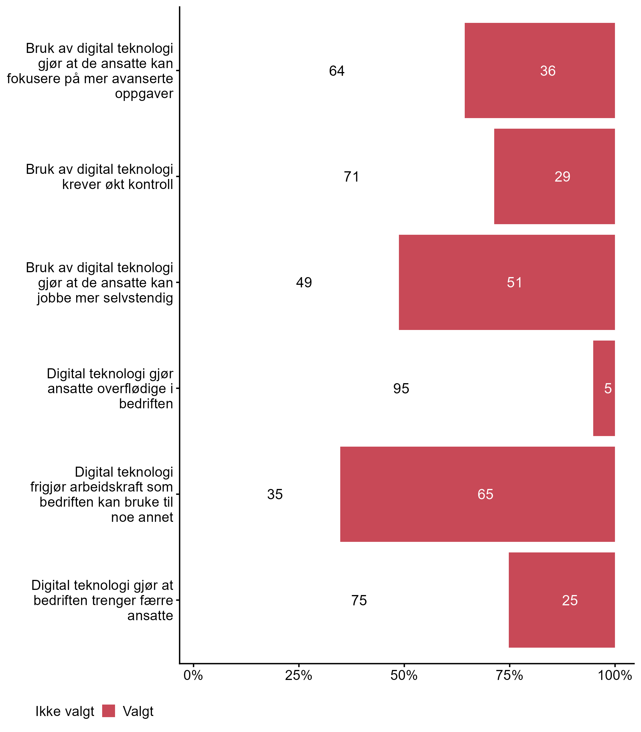 For påstanden Digital teknologi gjør at bedriften trenger færre ansatte var det flere som svarte Valgt i målgruppen (0,25) enn blant andre (0,14). For påstanden Bruk av digital teknologi gjør at de ansatte kan jobbe mer selvstendig var det færre som svarte Valgt i målgruppen (0,51) enn blant andre (0,63). For påstanden Bruk av digital teknologi krever økt kontroll var det flere som svarte Valgt i målgruppen (0,29) enn blant andre (0,18). Færre respondenter svarte Valgt for Bruk av digital teknologi gjør at de ansatte kan fokusere på mer avanserte oppgaver i målgruppen (0,36) enn i andre grupper (0,5).