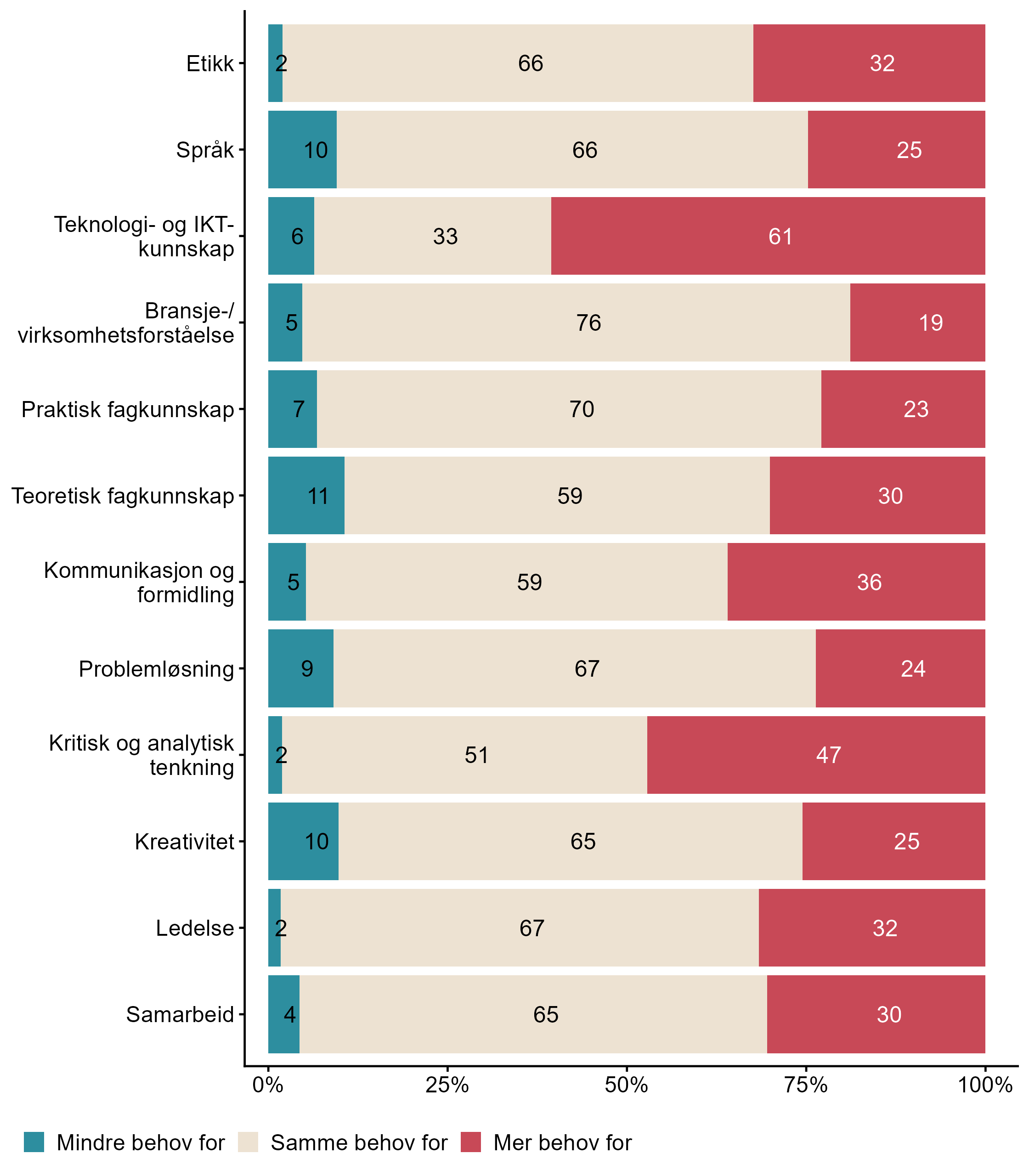 | Generativ kunstig intelligens (f.eks. produksjon av tekst, bilde, eller lignende) Spesialisert IKT-kompetanse | 65 | 35 | 31 |