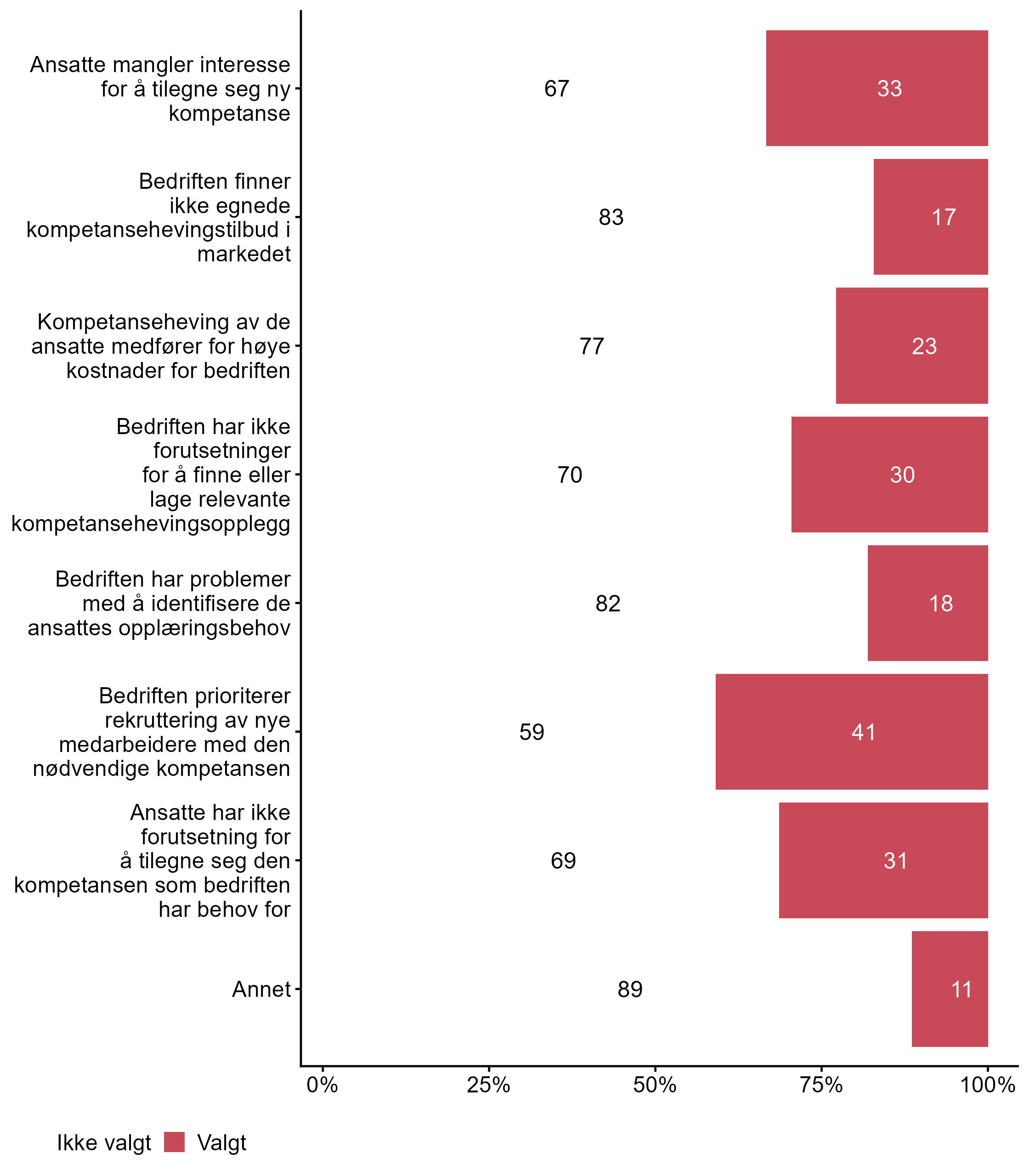 For Bedriften har ikke forutsetninger for å finne eller lage relevante kompetansehevingsopplegg har målgruppen en høyere andel respondenter (0,3) enn alle andre (0,19) som svarte Valgt.