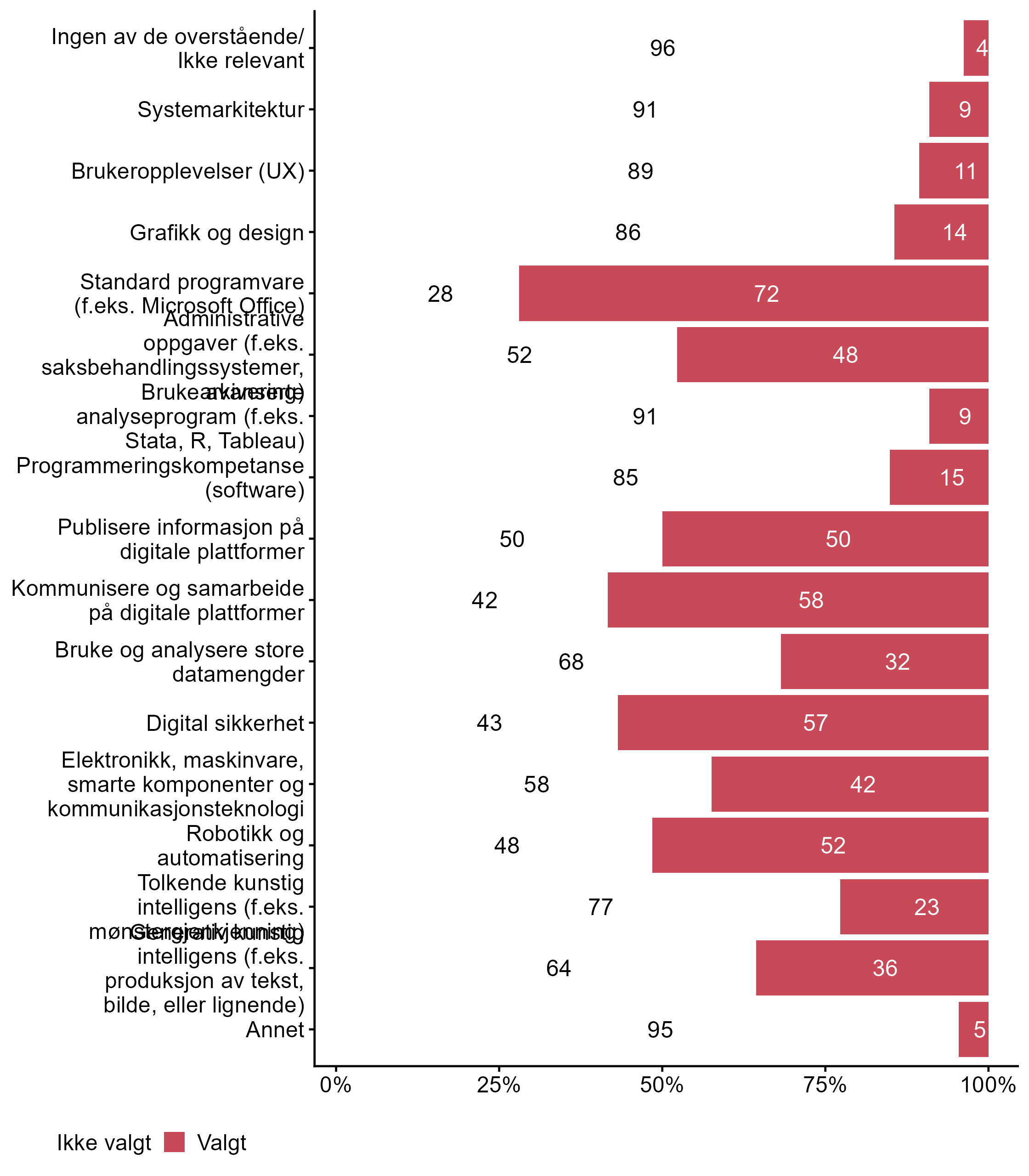 For Generativ kunstig intelligens (f.eks. produksjon av tekst, bilde, eller lignende) har målgruppen en lavere andel respondenter (0,36) enn alle andre (0,48) som svarte Valgt. For påstanden Robotikk og automatisering var det flere som svarte Valgt i målgruppen (0,52) enn blant andre (0,34). Færre respondenter svarte Valgt for Kommunisere og samarbeide på digitale plattformer i målgruppen (0,58) enn i andre grupper (0,7). Færre respondenter svarte Valgt for Publisere informasjon på digitale plattformer i målgruppen (0,5) enn i andre grupper (0,62). Færre respondenter svarte Valgt for Programmeringskompetanse (software) i målgruppen (0,15) enn i andre grupper (0,26). Færre respondenter svarte Valgt for Grafikk og design i målgruppen (0,14) enn i andre grupper (0,28).