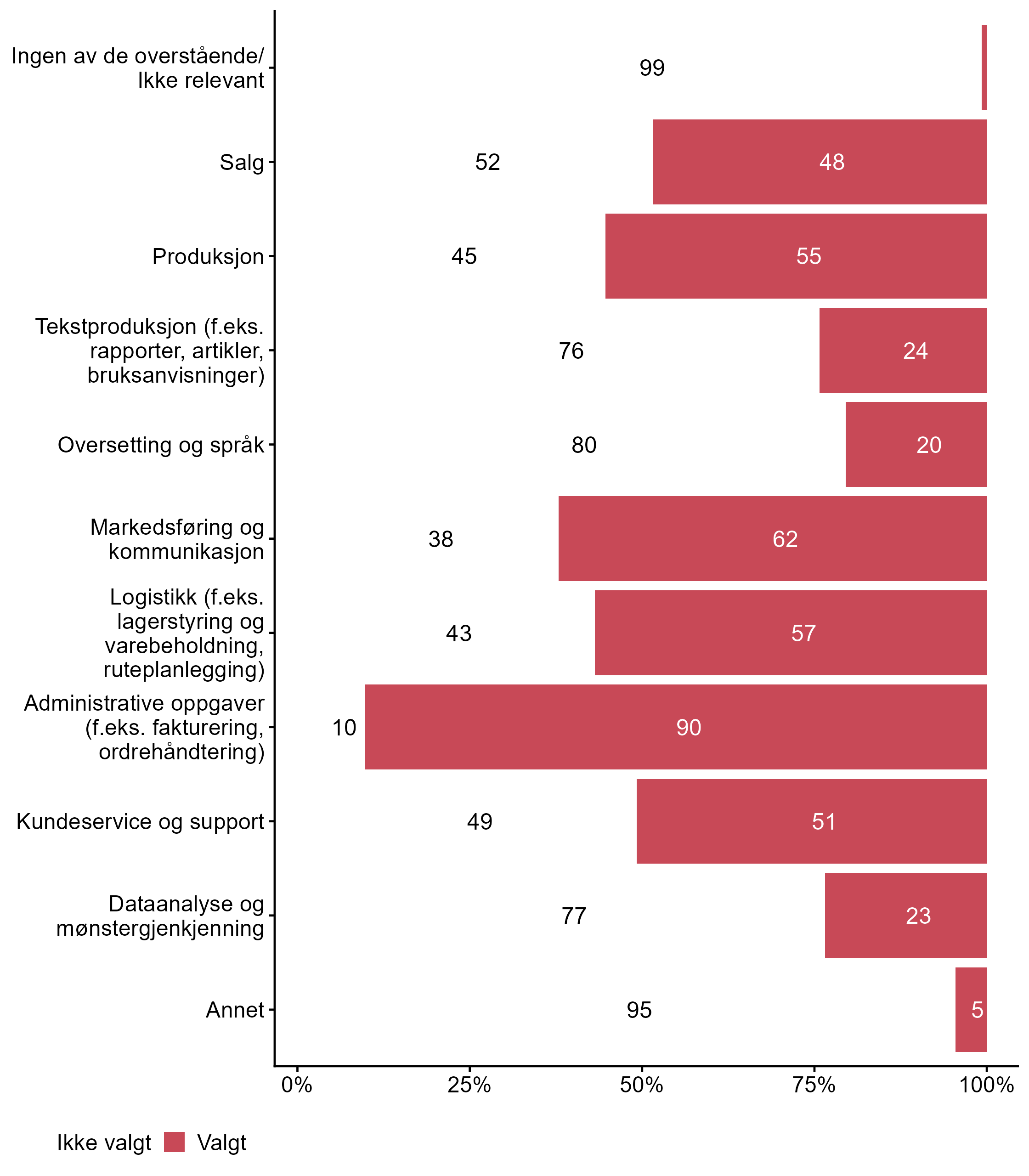 | .variable_label | Ikke valgt (%) | Valgt (%) | Totalt (N) |