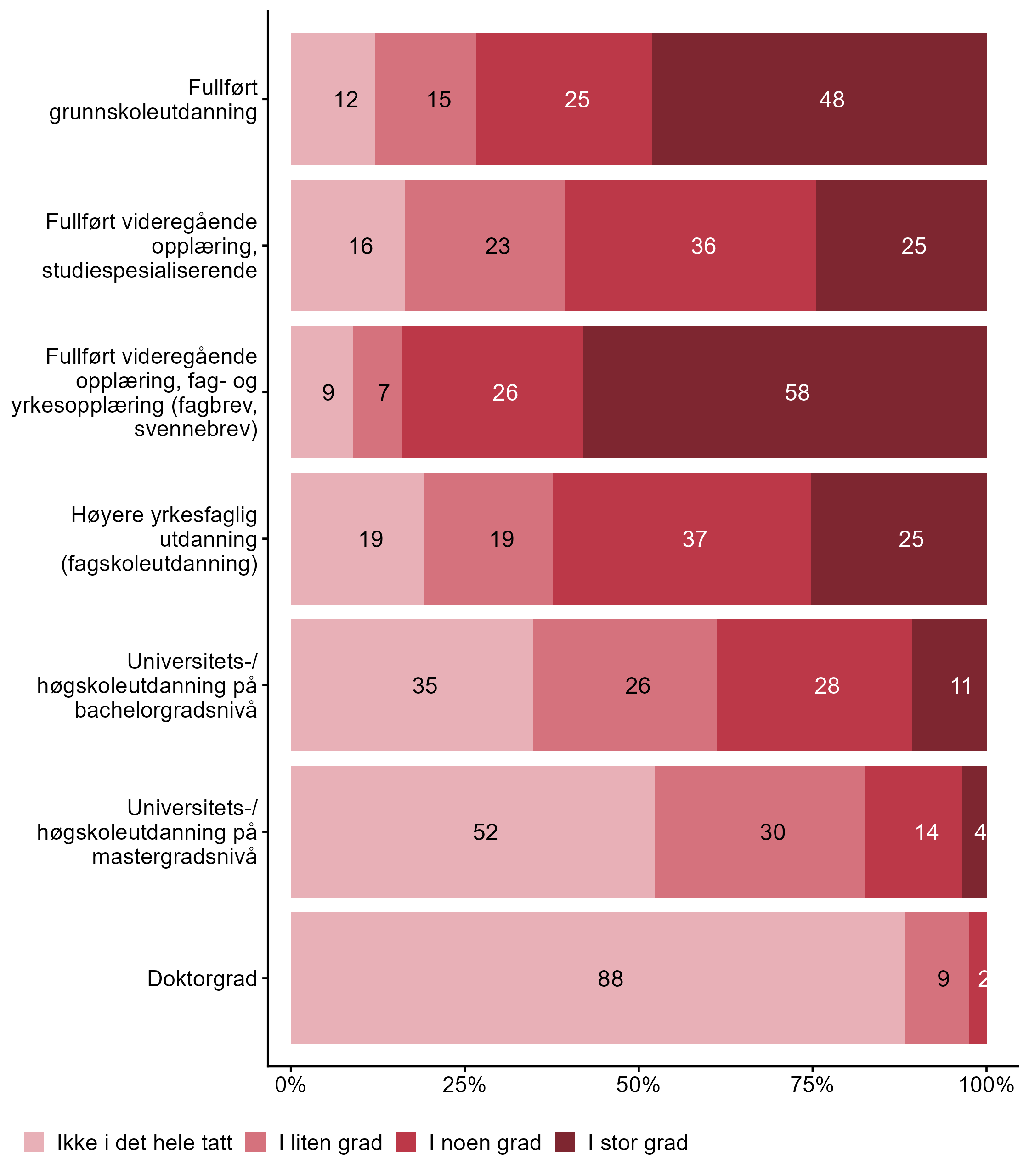 For påstanden Doktorgrad var det færre som svarte I liten grad eller I noen grad i målgruppen (0,12) enn blant andre (0,28). Færre respondenter svarte I noen grad eller I stor grad for Universitets-/høgskoleutdanning på mastergradsnivå i målgruppen (0,17) enn i andre grupper (0,53). For påstanden Universitets-/høgskoleutdanning på bachelorgradsnivå var det færre som svarte I noen grad eller I stor grad i målgruppen (0,39) enn blant andre (0,67). For Fullført videregående opplæring, studiespesialiserende har målgruppen en høyere andel respondenter (0,6) enn alle andre (0,37) som svarte I noen grad eller I stor grad. For påstanden Fullført grunnskoleutdanning var det flere som svarte I noen grad eller I stor grad i målgruppen (0,73) enn blant andre (0,45).