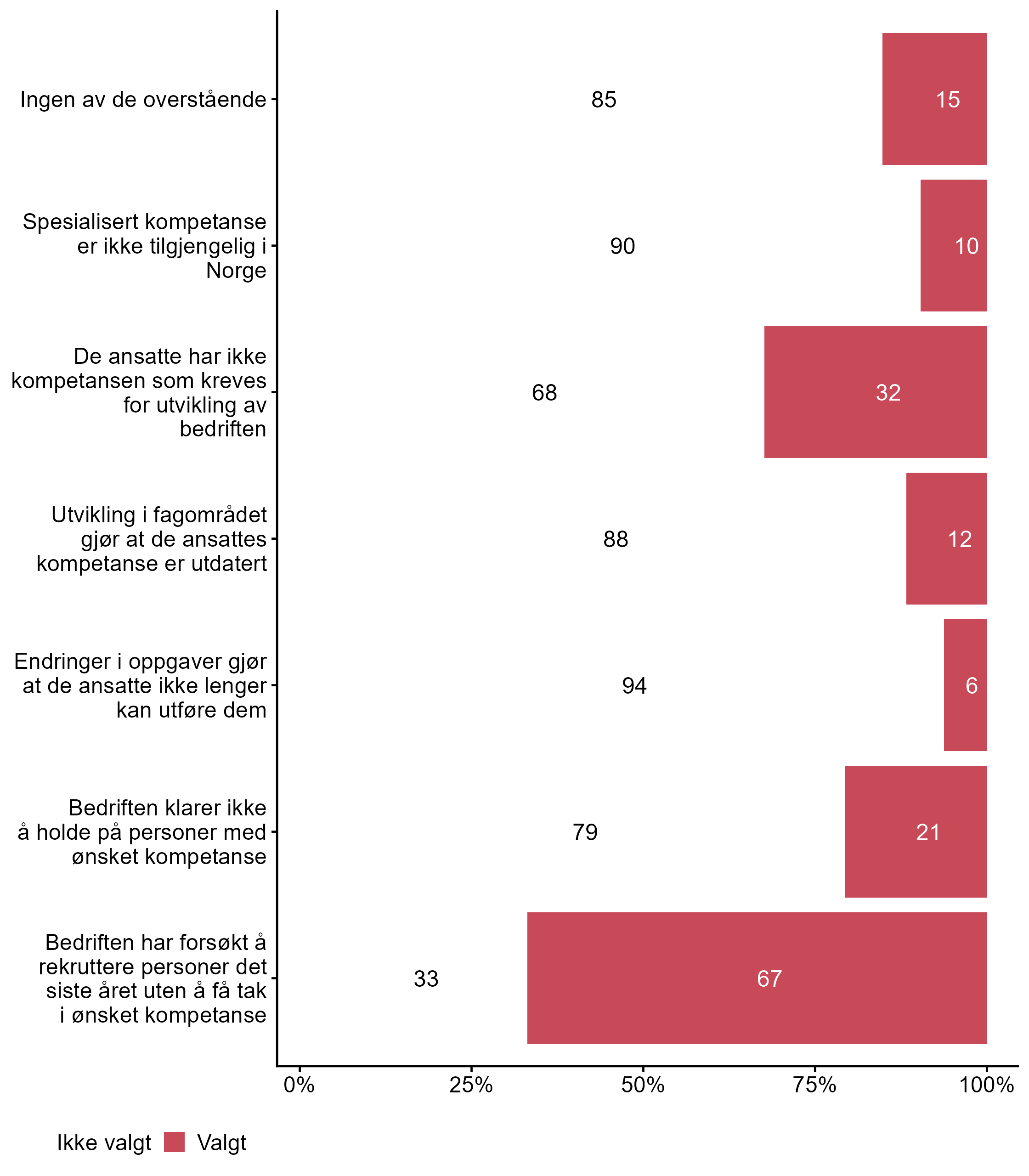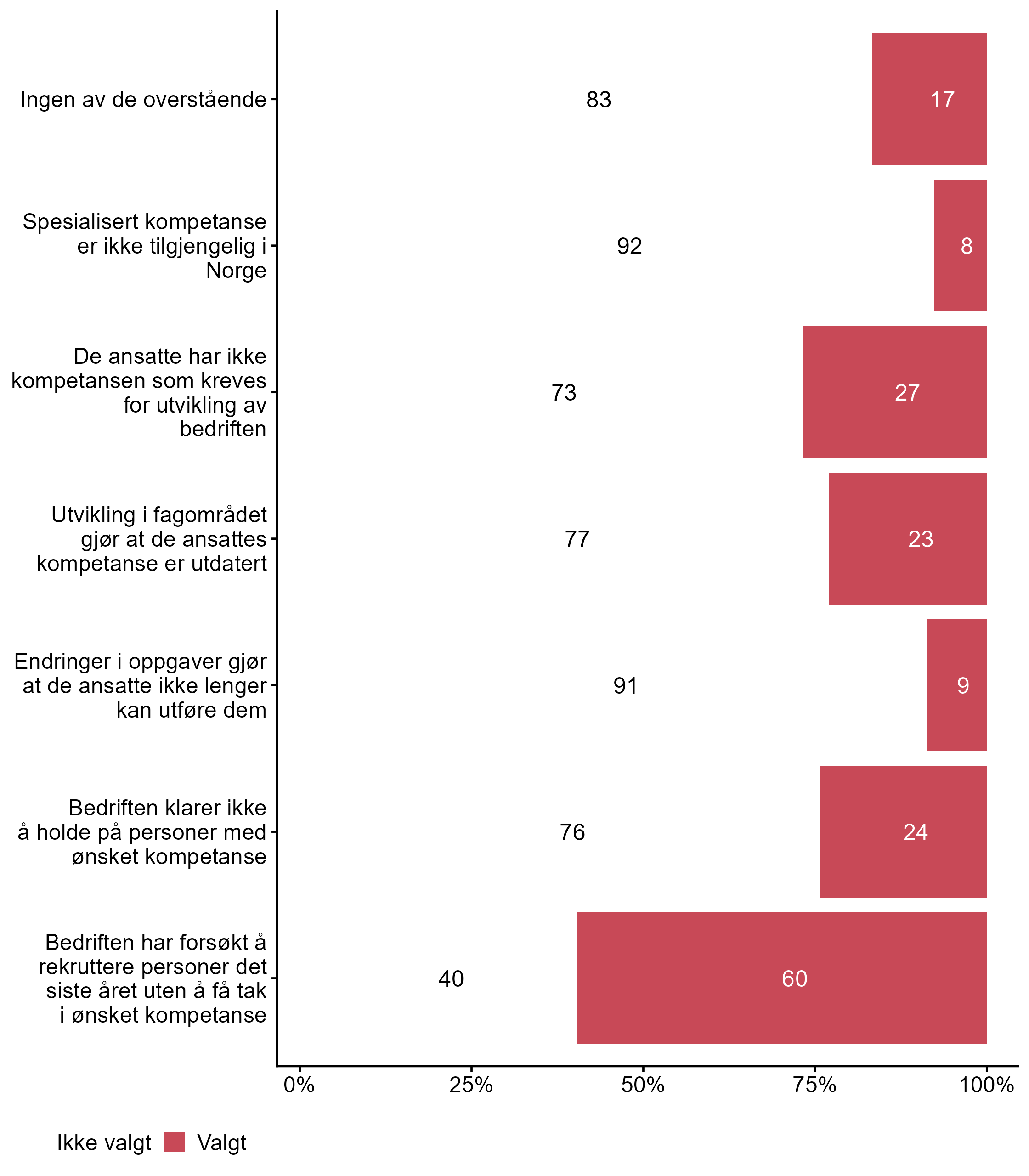 I dette kapittelet kan du sammenligne NHO Reiseliv med andre bedrifters svar på spørsmål om kompetansebehov. Dette inkluderer i hvilken grad bedriften har behov for kompetanse innen spesifikke fagområder og utdanningsnivåer, samt årsaker til, og konsekvenser av, kompetansebehovet, og hvilke tiltak bedriften har for å dekke kompetansebehovet.