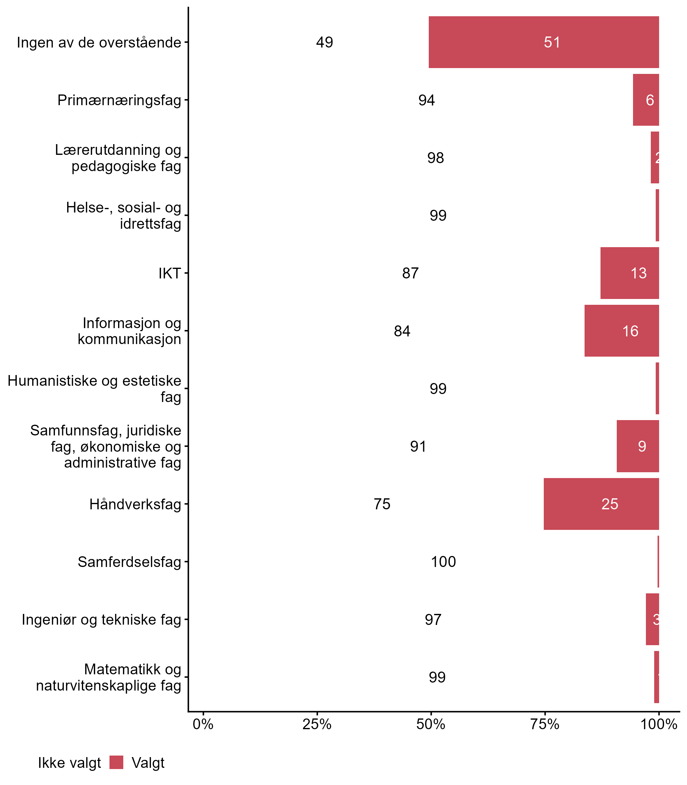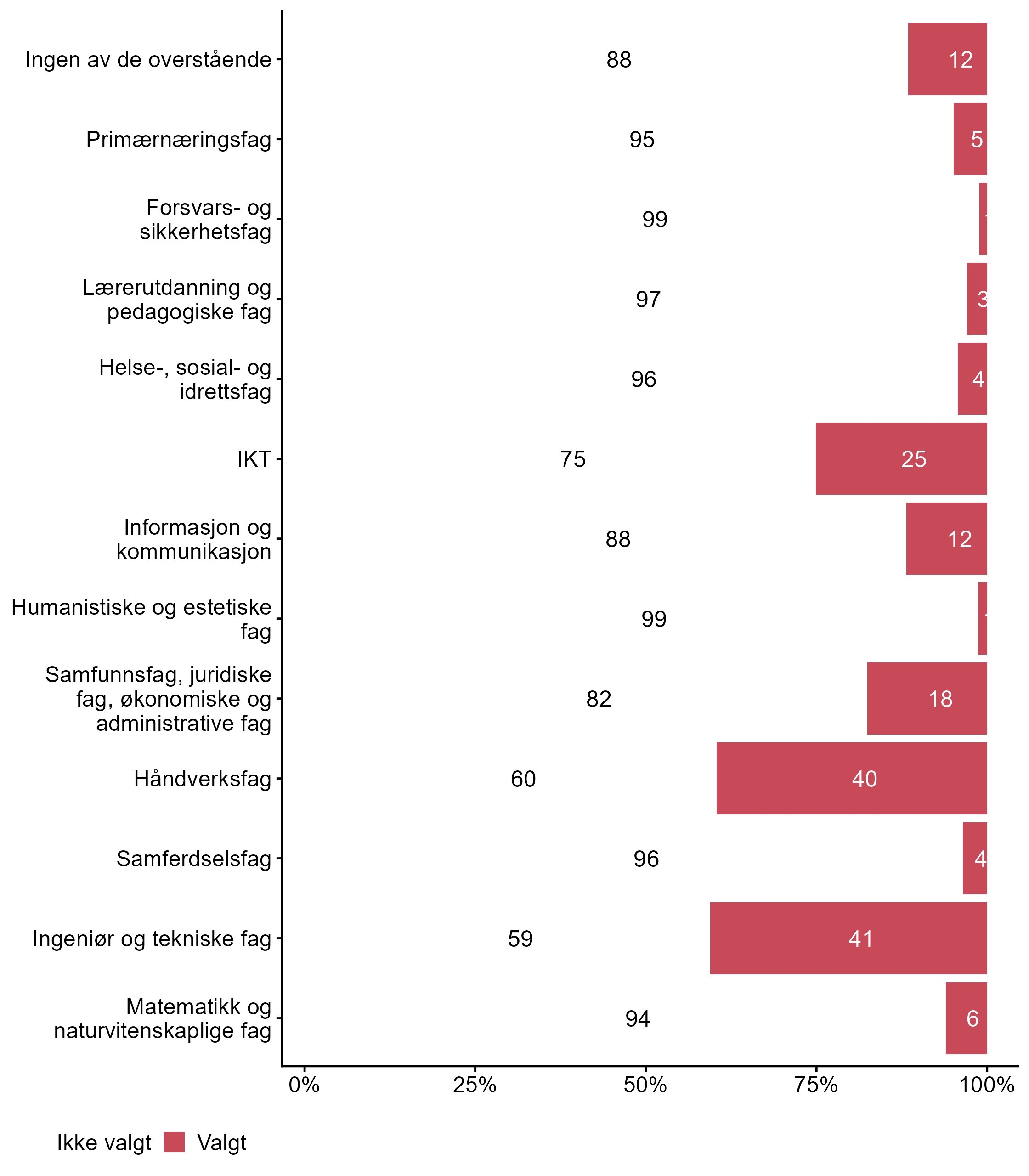 For påstanden Ingeniør og tekniske fag var det færre som svarte Valgt i målgruppen (0,03) enn blant andre (0,41). For Håndverksfag har målgruppen en lavere andel respondenter (0,25) enn alle andre (0,4) som svarte Valgt. Færre respondenter svarte Valgt for IKT i målgruppen (0,13) enn i andre grupper (0,25). Flere respondenter svarte Valgt på Ingen av de overstående i målgruppen (0,51) enn for alle andre (0,12).
